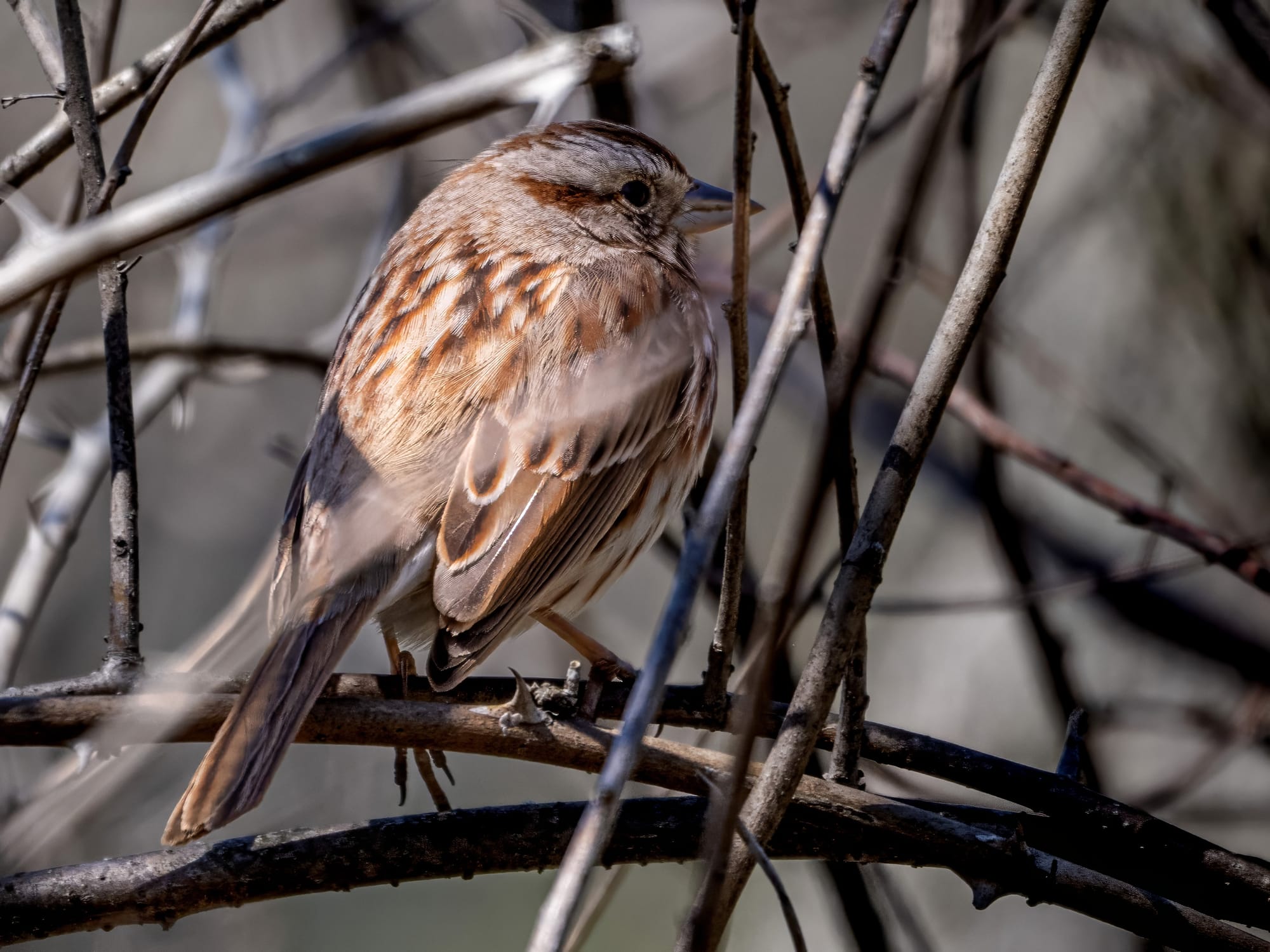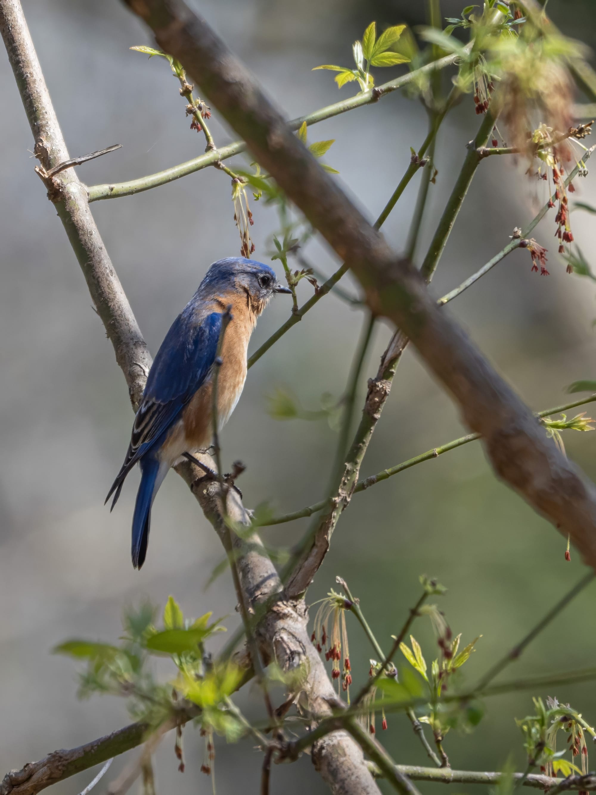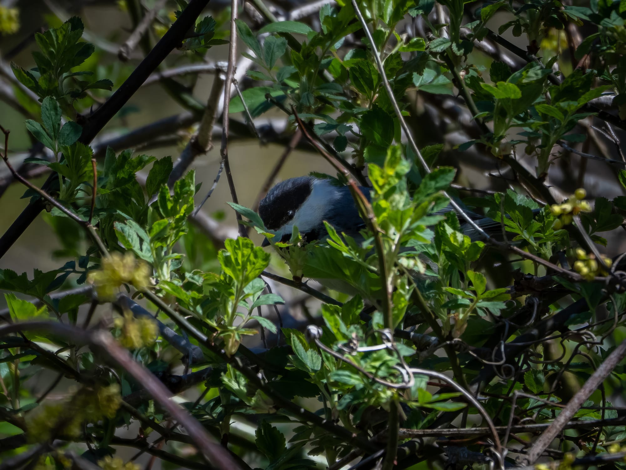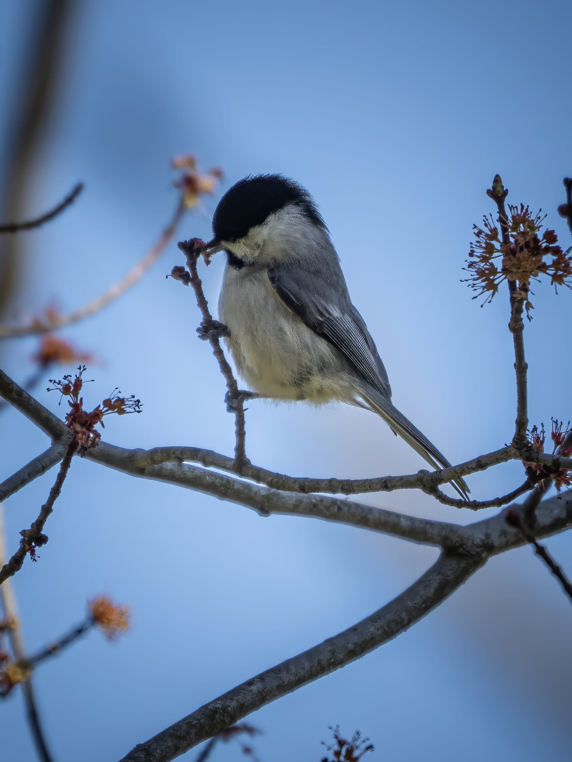 Carolina Chickadees are fast, suspicious, and usually try to keep some foliage between themselves and the camera. I managed to catch one unawares as they enjoyed some maple flowers.