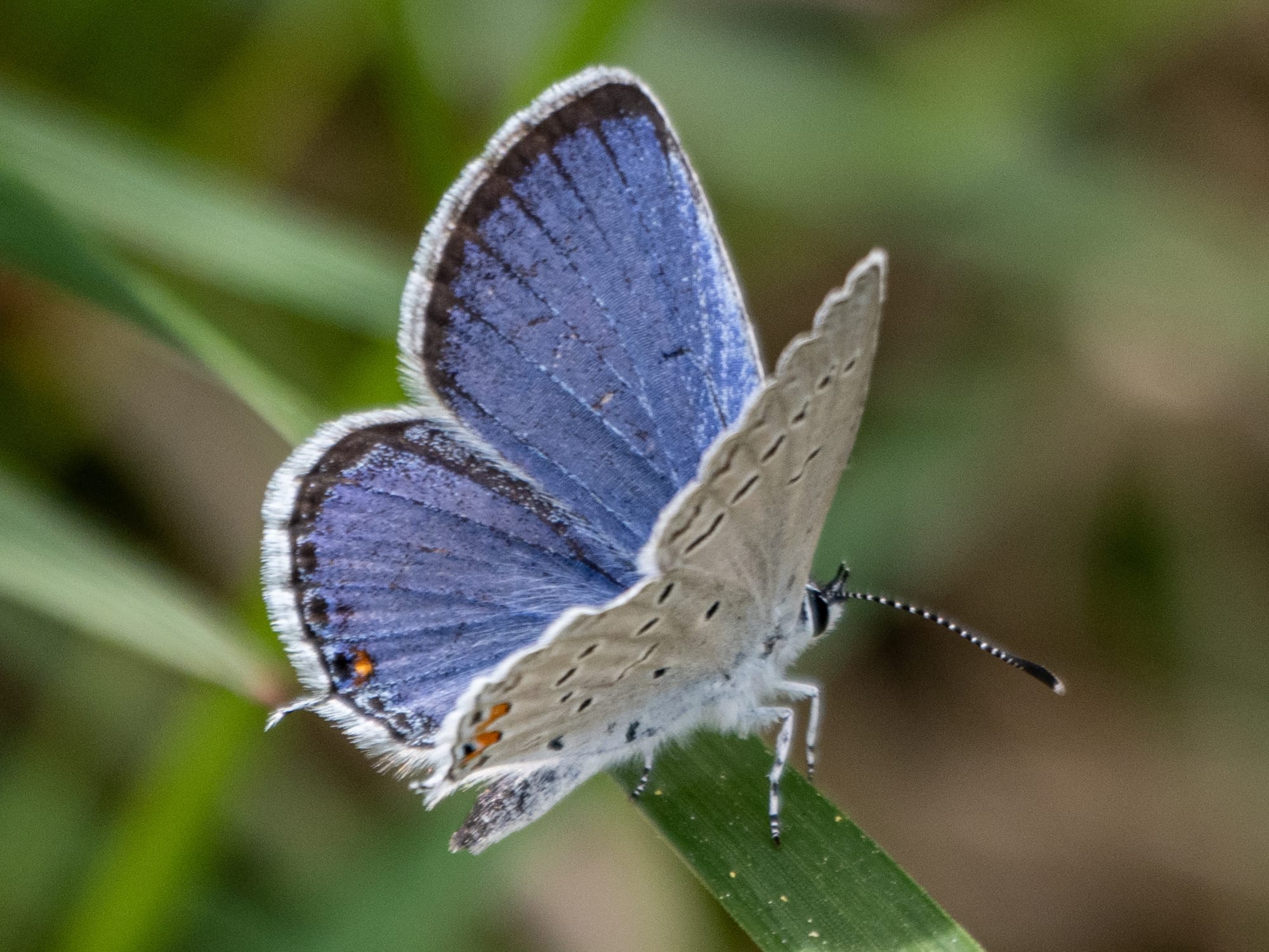The tiny (wingspan of an inch or so) Eastern-tailed Blue Butterfly has interesting defense markings, the tails on the hindwing imitate antennas to confuse birds or jumping spiders who may lunge at what they think is the head of the butterfly allowing it to escape.