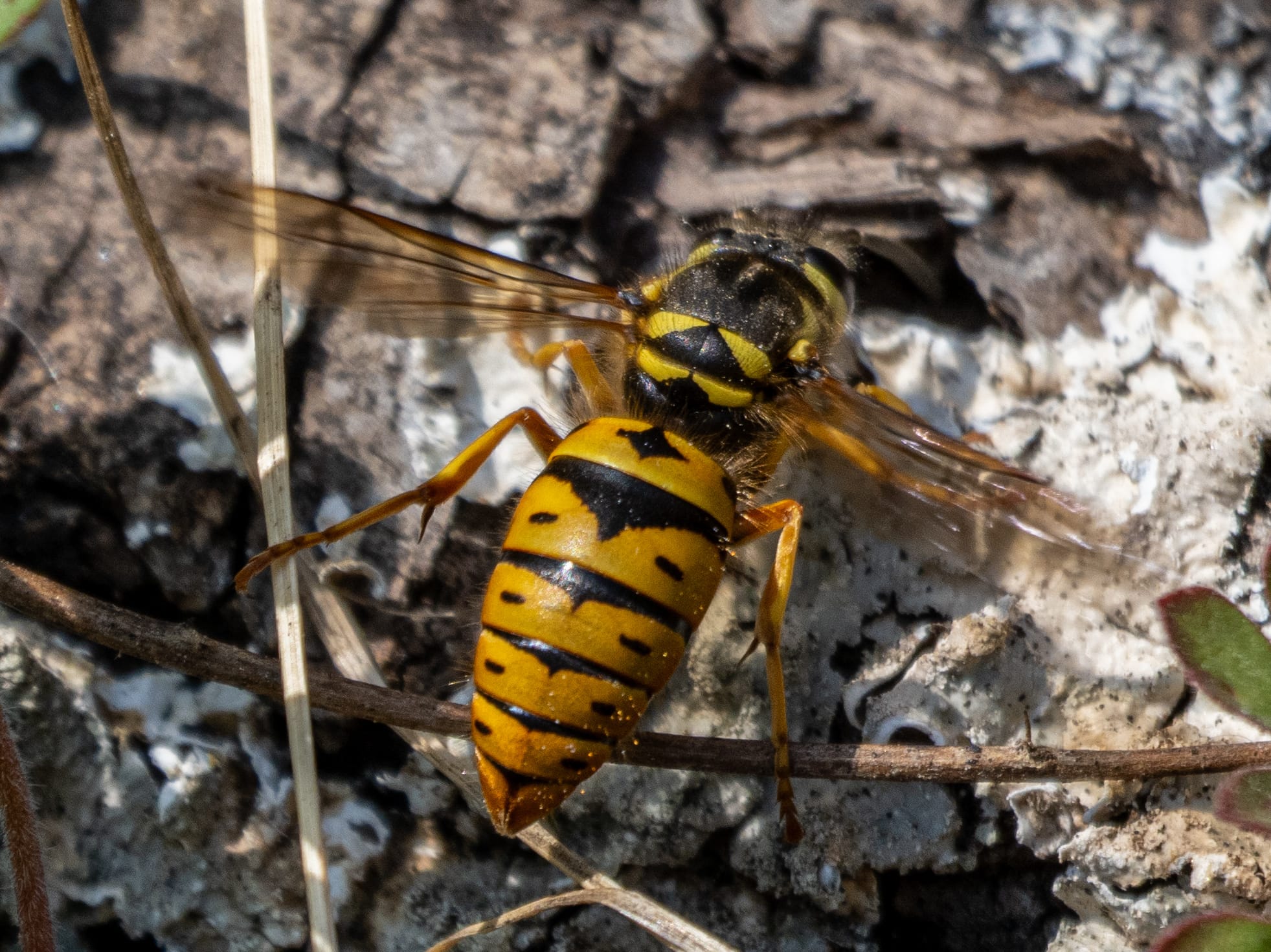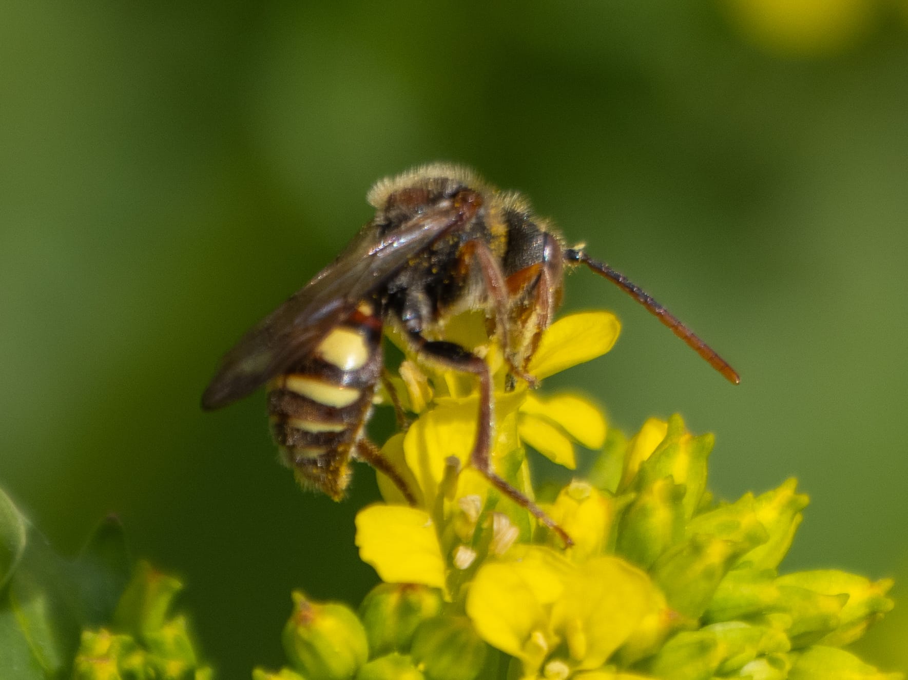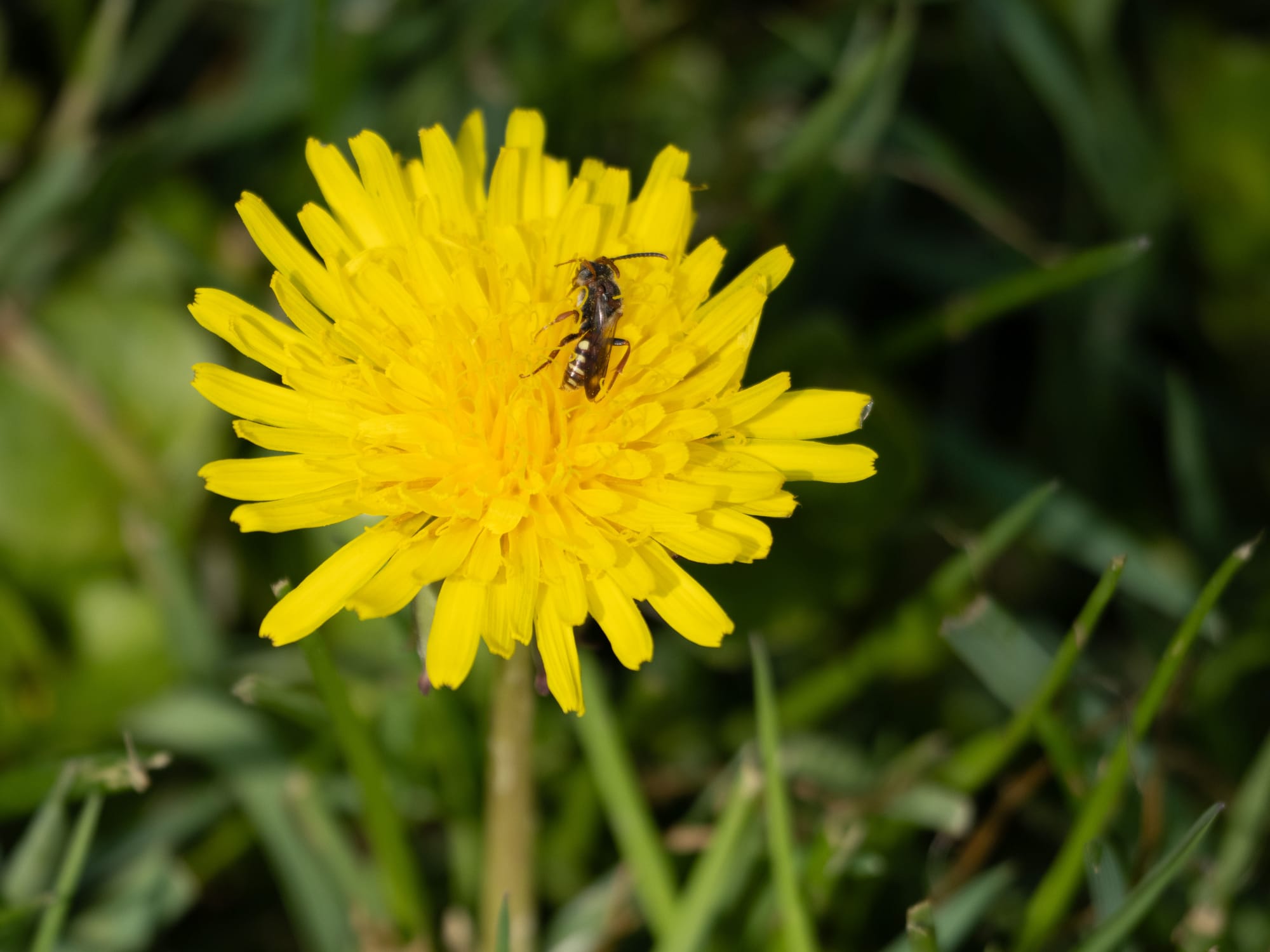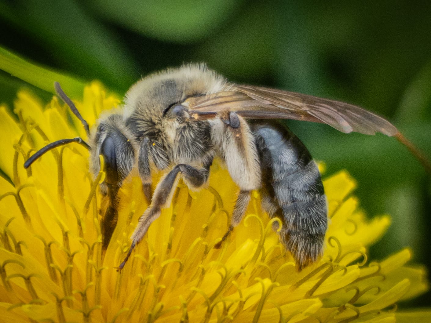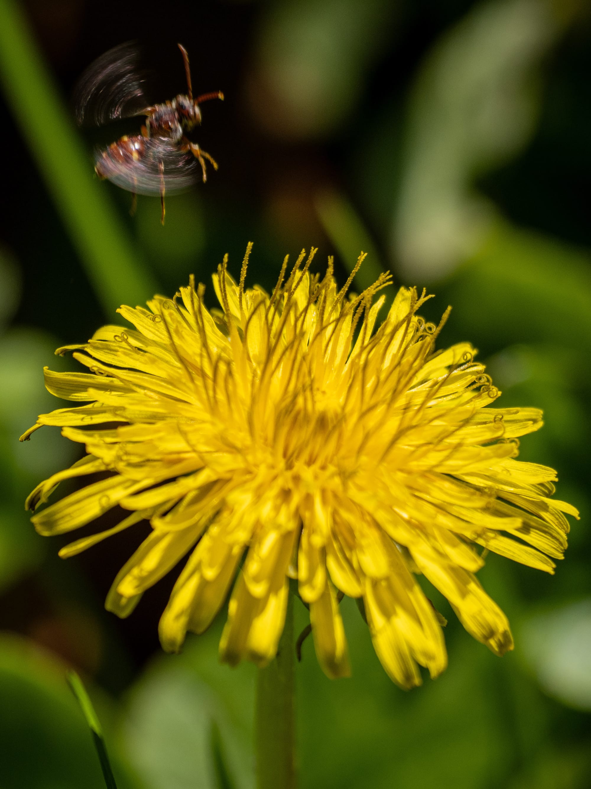 Barbara's Mining Bee, Bee in the Nomad family, and another Nomad Bee in a dandelion for scale - they are very tiny, Eastern Yellowjacket (first wasp of the spring for me)