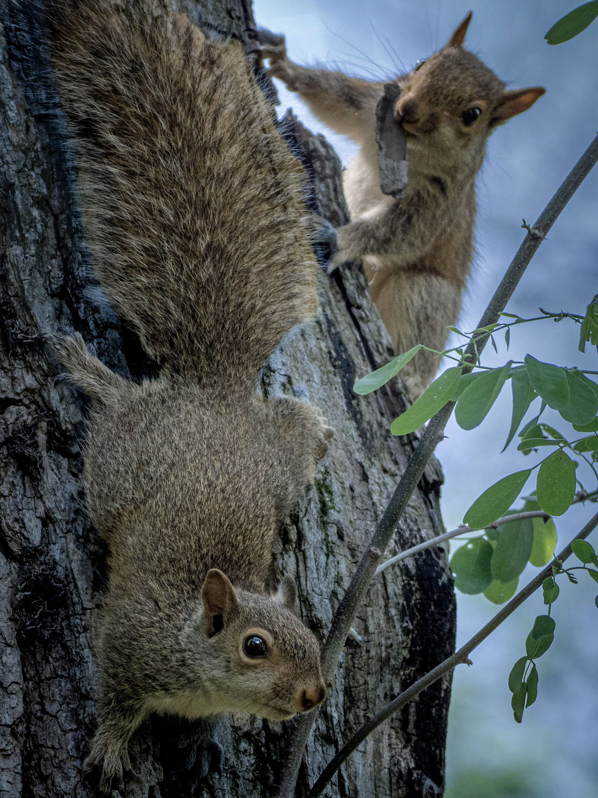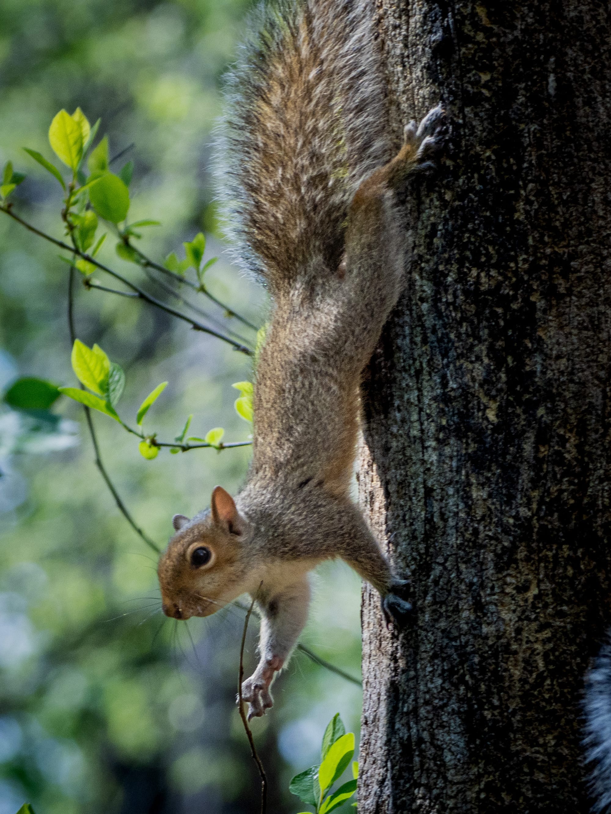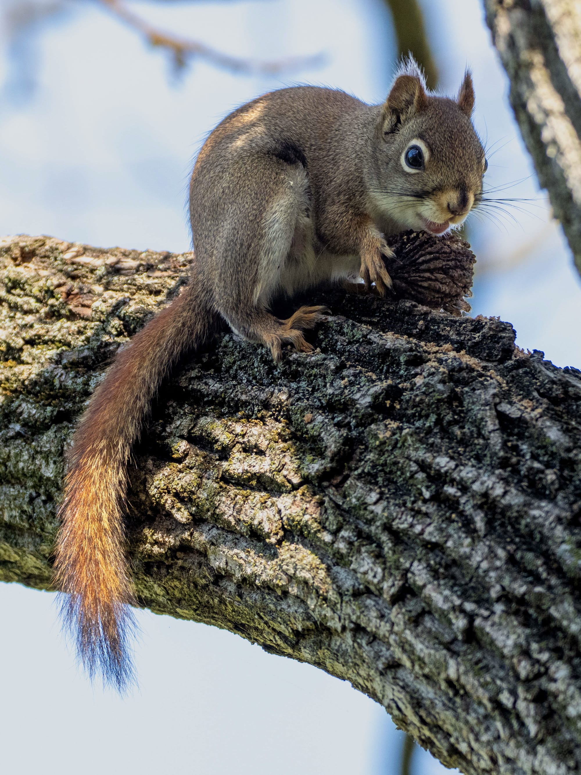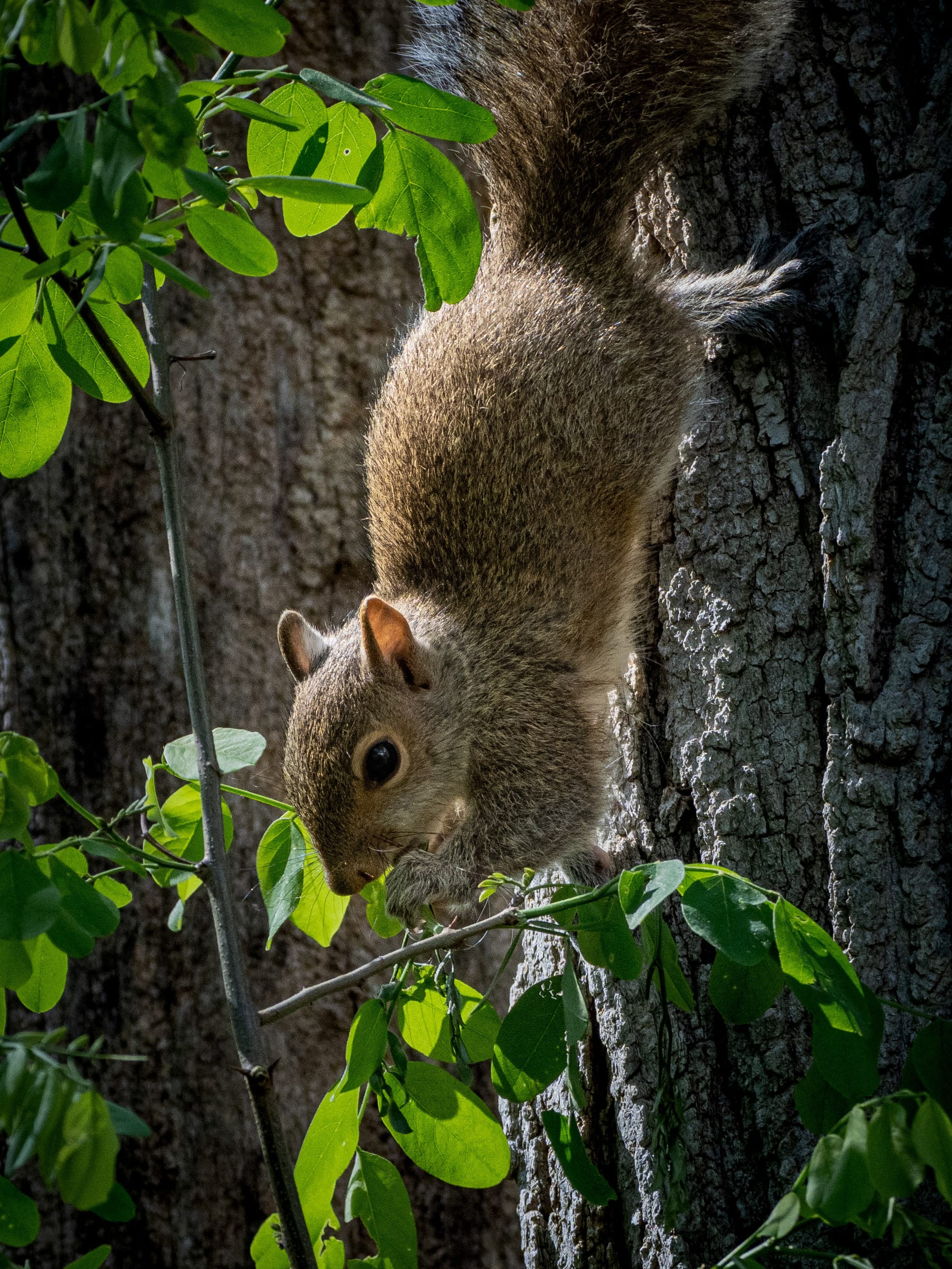 The first three photos are young Gray Squirrels who were browsing on the new shoots and leaves of a locust tree. A Red Squirrel with (you guessed it!) a black walnut.