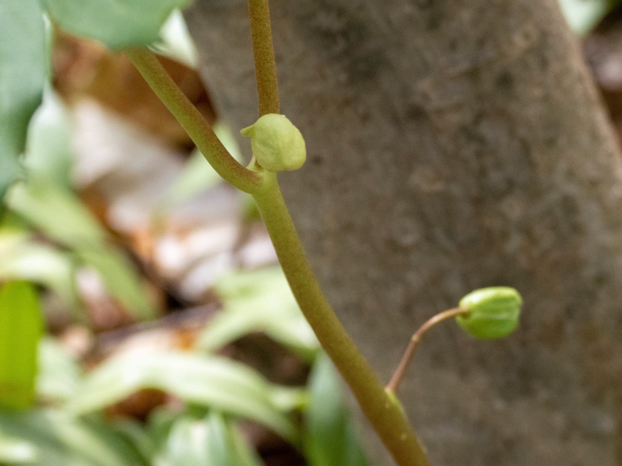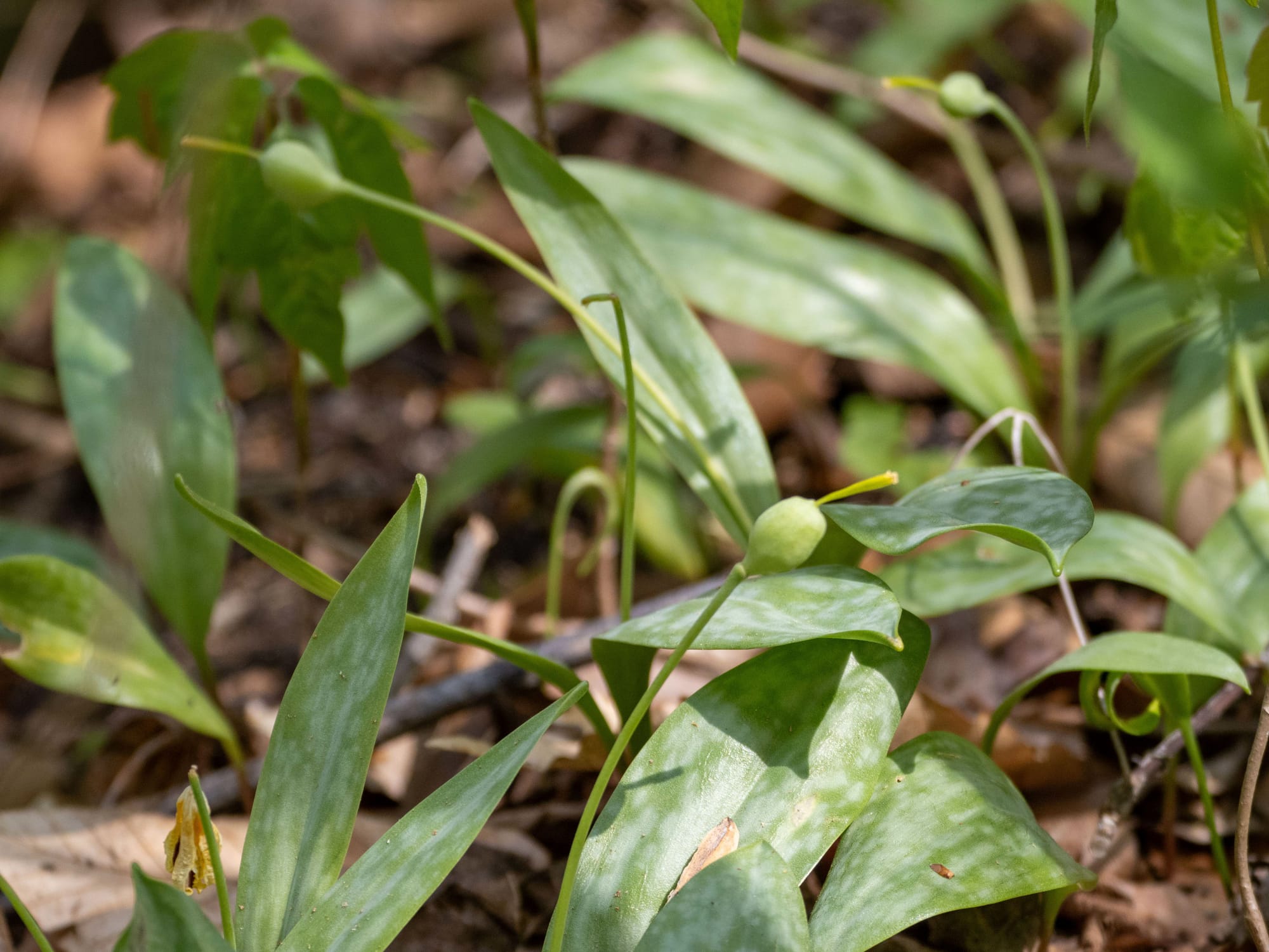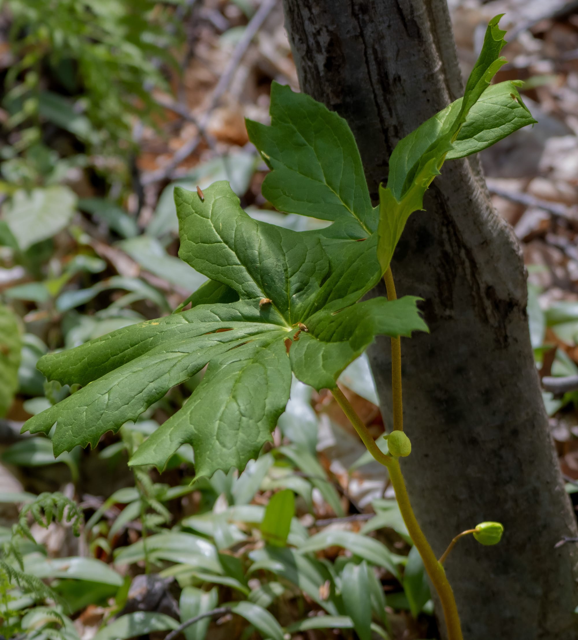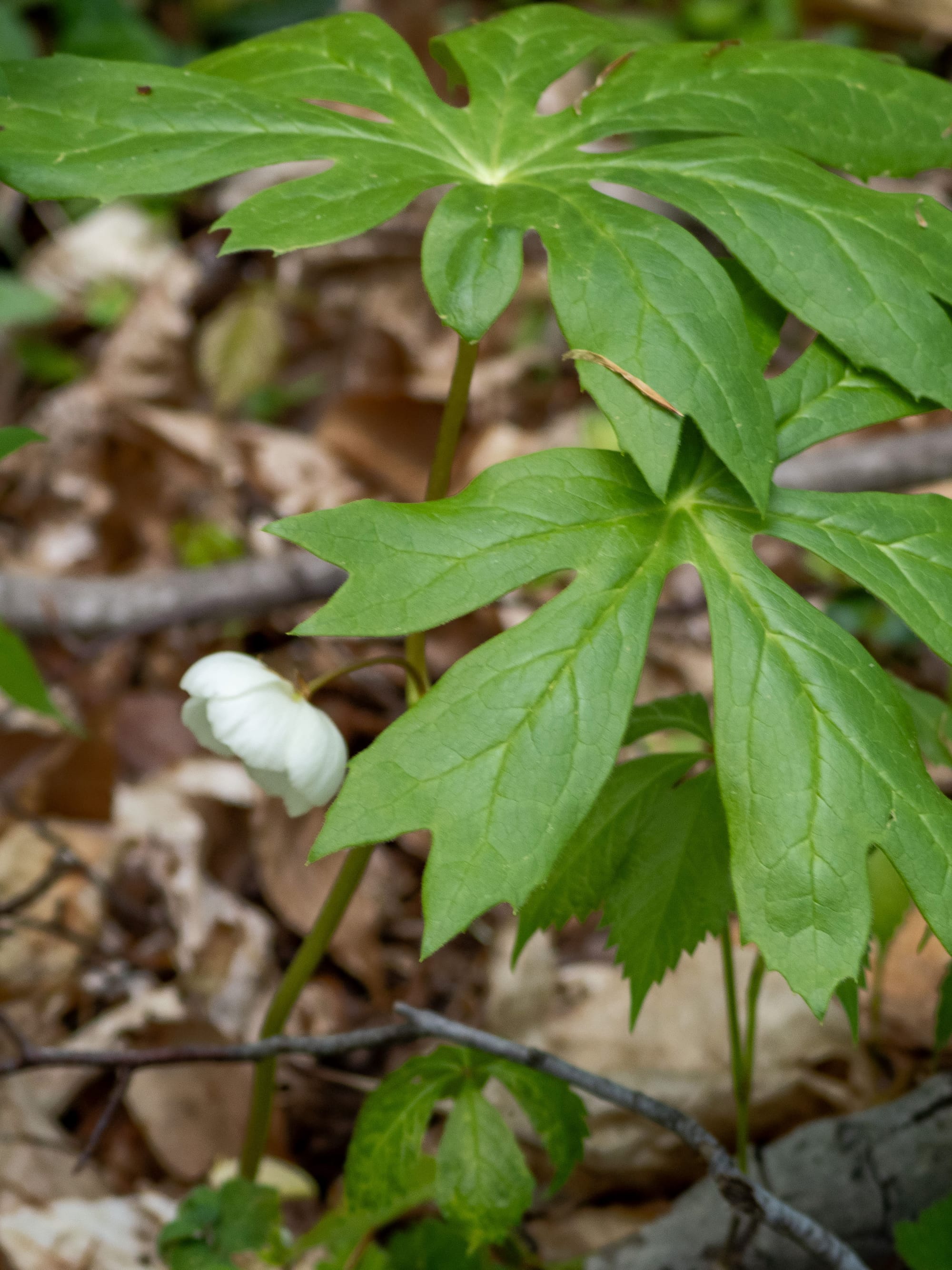 This mayapple has two flower bids, one at the juncture of the two leaf stems as you'd expect, and another growing from the stalk. Never seen this before.