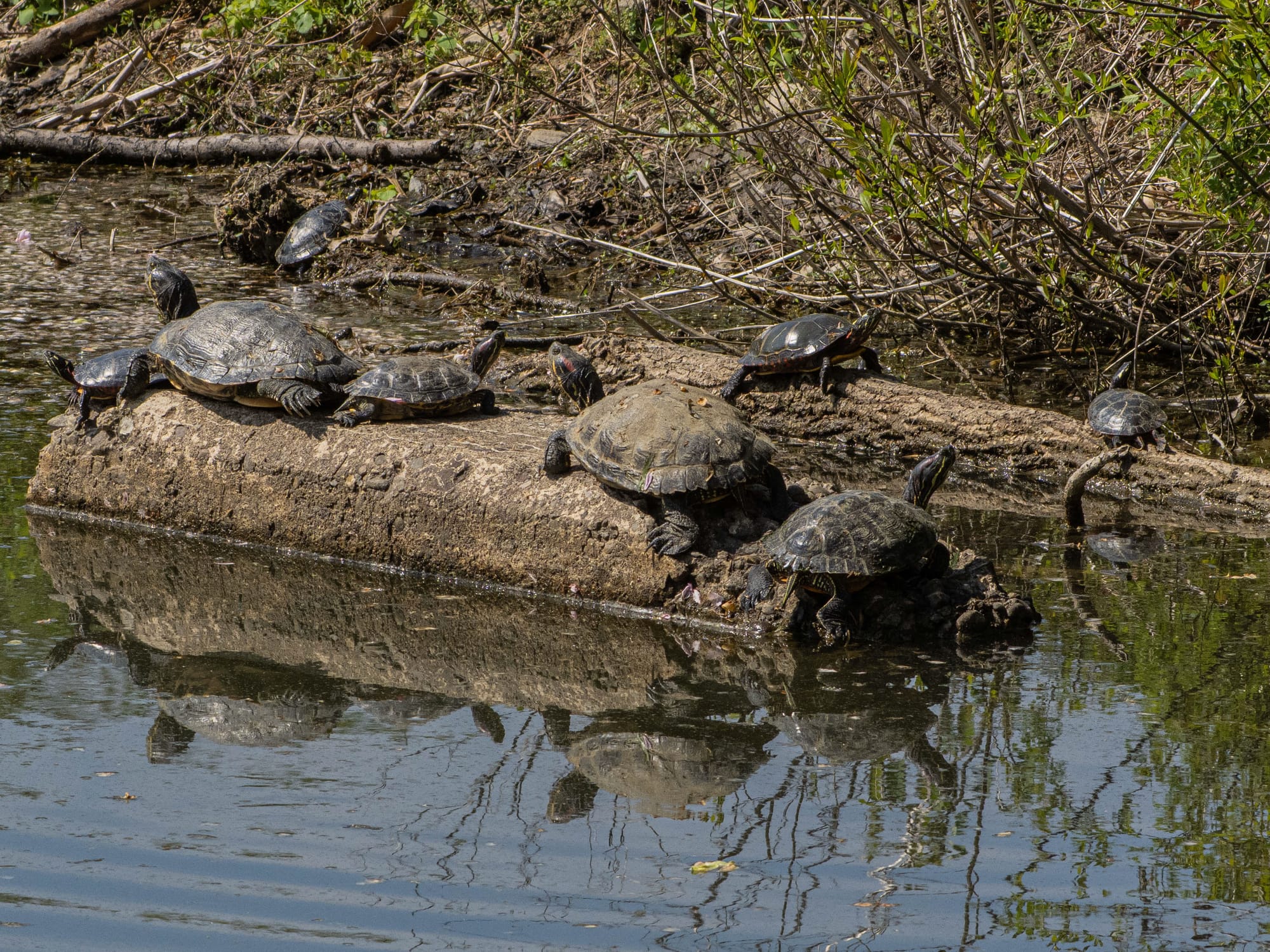 Early spring basking spots fill up early as demonstrated by these Red-eared Sliders, Pond Sliders and Painted turtles. The next two are Eastern Musk turtles