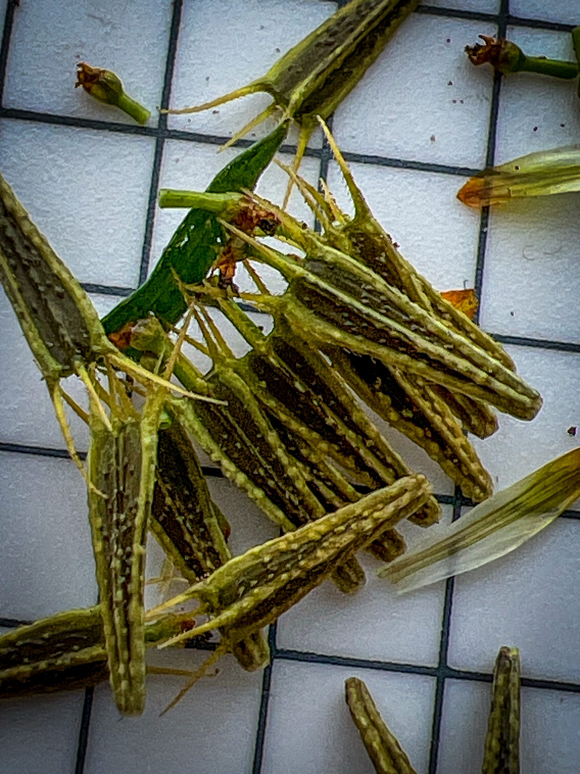 Lance-shaped leaves with a long bristle at the tip and a fringed, hairy sheath at the base of each leaf, small pink flowers in spikes. Hard not to find this one, it is everywhere!