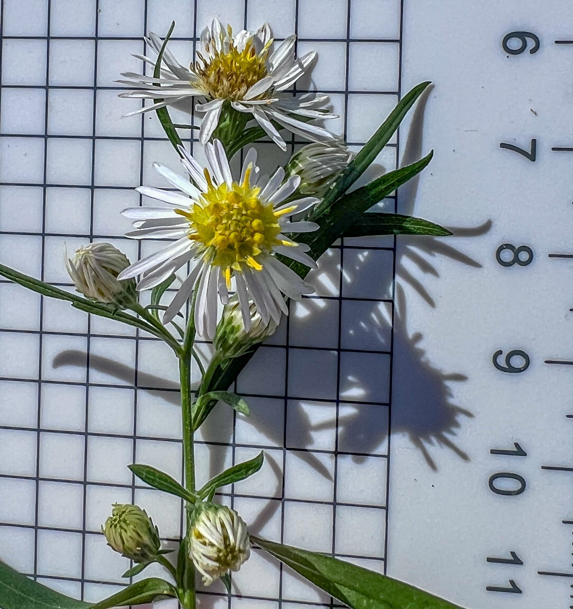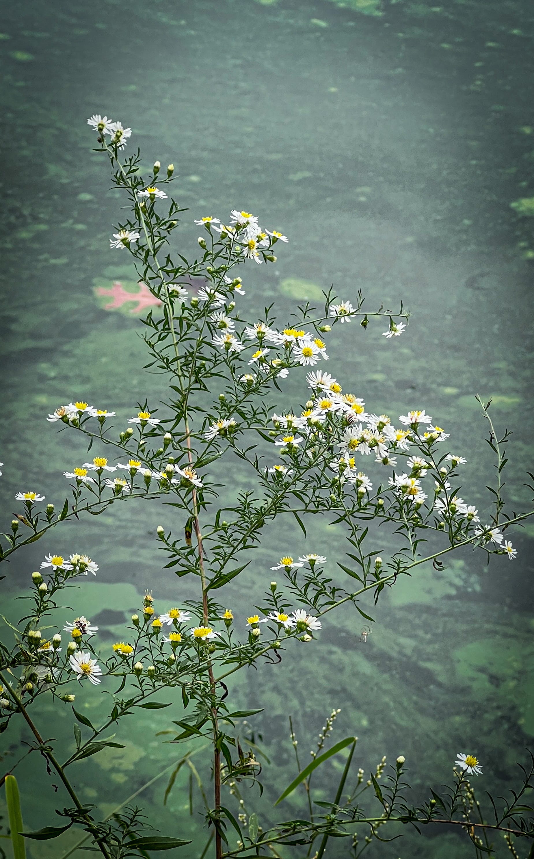 The smallest white flowers of the asters at the pond. Yellow flower centers that turn deep reddish-purple, arranged along the sides of arching stems (not just at the top). Leaves are narrower and less hairy. Shorter and often smaller plant than panicled or oldfield aster.