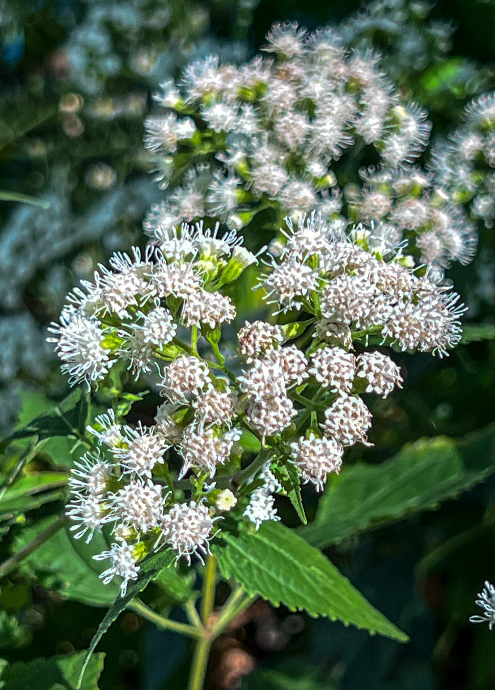 Distinctive fluffy white flower clusters with no petals and toothed opposite leaves, grows in shady spots. Poisonous to livestock but harmless to touch.