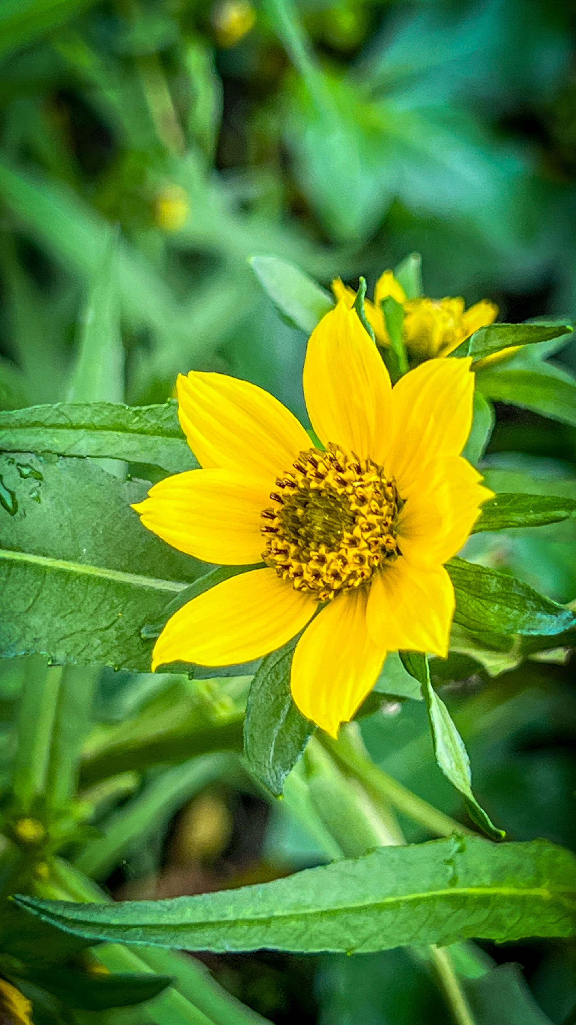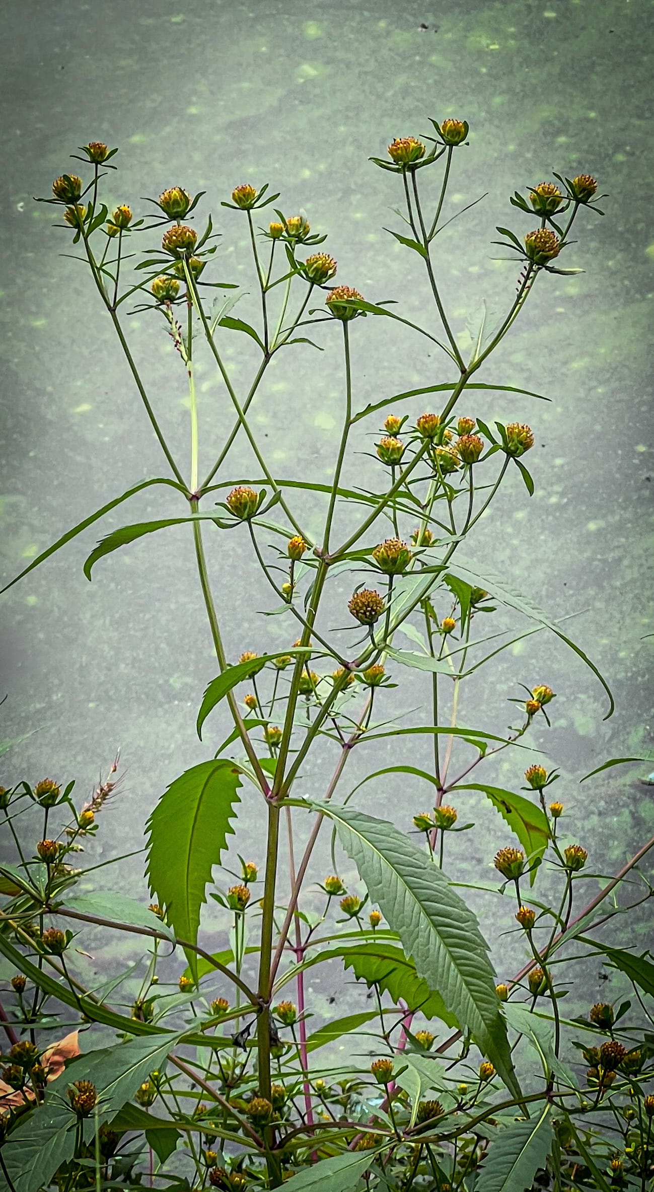 Purplish stems, toothed opposite leaves, and small yellow flower heads, often with few or no petals. These grow right at the water's edge. The seeds have tiny barbs that stick to clothing and animal fur.