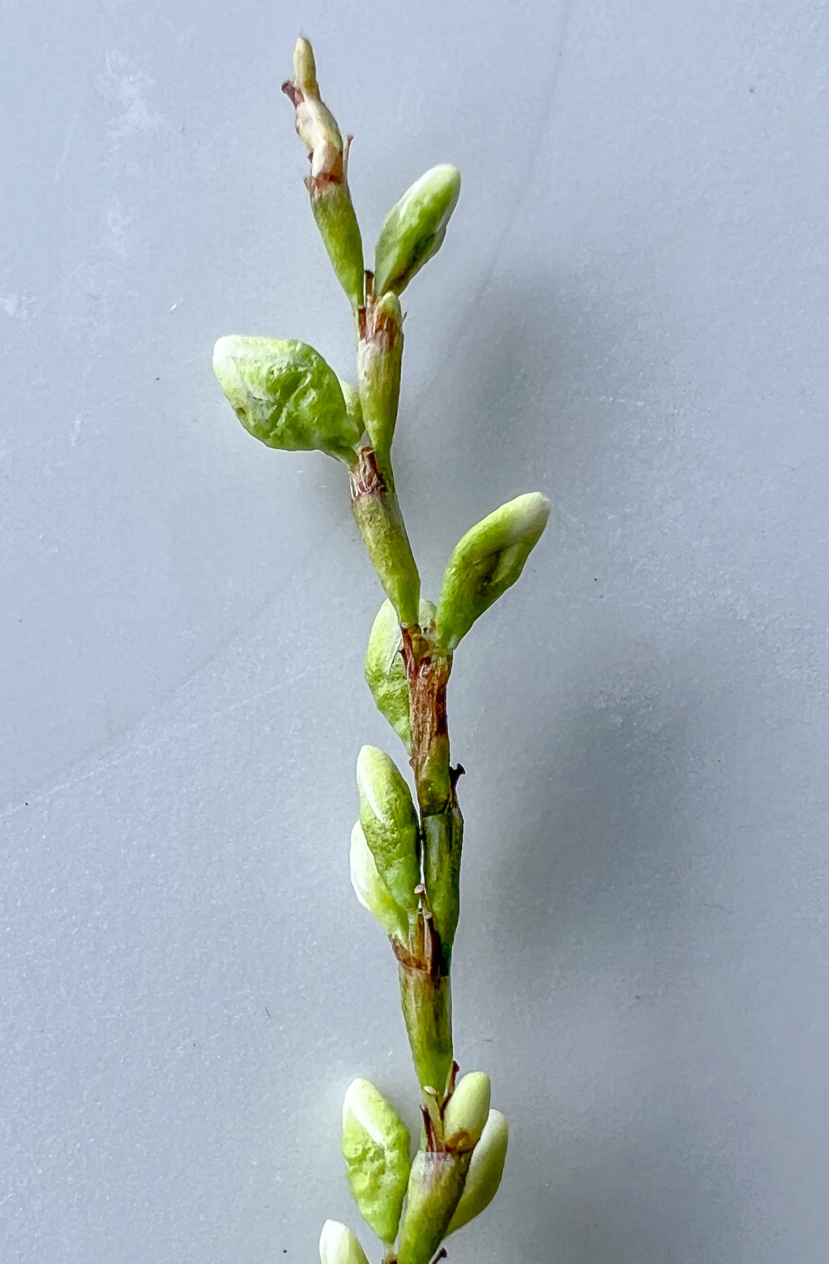 The smartweeds and tearthumbs are members of the Buckwheat Family (Polygonaceae) with simple flower spikes. Polygonaceae is also from Greek; poly for many and goni for knee or joint. Plants in this family have distinct joints or nodes on the stem. They have tiny flowers on spikes, often in pink or pale shades.