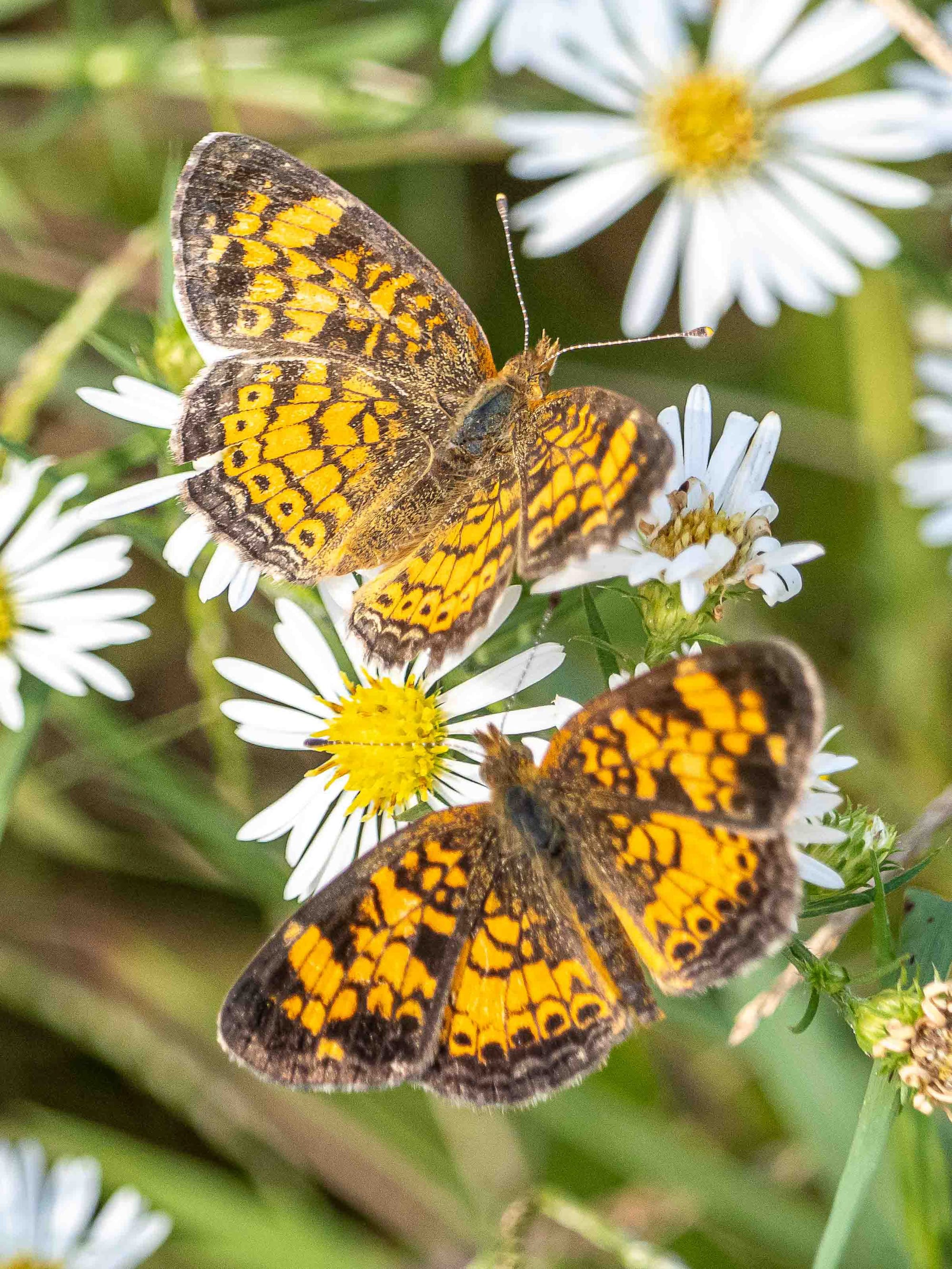 Butterflies are big Aster fans, Eastern Tailed Blue, Orange Sulphur, Pearl Crescents, and Variegated Fritillary