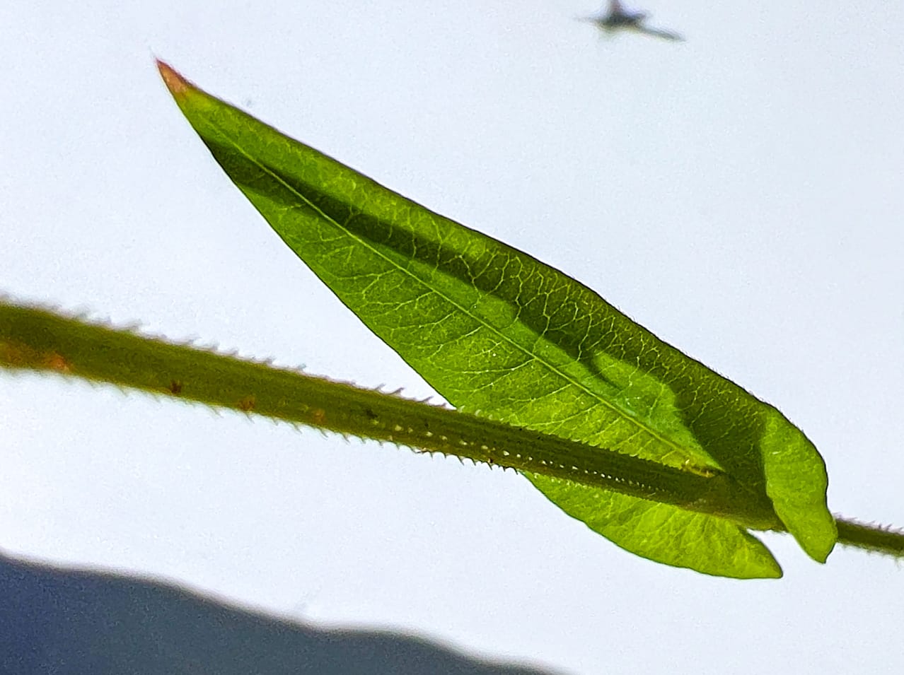 Arrow-shaped leaves and prickly stems that grab clothing and skin. Often climbs over nearby plants using its hooked prickles. Doesn't stand out, but if you look for it you'll find it.