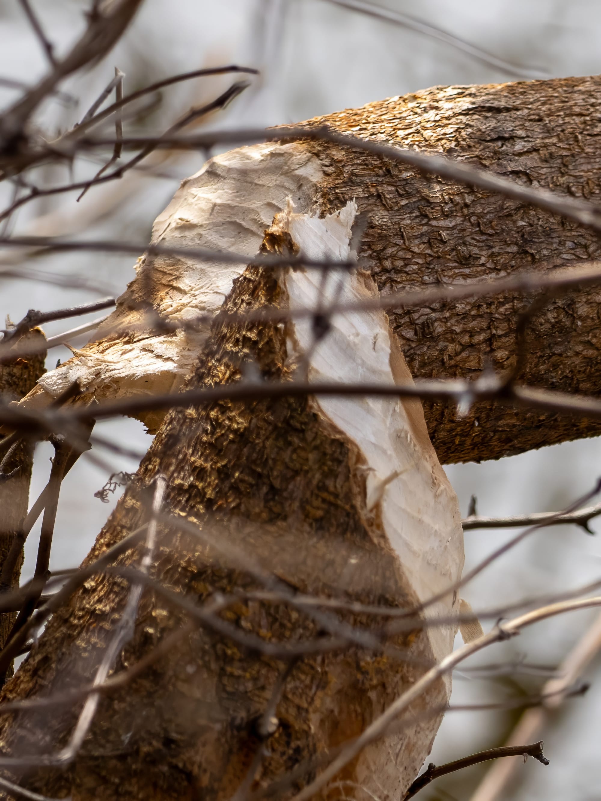 A tree that was cut on the bank of the west pond at the park last March. The tooth marks and wood chips are the unmistakable work of a beaver.