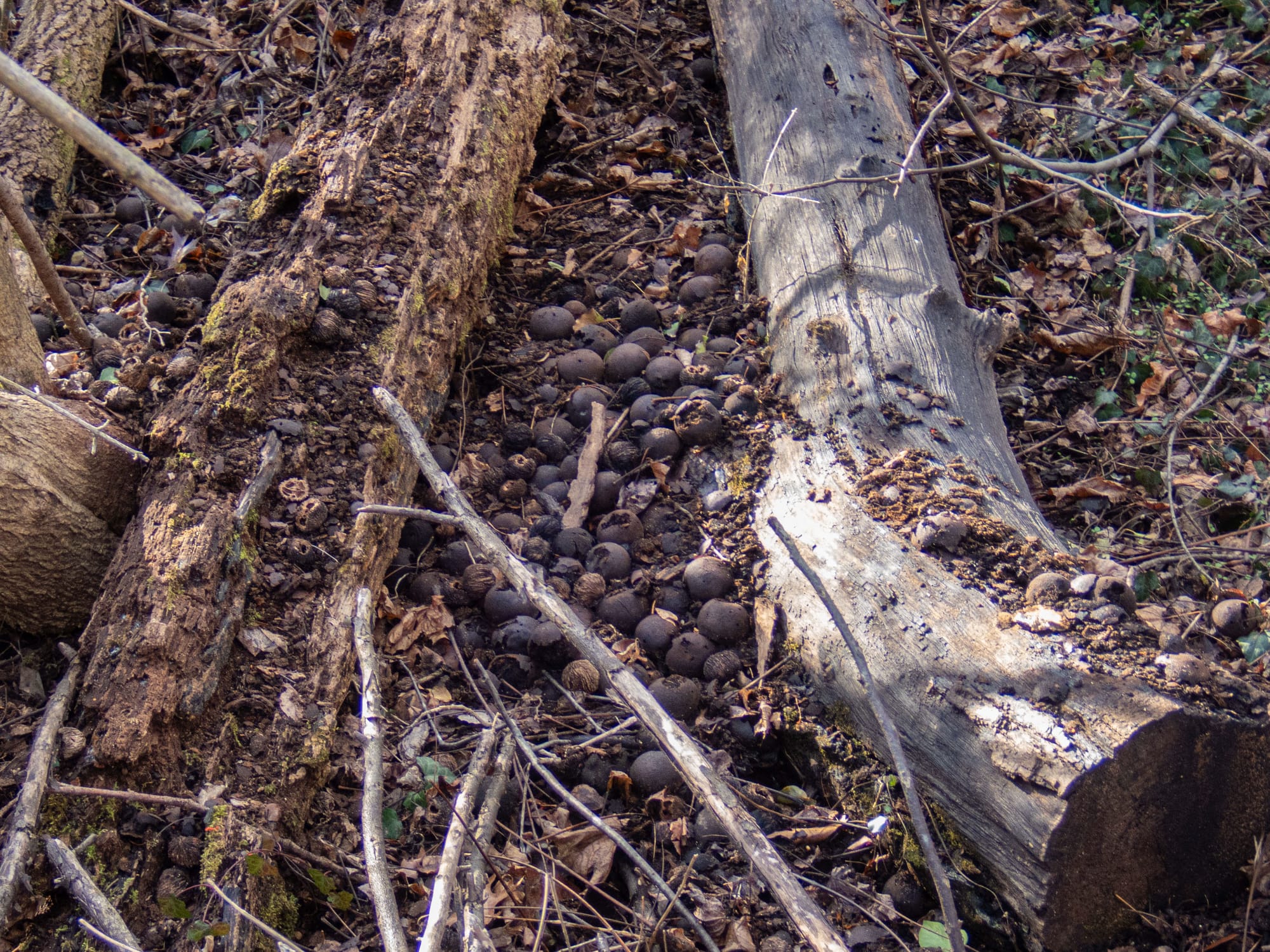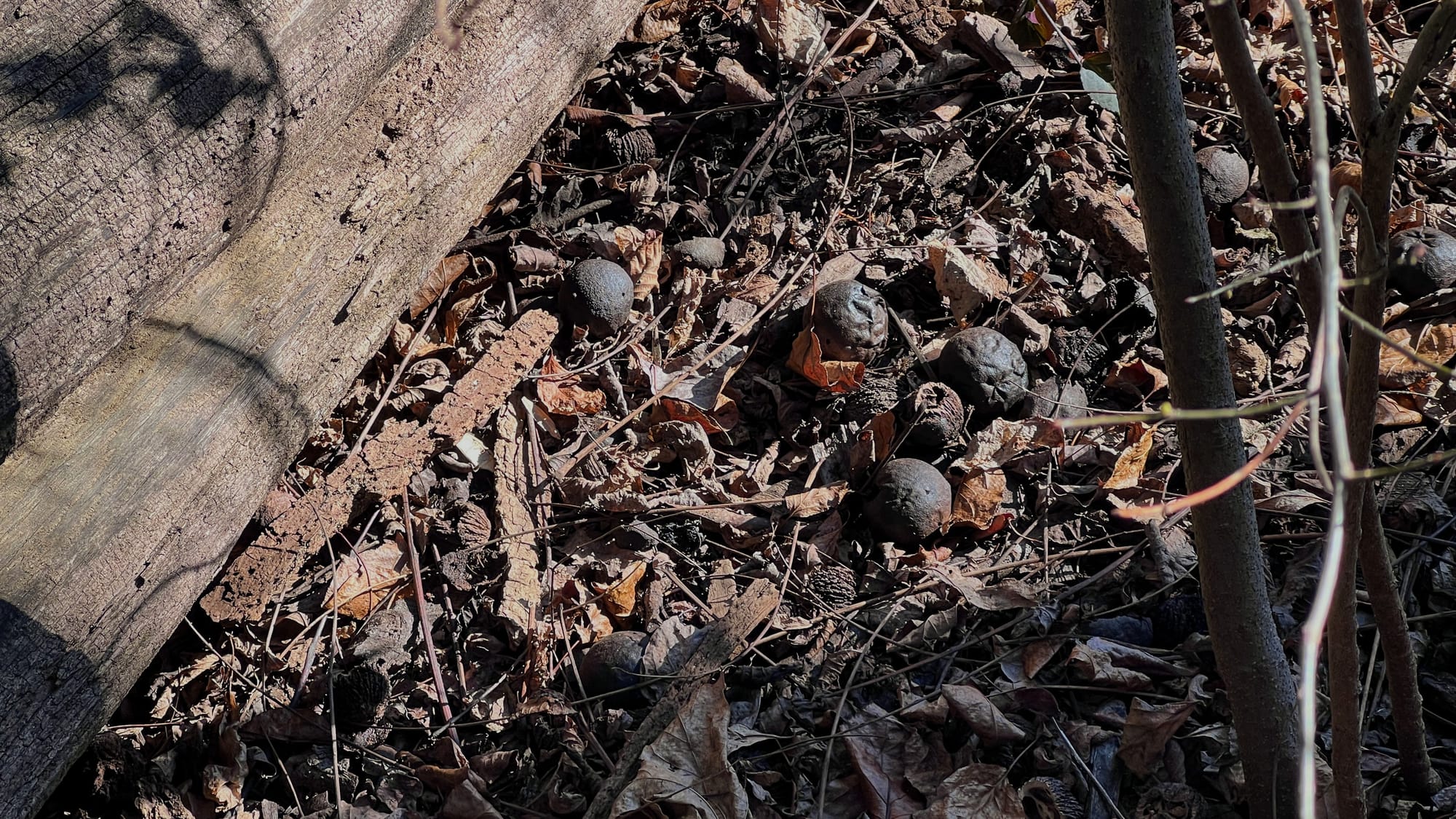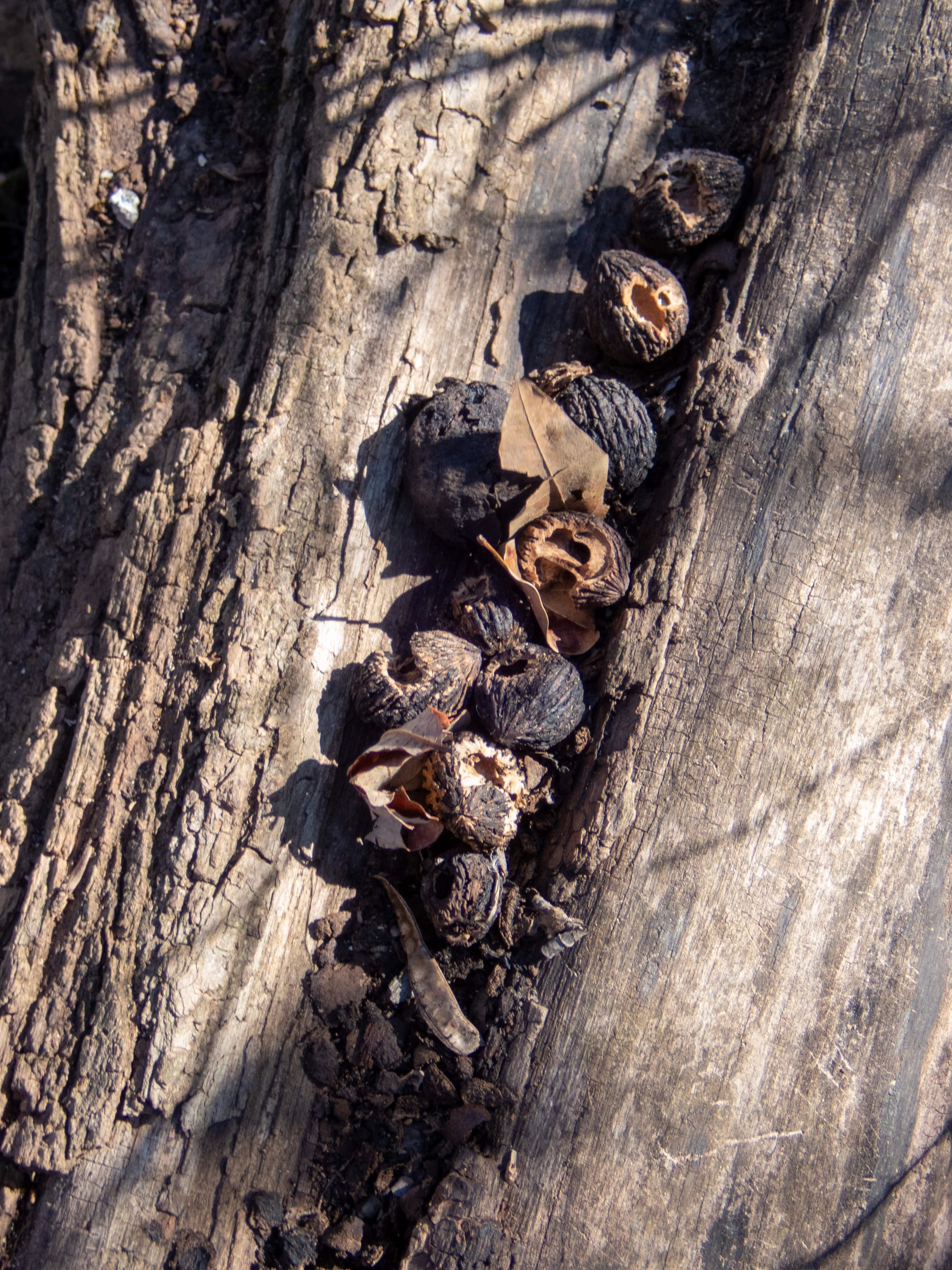 Once the squirrels are through chickadees, nuthatches, jays, and woodpeckers probe the shells for pieces too small for squirrels to bother with. Black walnut is among the highest-energy wild foods found in the park. What the squirrels miss could be a bird's margin of survival.