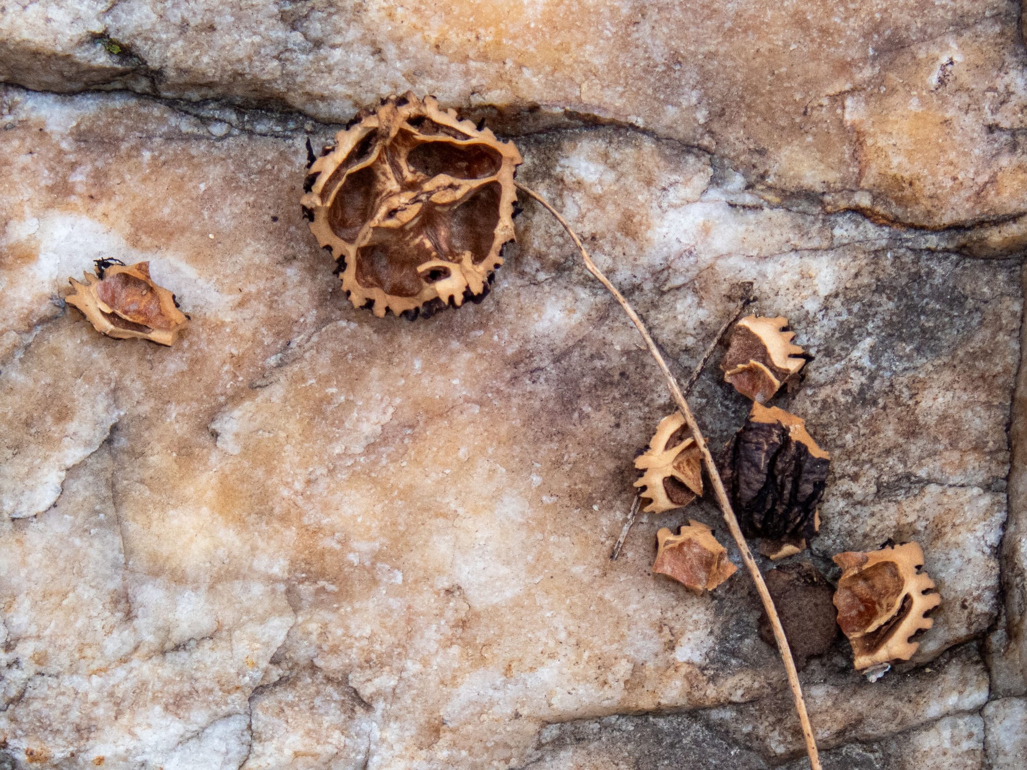 The larger jaws of the gray squirrels enable them to gnaw into the shell and then break it into pieces. The broken fragments of the shell opened by a gray squirrel.