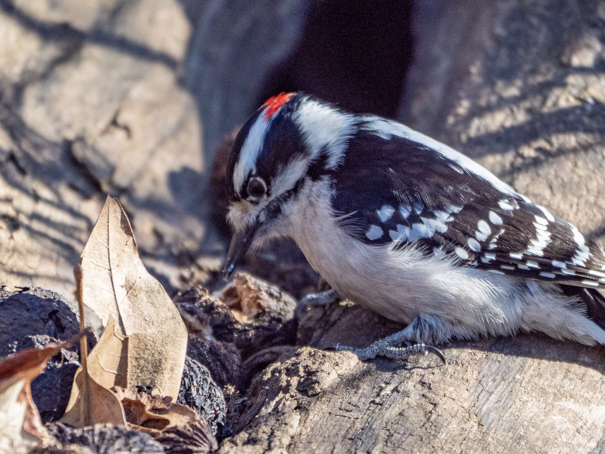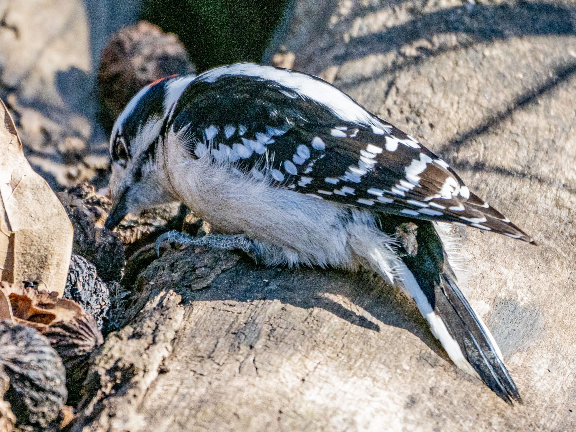 This downy woodpecker is gleaning the bits of nutmeat left behind in a black walnut shell. The close-up shows the fragments of nutmeat on the bird's bill.