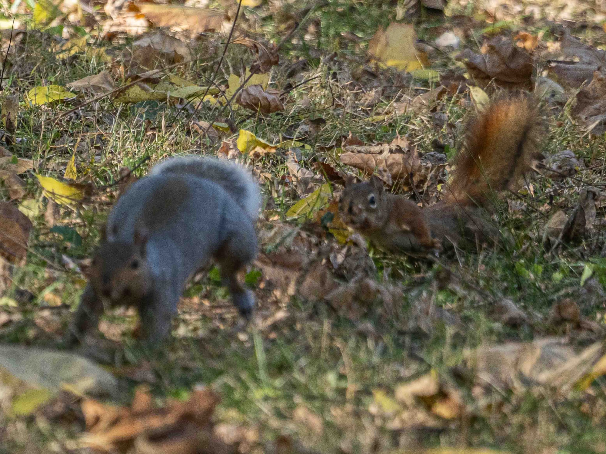 Gray squirrels bury individual nuts or acorns but red squirrels are "larder hoarders": they make piles. You can see these larders in the forest if you look for them. Red squirrel larders are often conspicuous, frequently centered on a log or stump near where the sharp rattling or chattering alarm calls are heard as the red squirrel defends its stash.