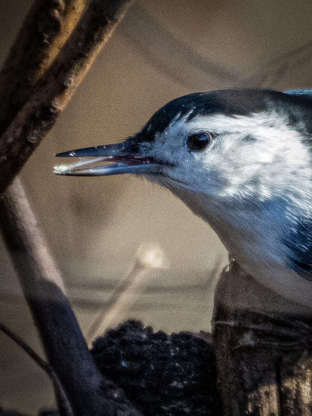 A white-breasted nuthatch cleaning out another black walnut shell. The close-up shows the fragments of nutmeat on the bird's bill.