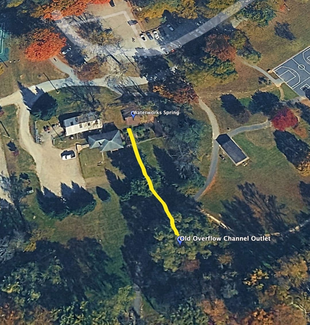 I traced the likely path of the old overflow channel which was rerouted underground at some point to an outlet located as indicated. I've observed green growth here (like the beeches spring) in the middle of winter. This indicates that the old waterworks spring still flows