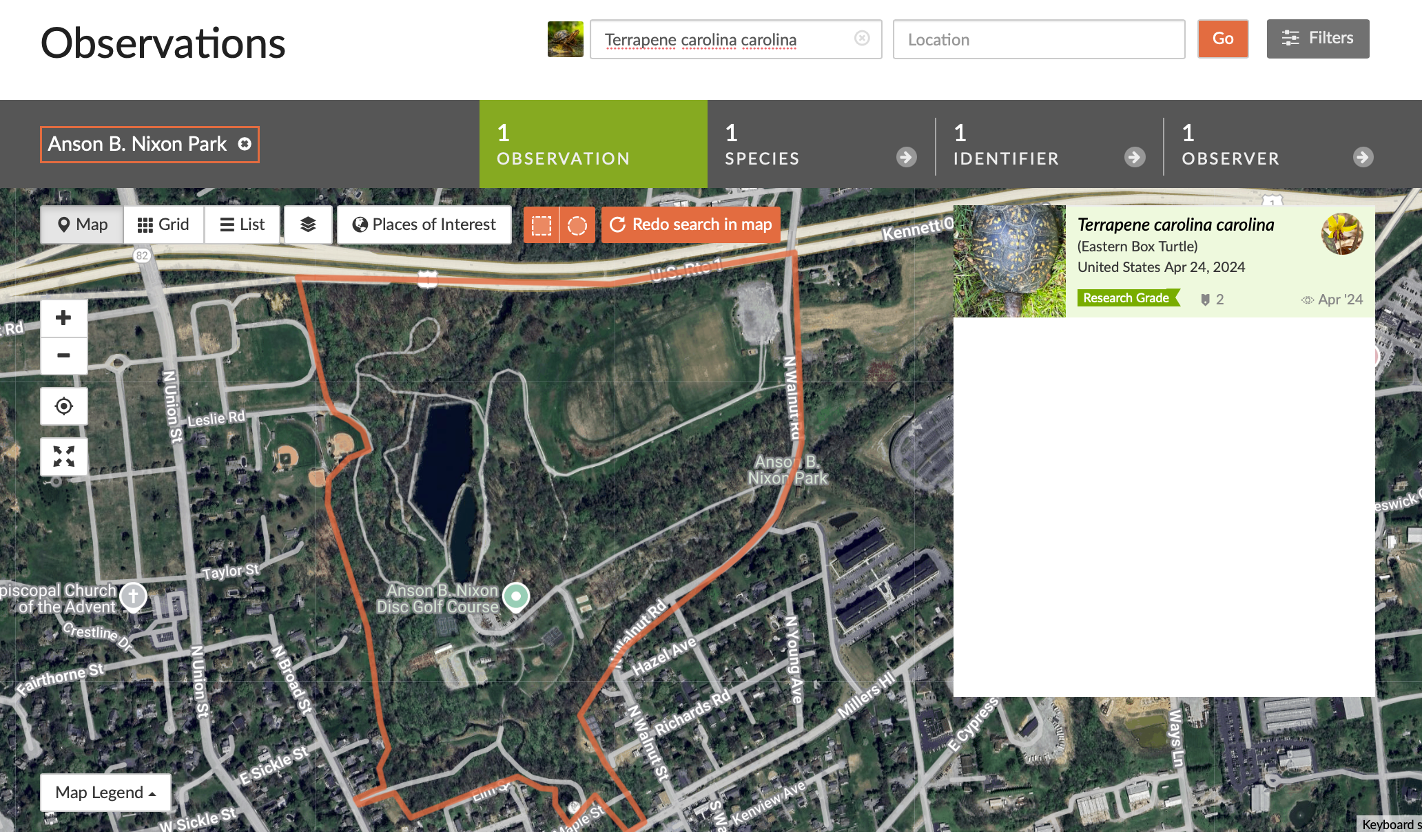 I've only seen one eastern box turtle (Terrapene carolina carolina) at Nixon Park, and it's the only species of land-dwelling turtle I've spotted there. When I was a kid exploring the woods I used to find these turtles all the time. I even took some home as pets. Since then their numbers have declined steeply, knowing what I know now I understand I shouldn't have disturbed them, and it definitely wouldn't happen now.