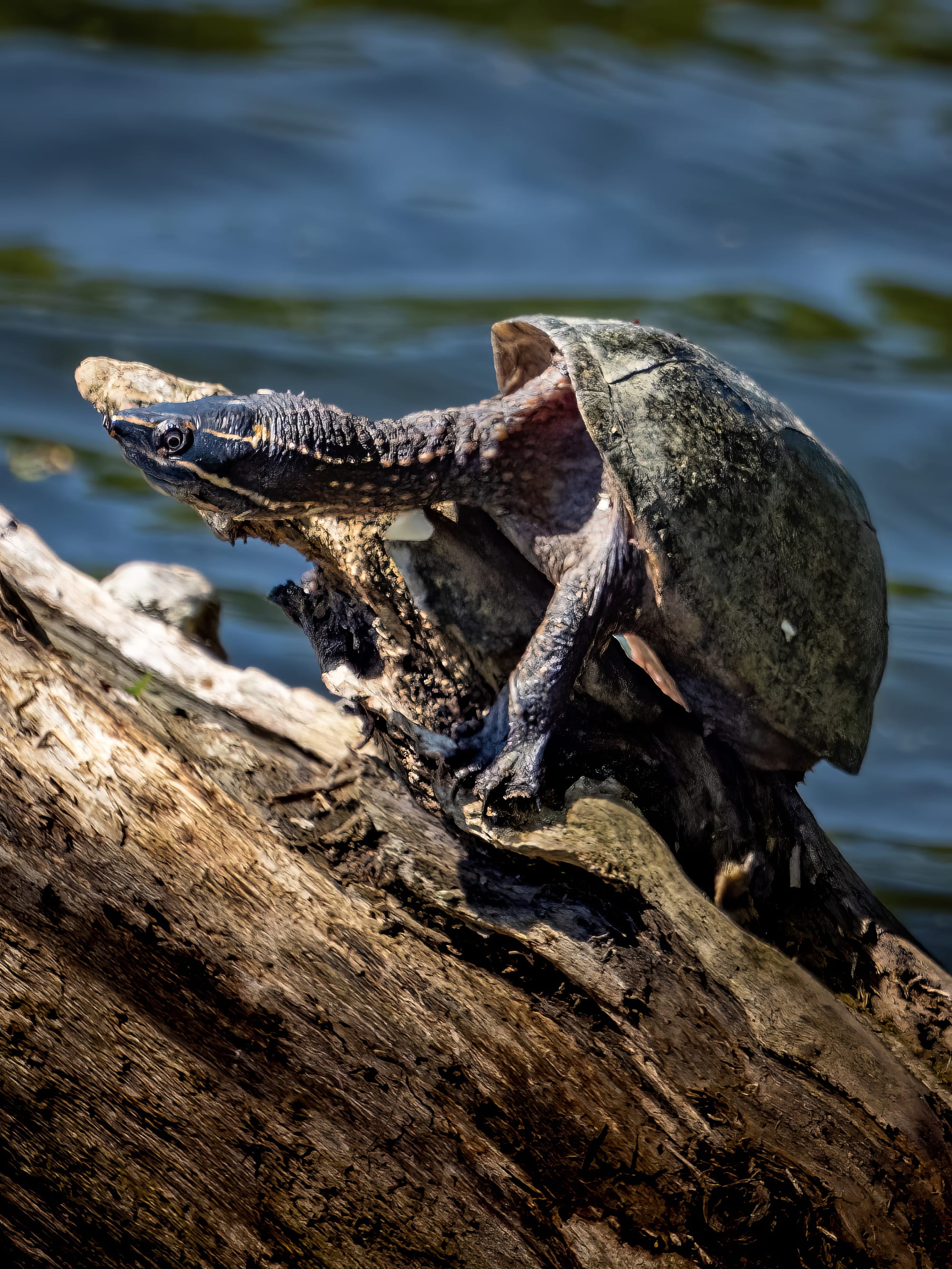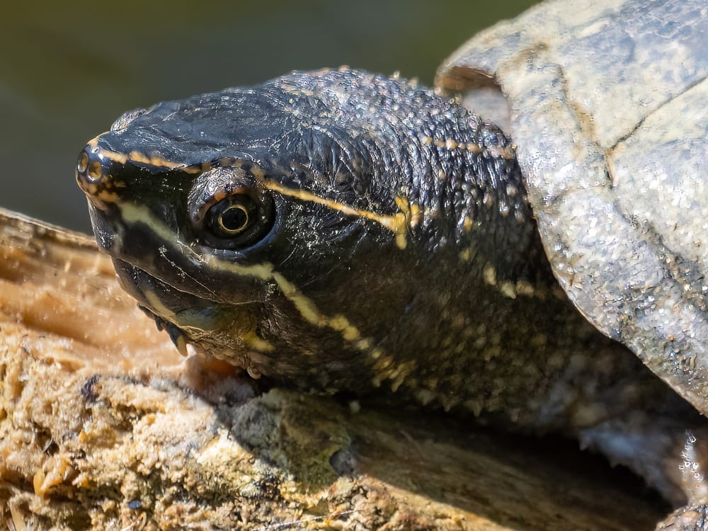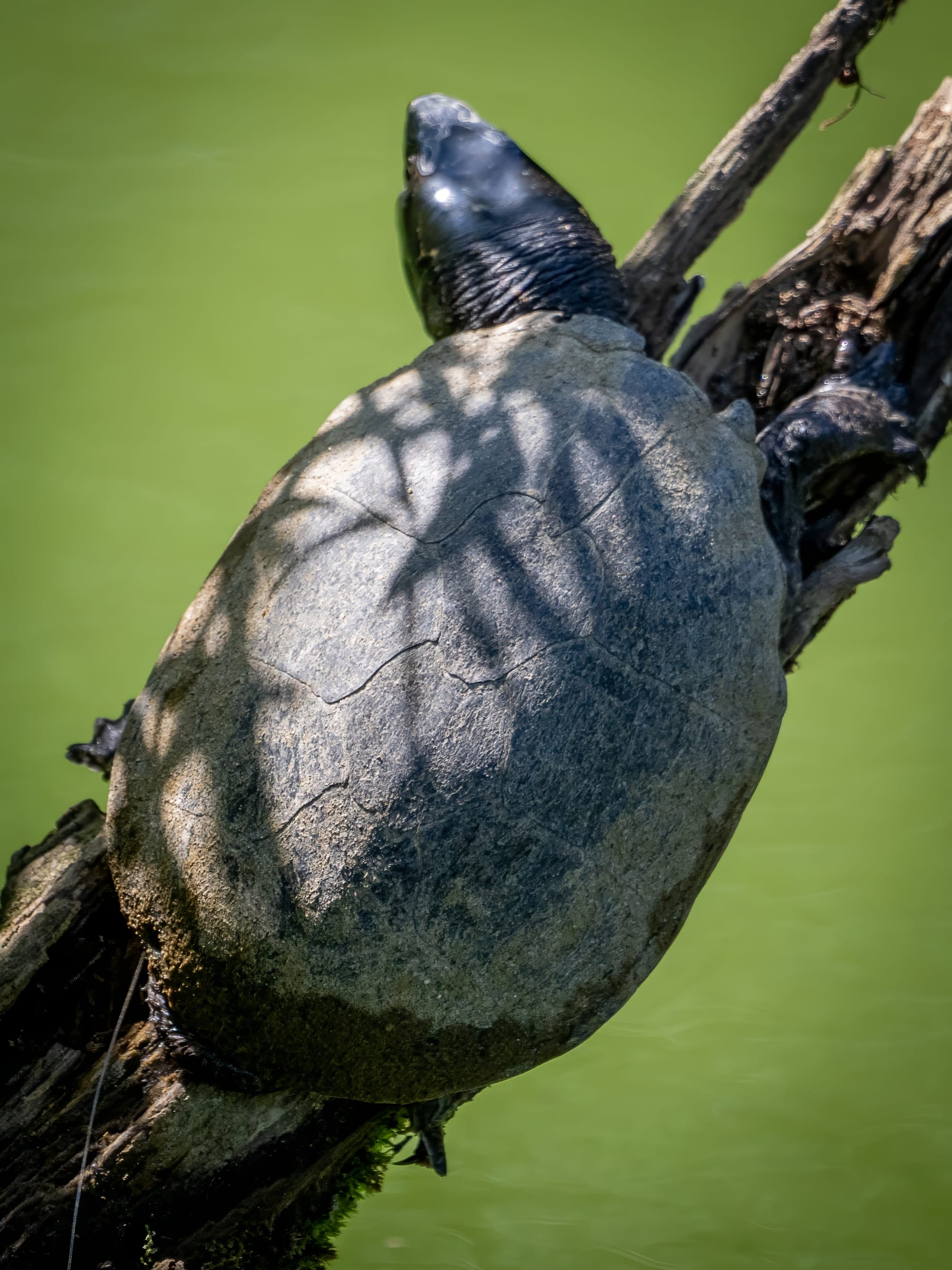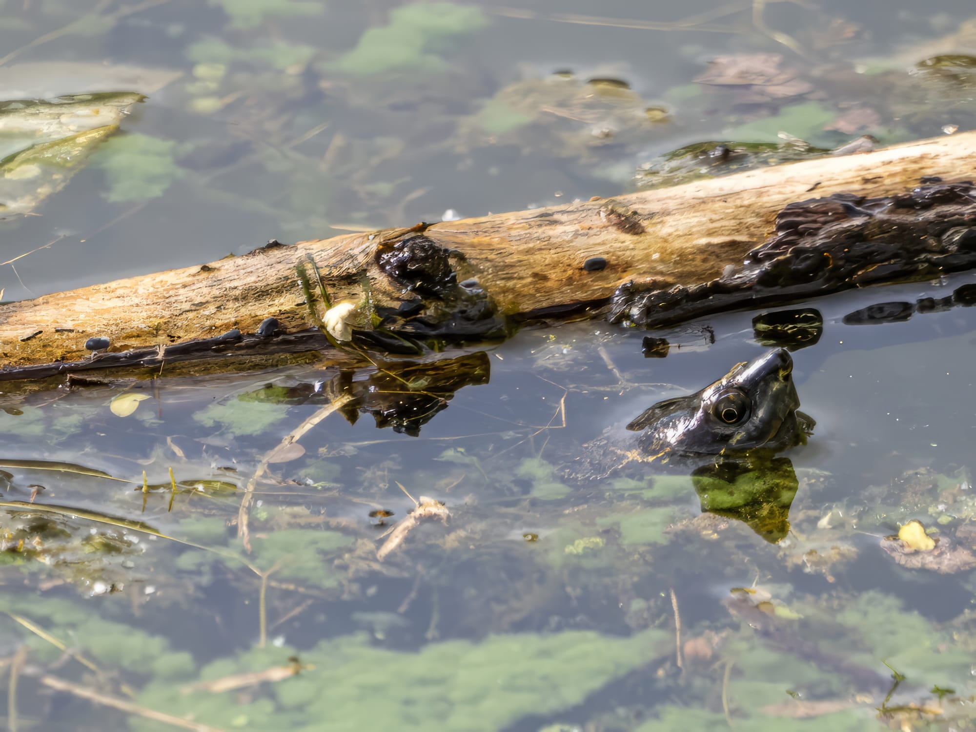 The Eastern Musk Turtle (Sternotherus odoratus) basks in the sun less than other turtle species. While occasionally seen with other basking turtles, they are more typically found basking alone. This solitary basking behavior can make them somewhat difficult to spot within the park.