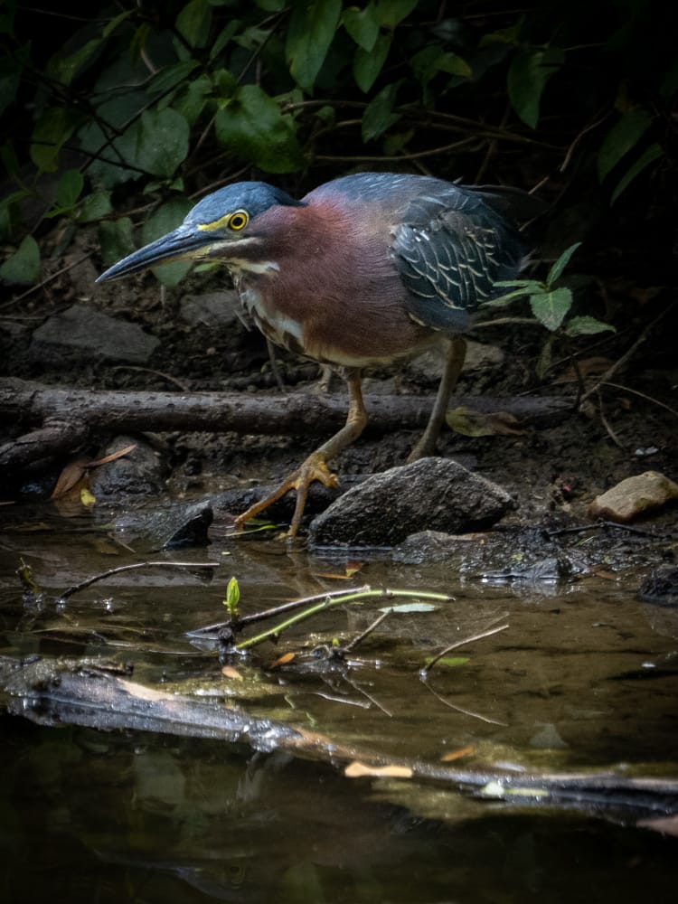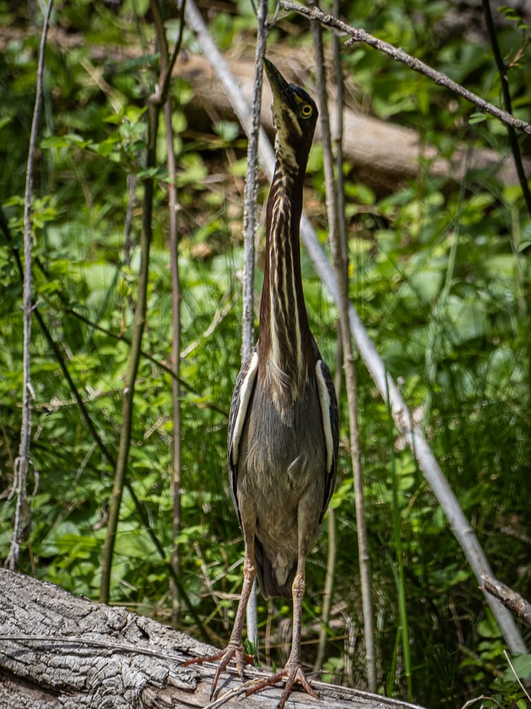 Green Herons blend into their surroundings making them hard to spot. Just the other day near the creek I spotted a heron, but it had already spotted me (I don't blend in at all). Its tail twitched nervously, and, as I approached, it raised its crest; a gesture of agitation. Suddenly it jumped onto a log, extended its neck and beak straight up, and essentially vanished while still watching me.