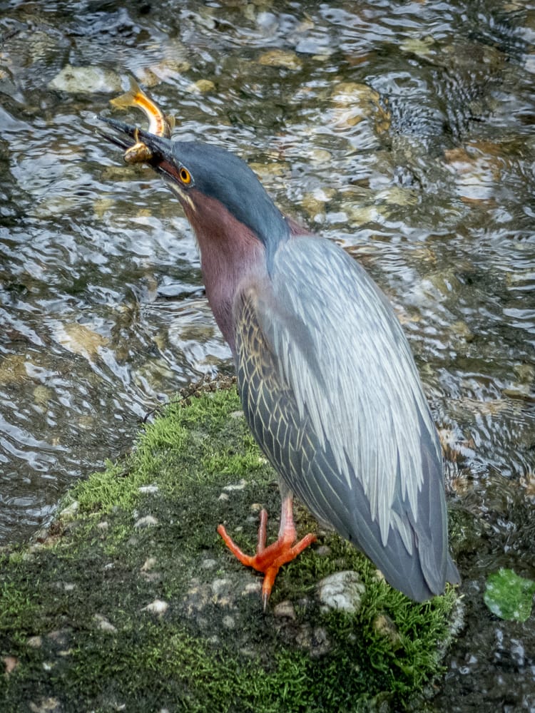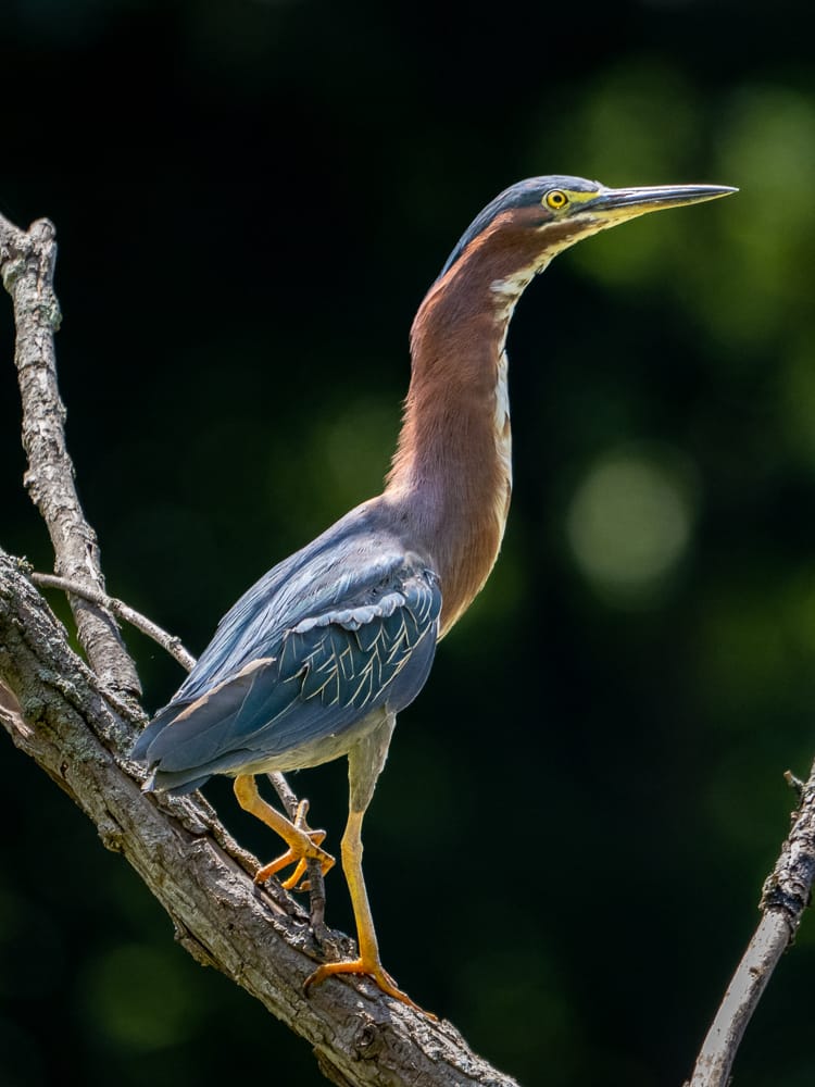 Green Herons are not very green at all. In the right light their crest, back, wings and tail have a dark greenish-black cast, but that's about all the green you’re going to see. They have a chestnut-maroon neck and breast, grayish underparts, and legs and feet that range from greenish-yellow to orange.