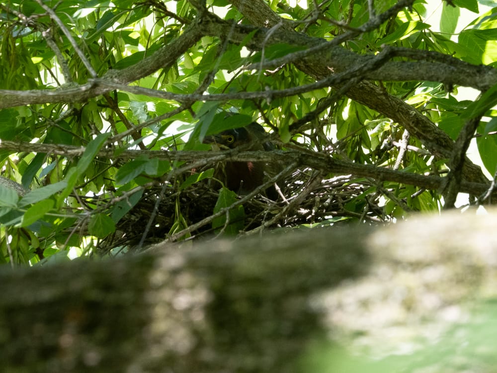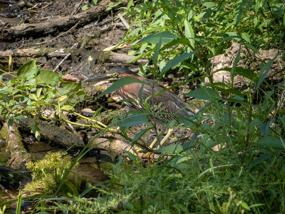 The presence of a breeding pair of green herons at Nixon Park suggests a thriving wetland environment. Wetland preservation, clean water, and shoreline vegetation are all essential for their survival. Look for them along the edge of the ponds and creek, or in the trees hanging over the water. They should be around until late fall.