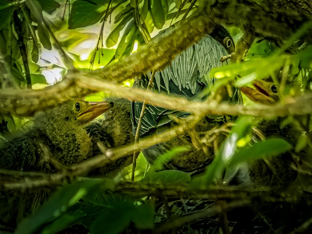 When standing in exactly the right spot you could see the nest and the Heron looking back at you (above left). Three chicks hatched and demanded a lot of care (above right). By the time they were ready to fledge only two remained (lower left). Their feathers filled in and they lost all their down. (lower right)