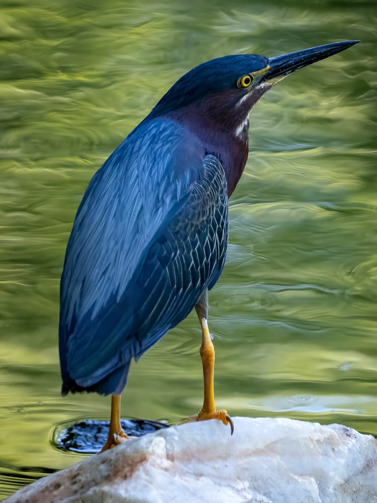 Standing tall with a slender profile, the green heron adopts a perfectly vertical posture, its feathers drawn close to its body, vertical neck stripes enhancing the illusion. This results in a surprisingly thin appearance as the bird remains completely still blending into reeds, cattails, or tall grasses of a wetland habitat.