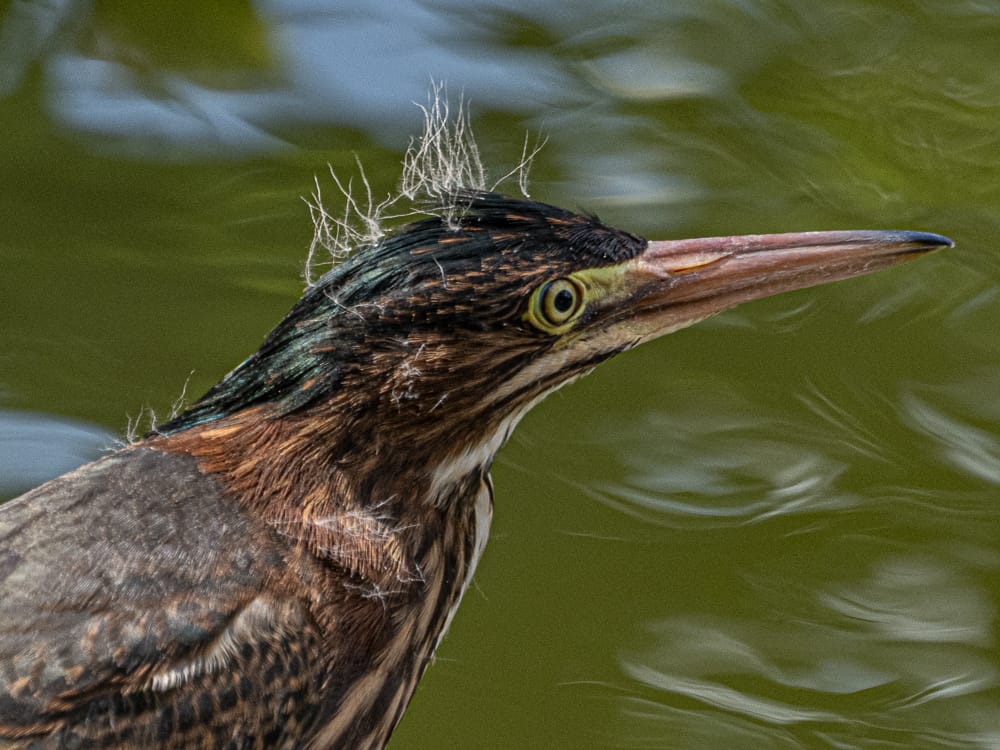 The Green Heron uses bait to lure fish closer. They'll drop an insect, a feather, a small twig, in the water, wait for unsuspecting fish to investigate, and strike out with that amazing neck.