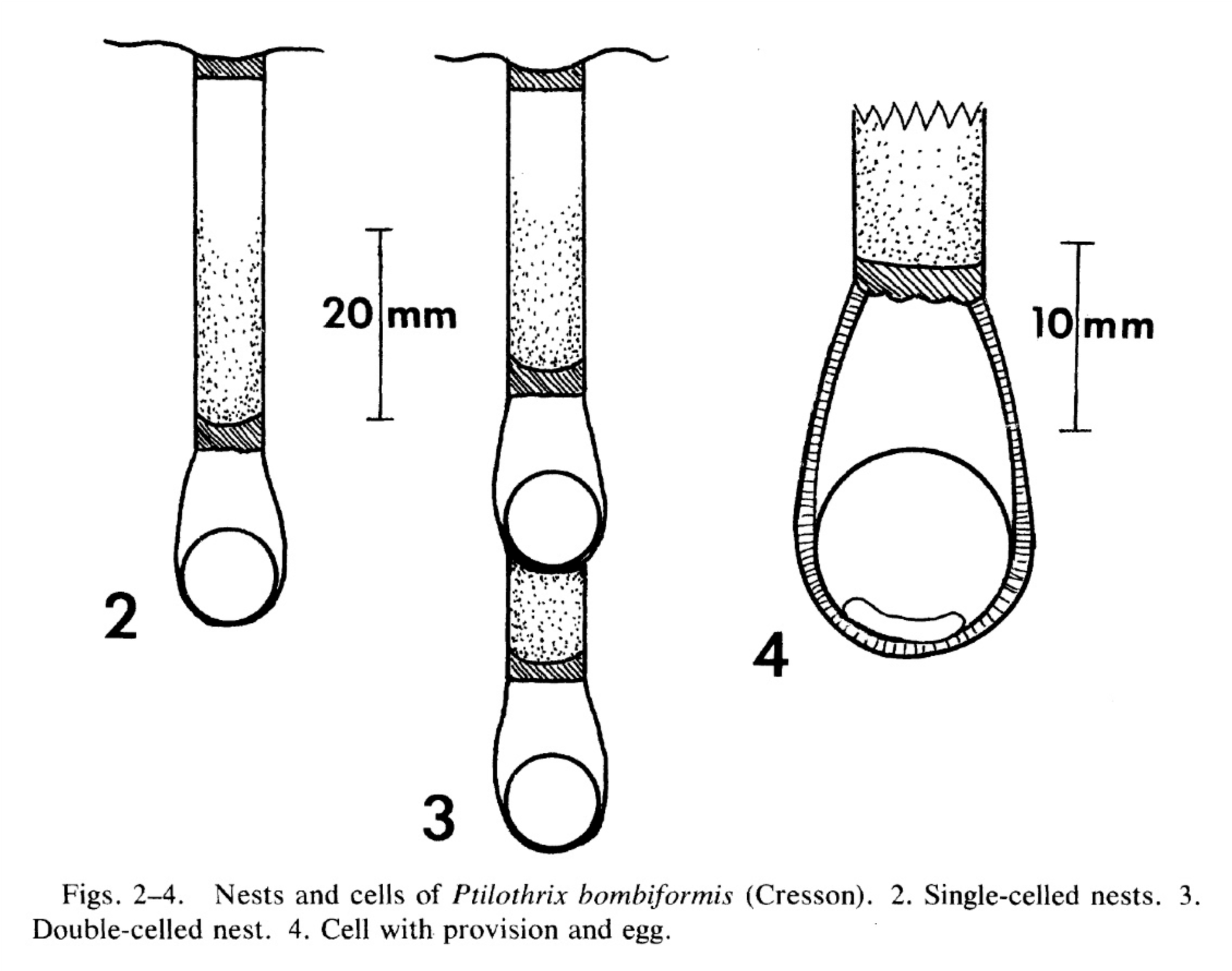 The nest is a vertical tunnel with one or two, sometimes even three, brood cells stacked on top of each other. The topmost brood cell is around 2 inches from the surface. The urn-shaped cells are about an inch long and ½ inch wide at the widest point. Cells are lined with soil and wax about 1/16 inch thick.