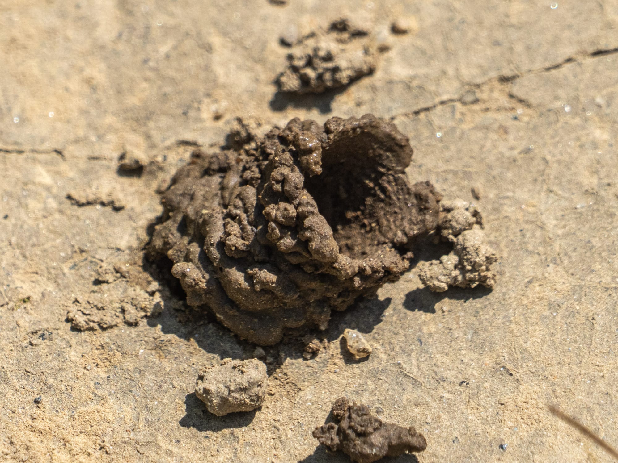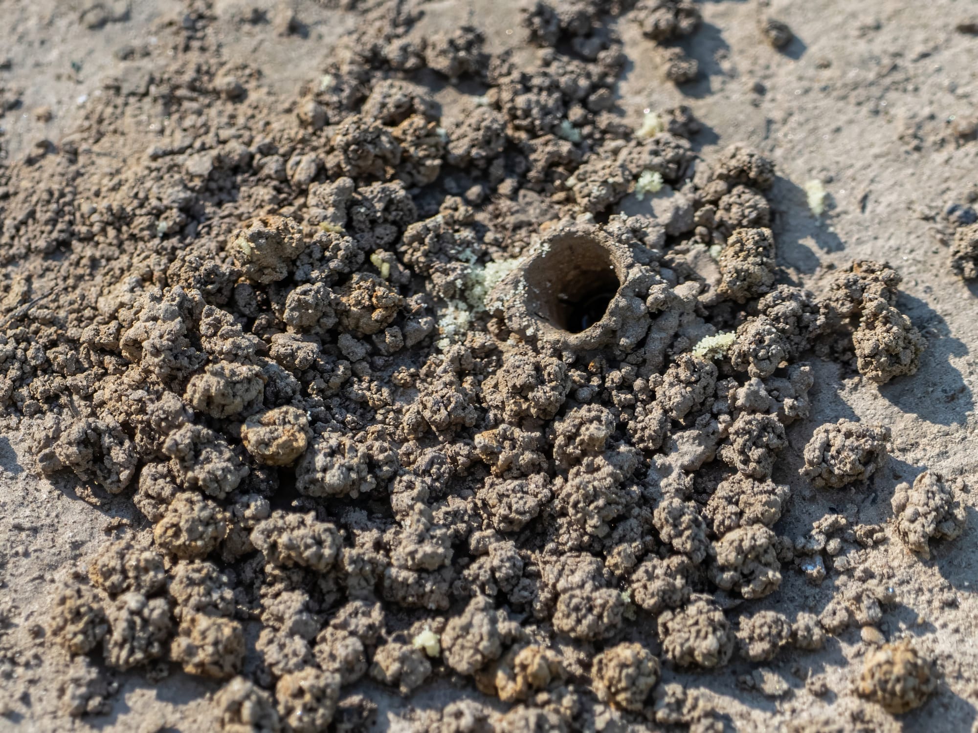 The bee pushes the moistened soil out of the burrow with her rear legs forming the turret.