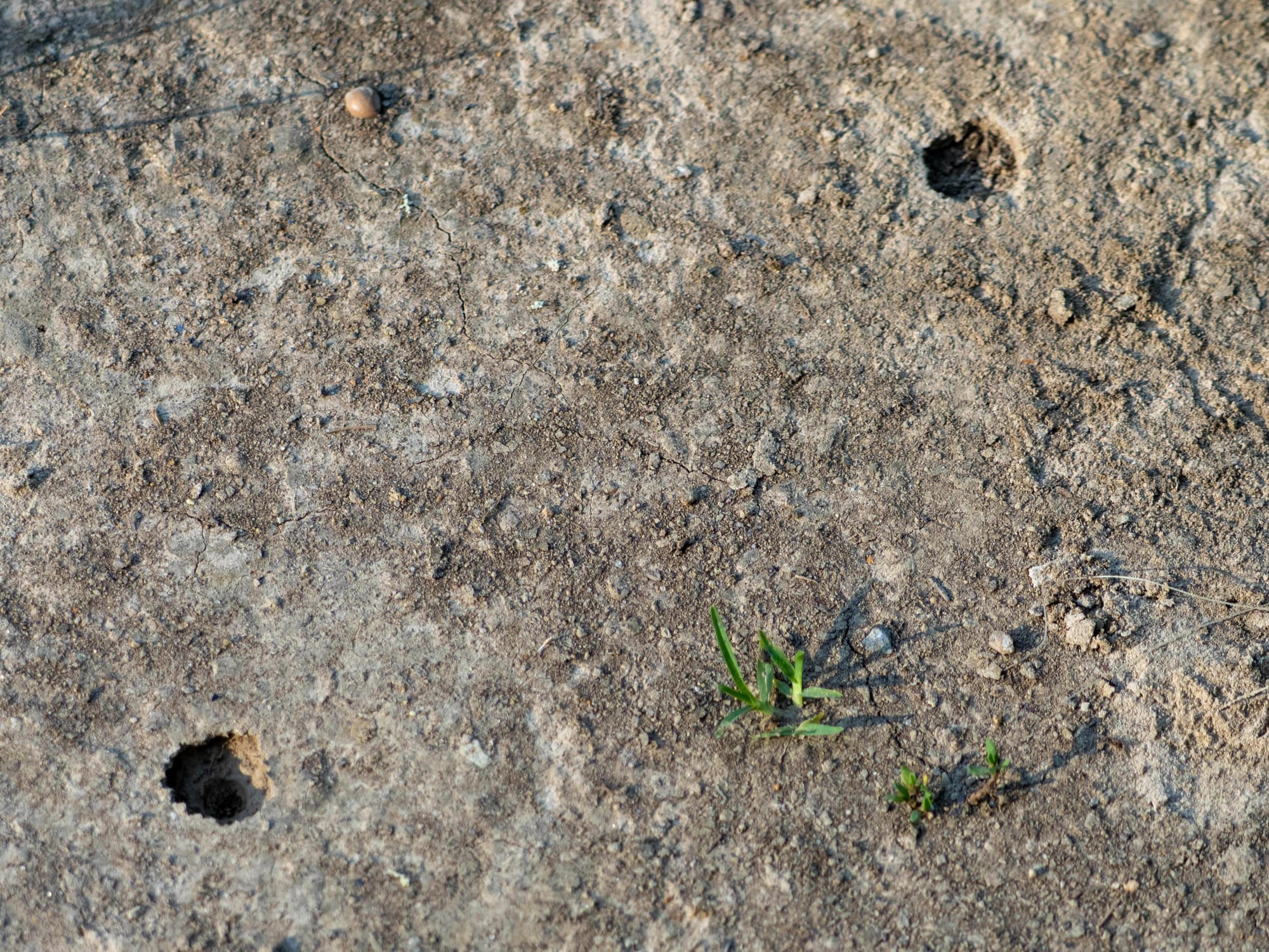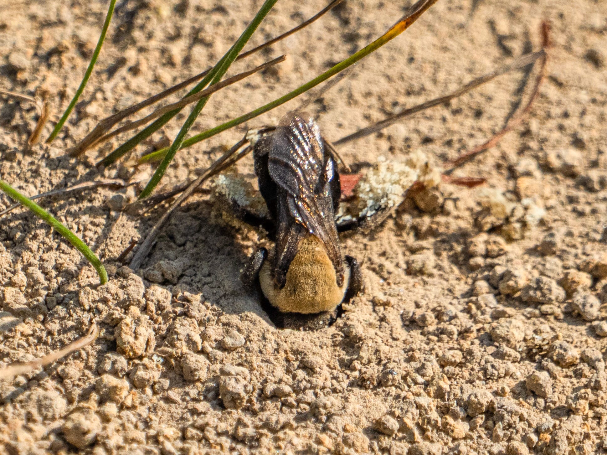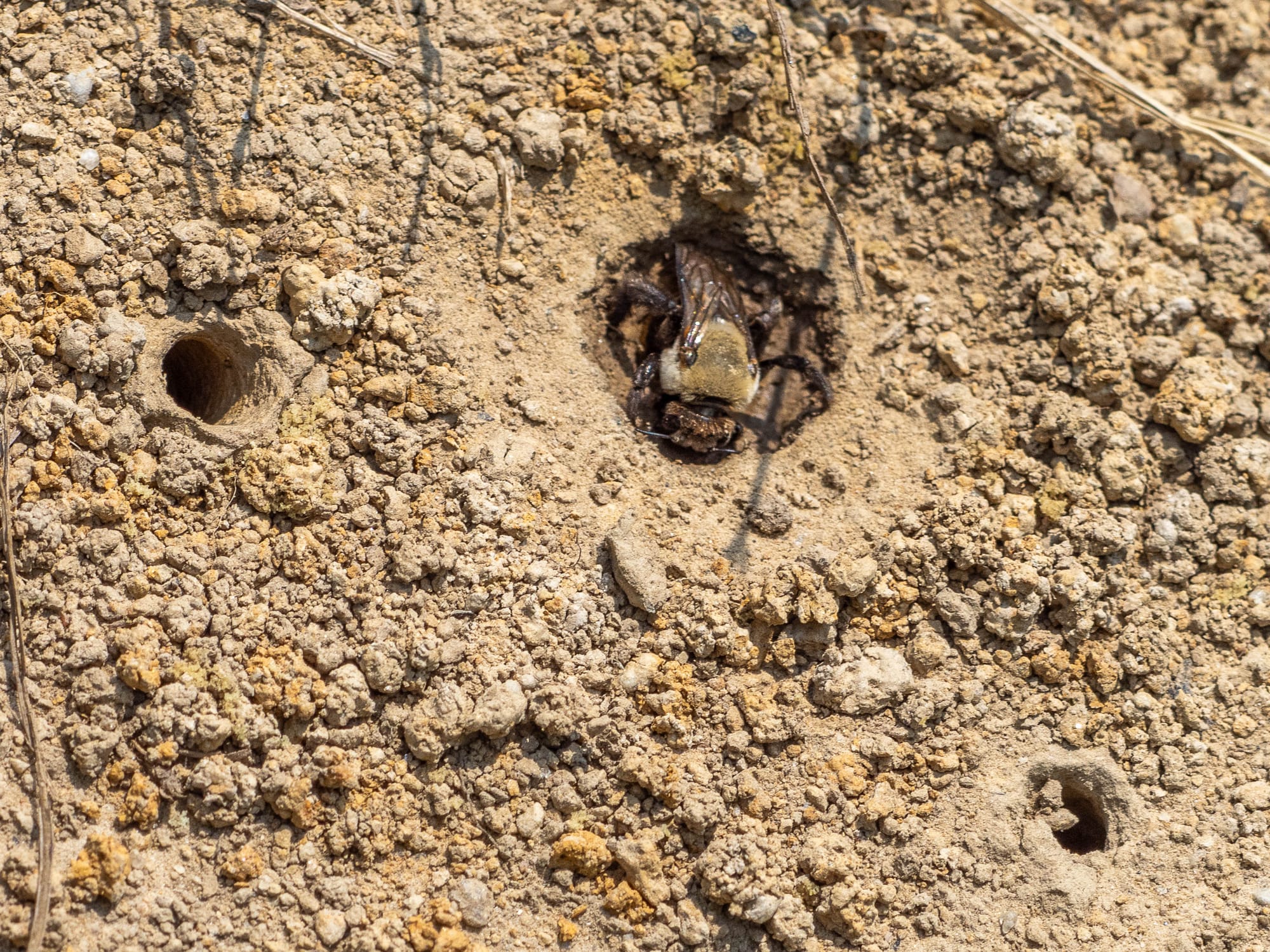 A bee fills in the burrow (note the two other nests under construction nearby, two burrows that have been filled in.