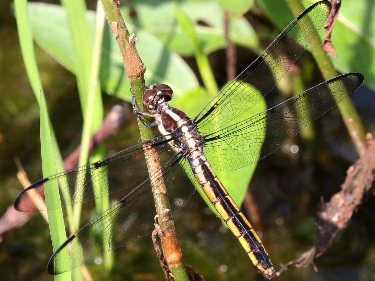 Skimmers are the the largest family of dragonflies (29 groups with 114 different species in North America). Males and females often look different, wings held out flat when they're resting. Named for skimming low over the water. Frequently perch on plants, often returning to a favorite spot. Active daytime hunters, feeding on small flying insects. Females lay their eggs by tapping the water with the tip of their abdomen (ovipositing).