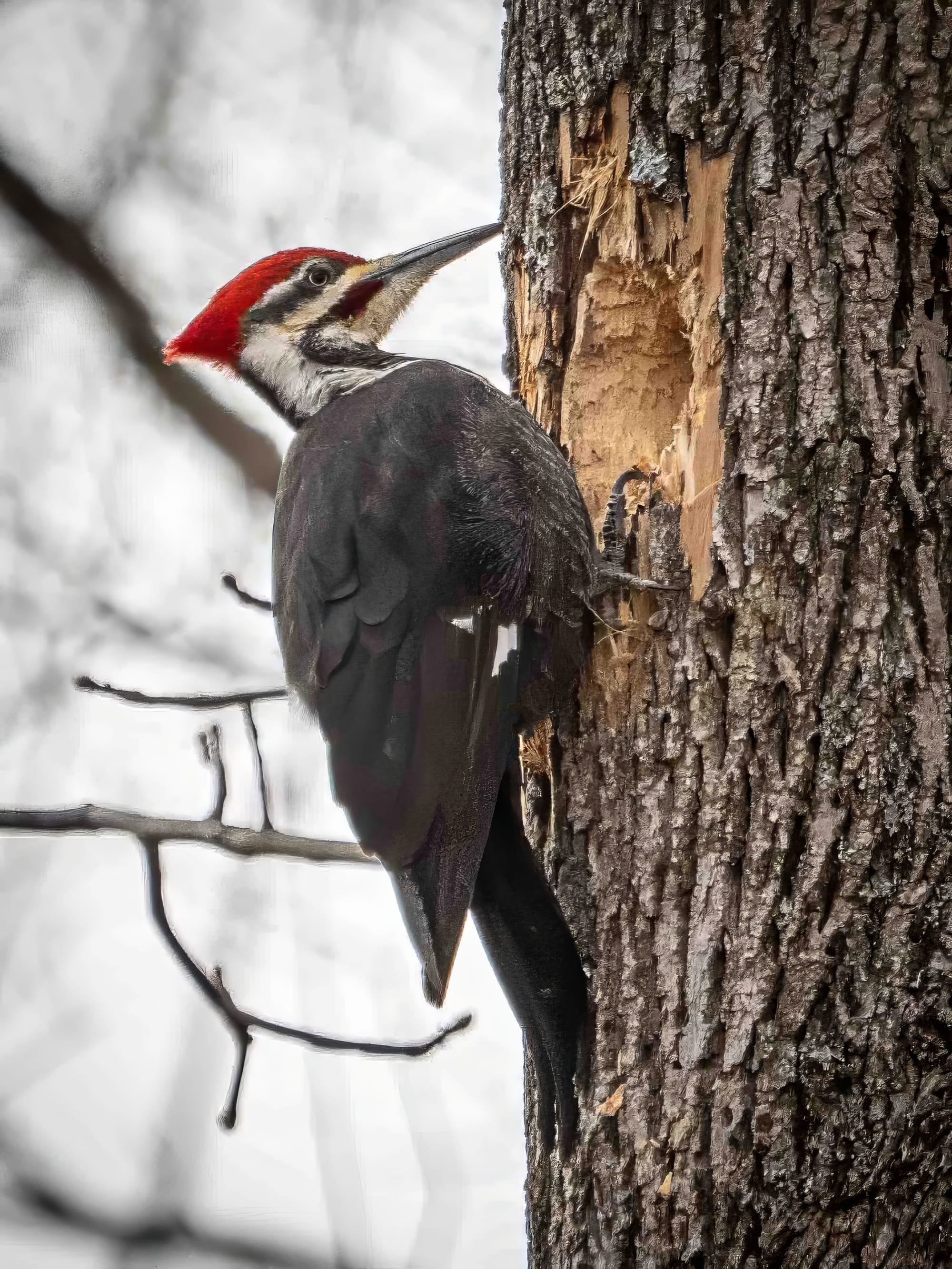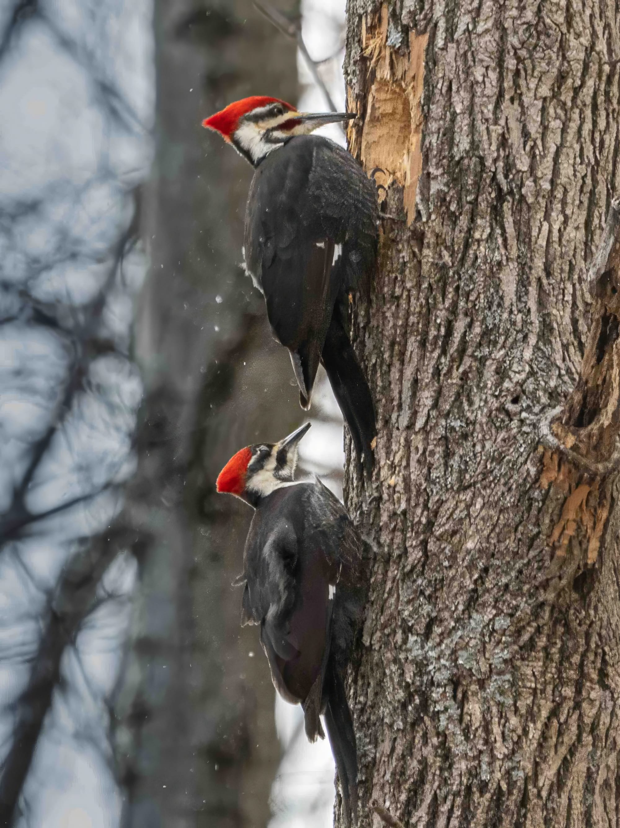 Pileated Woodpeckers will excavate a number of cavities in trees throughout the year. One they will use as a nest, and the others for roosting during the night or bad weather. Other species of birds will use the cavities making Pileated Woodpeckers a valuable part of the Ecosystem.