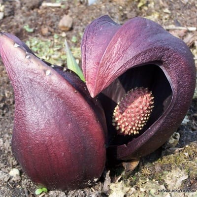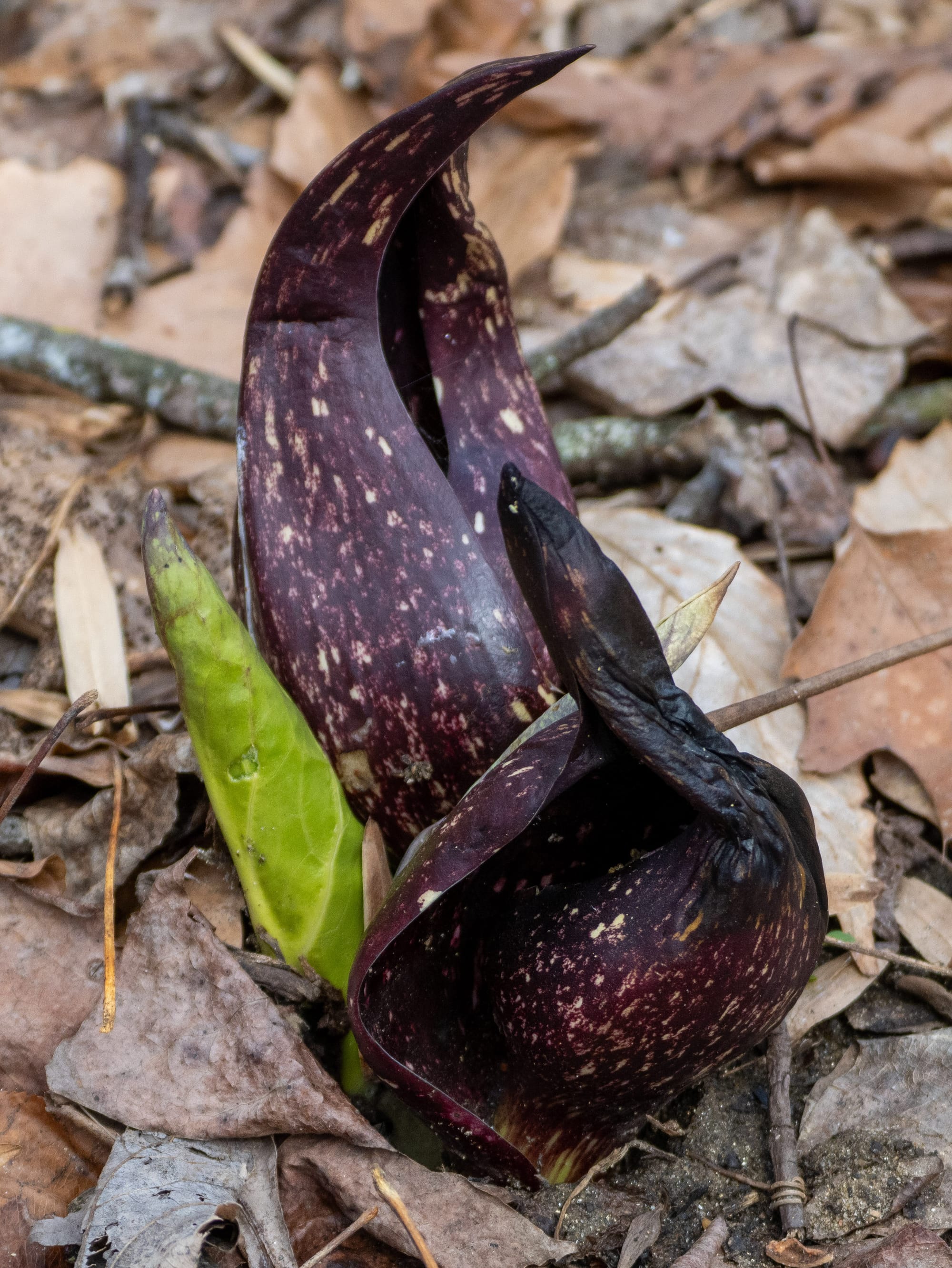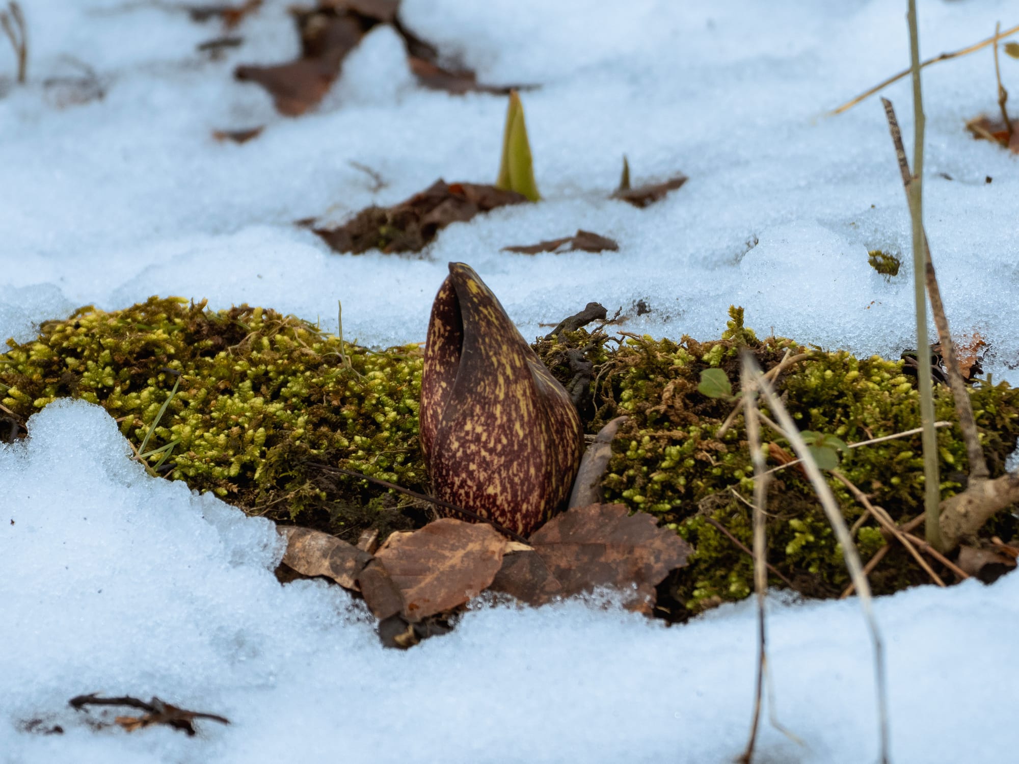 The spathe (the big purple part of a skunk cabbage flower) emerges very early in the year and the spadix (the seed bearing ball inside the spathe) generates its own heat. From well below freezing to well above the internal temperature of the flower remains warmer than the surrounding air - the most precise self-regulation recorded in any flowering plant.