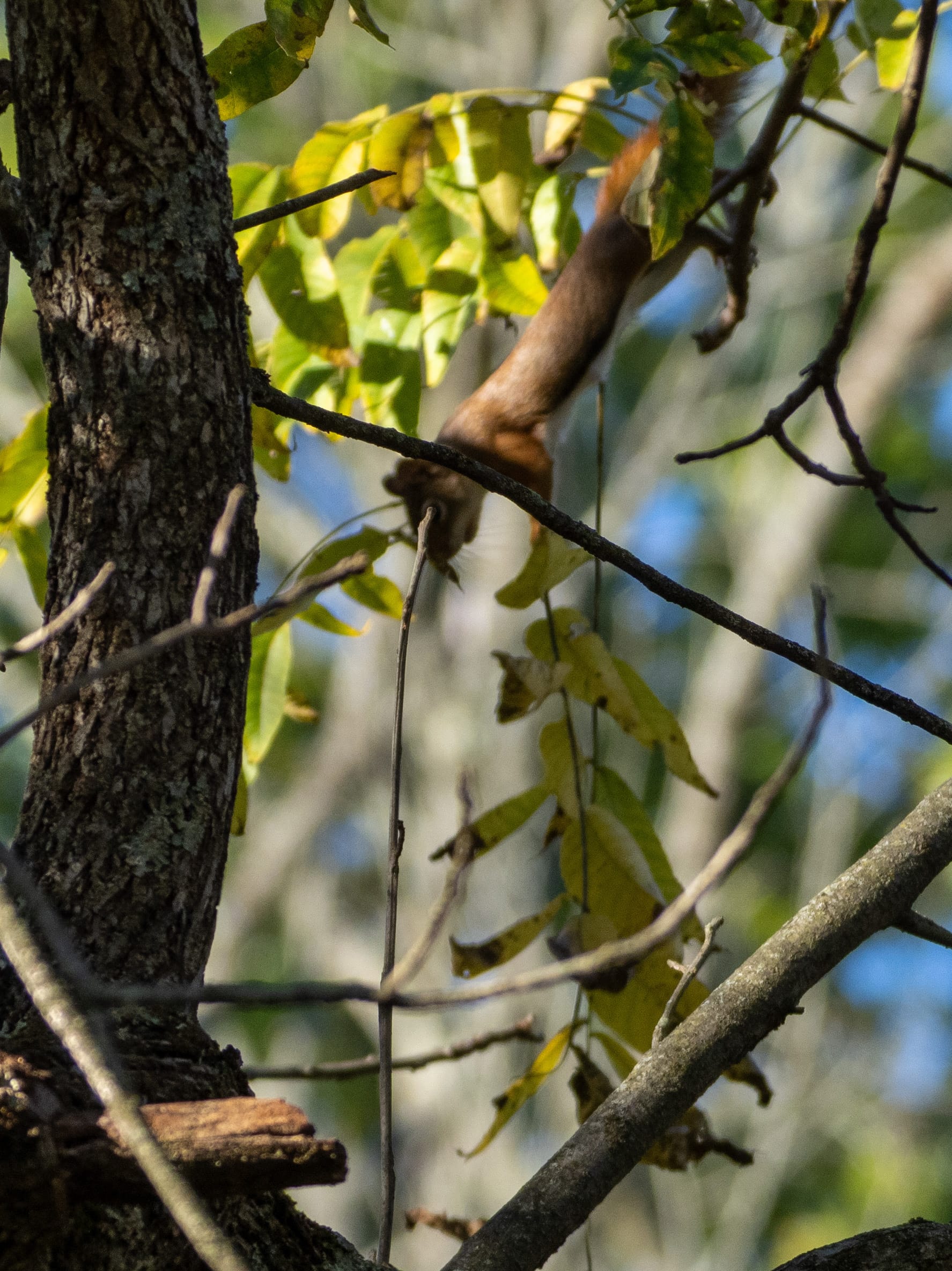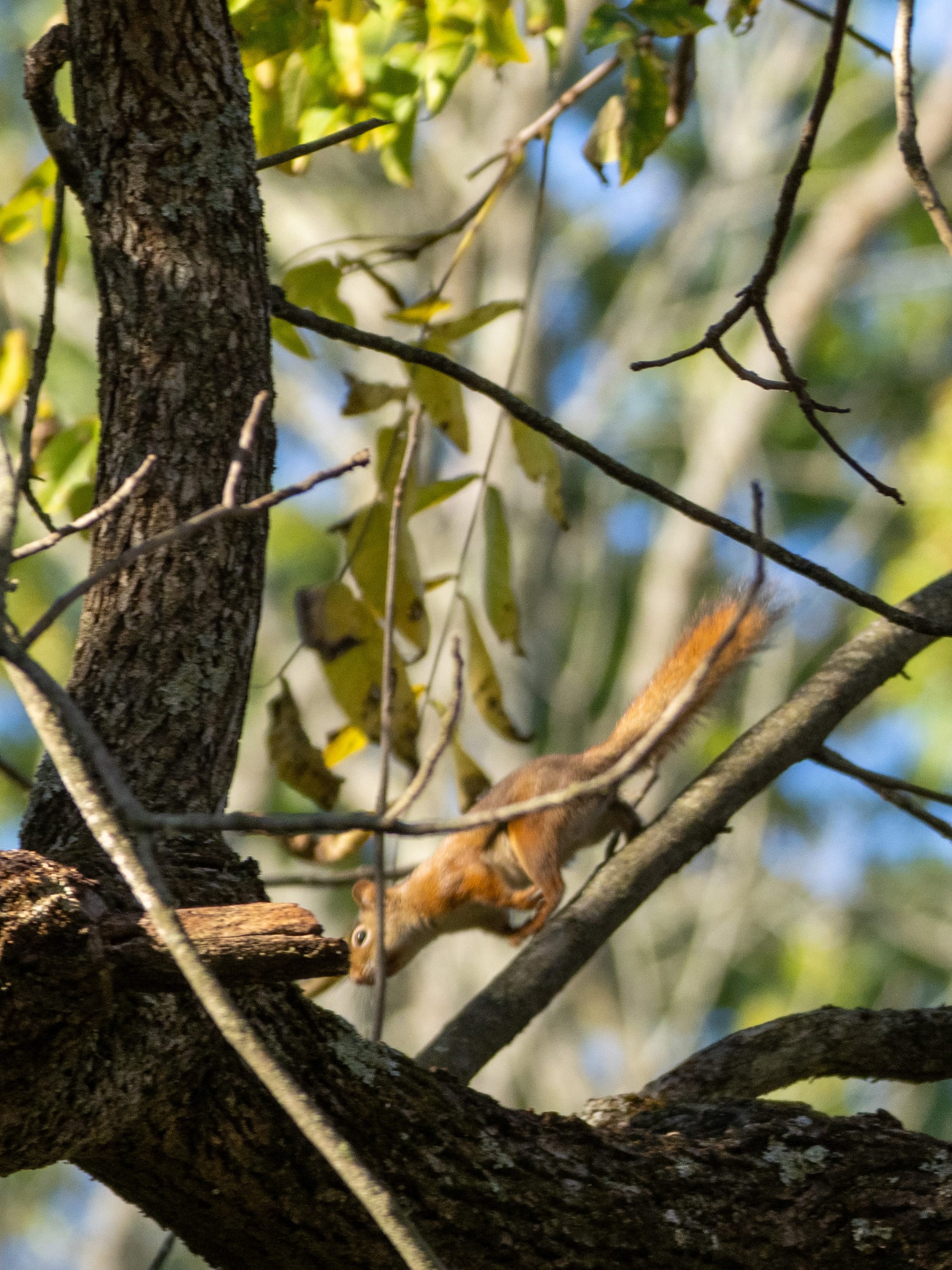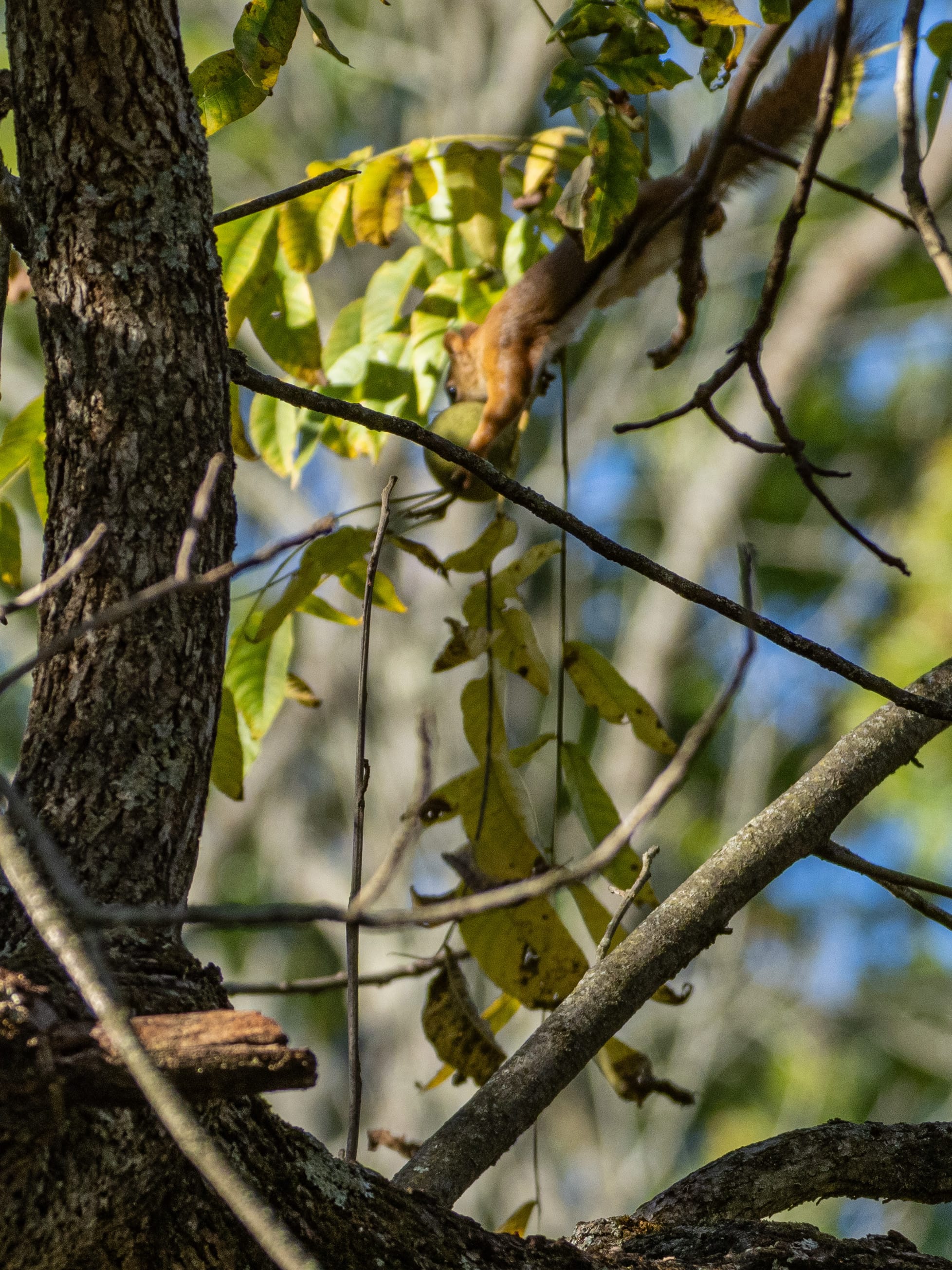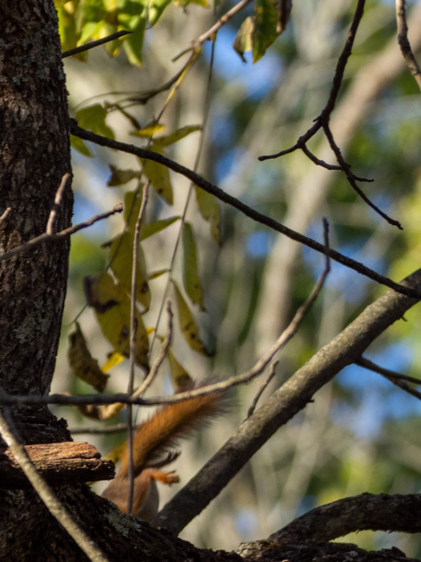 One morning I was passing by a stretch of the creek and heard a "kerplunk" - the sound of black walnuts falling in the creek. I figured it was the wind, but on closer inspection it was a Red Squirrel methodically working through the branches pushing black walnuts towards what I imagine it thought was the ground? I don't think Red Squirrels go swimming, but it wouldn't surprise me if they did.