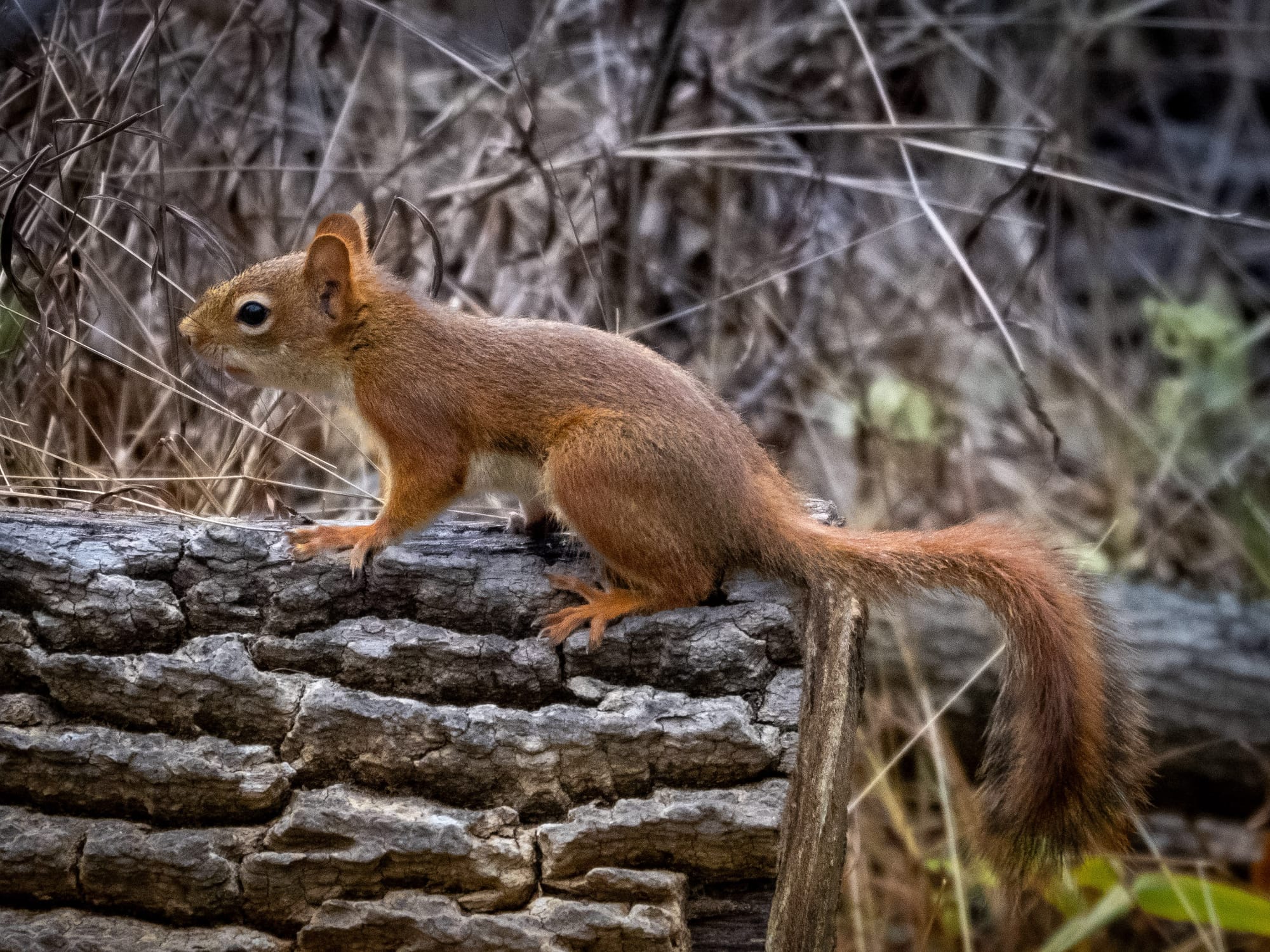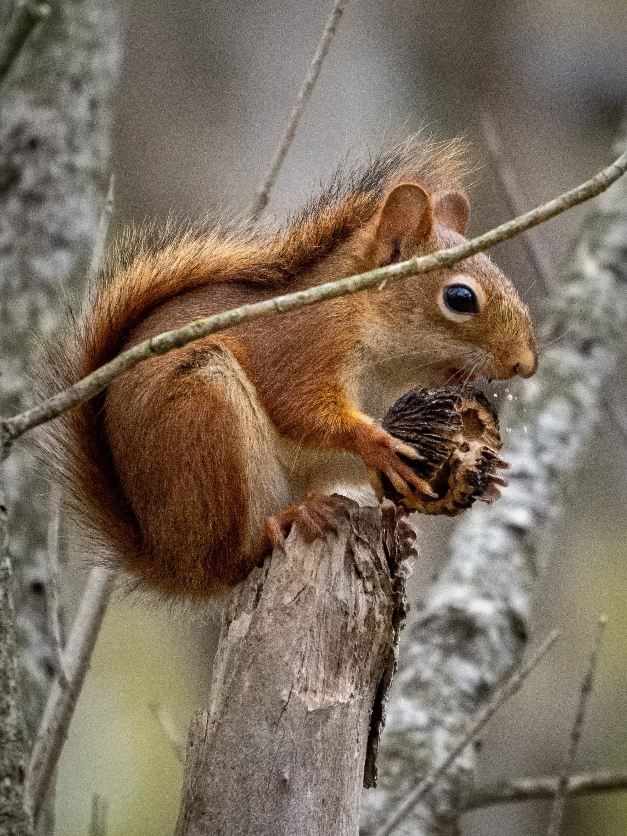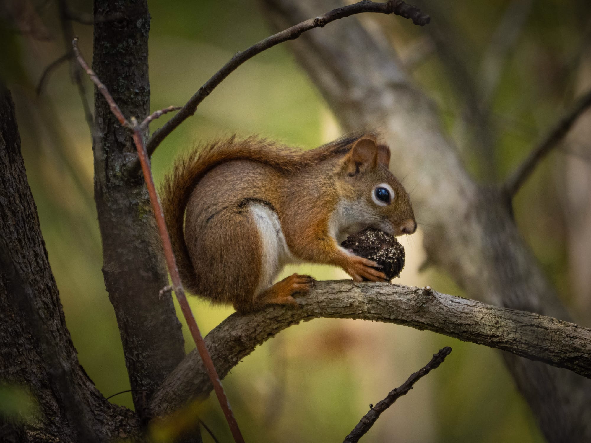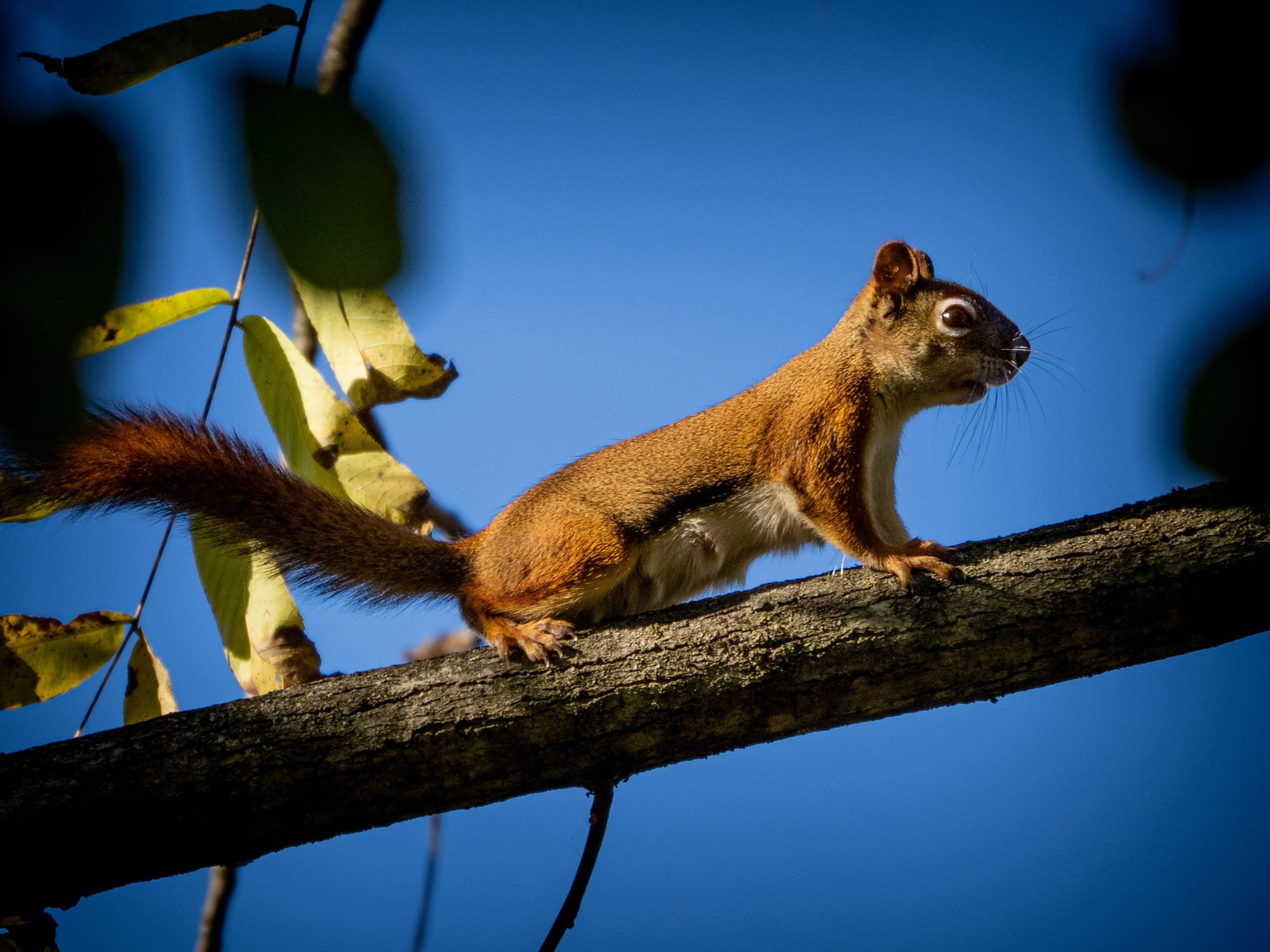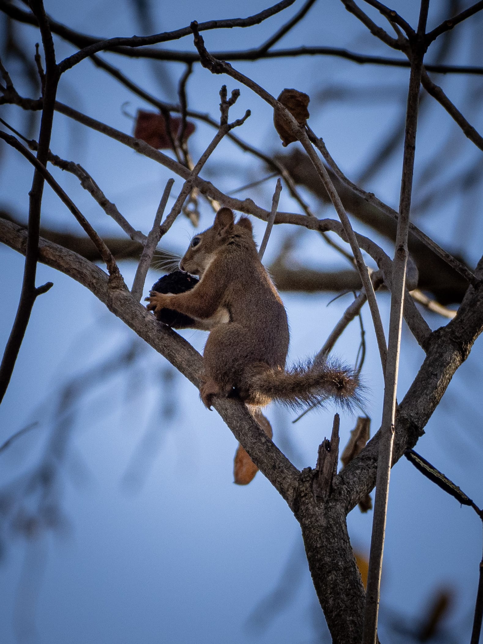 One morning I was passing by a stretch of the creek and heard a "kerplunk" - the sound of black walnuts falling in the creek. I figured it was the wind, but on closer inspection it was a Red Squirrel methodically working through the branches pushing black walnuts towards what I imagine it thought was the ground? I don't think Red Squirrels go swimming, but it wouldn't surprise me if they did.
