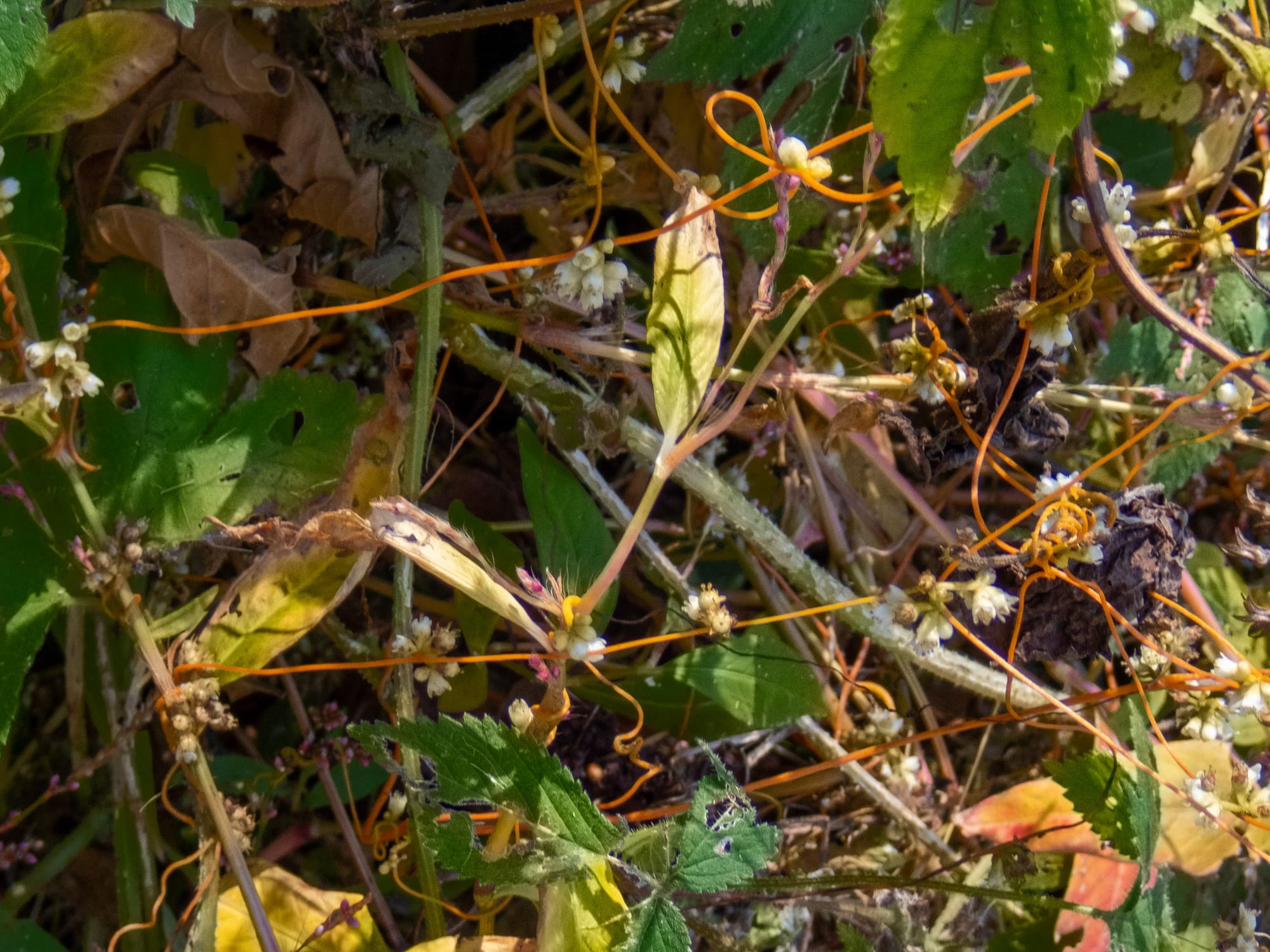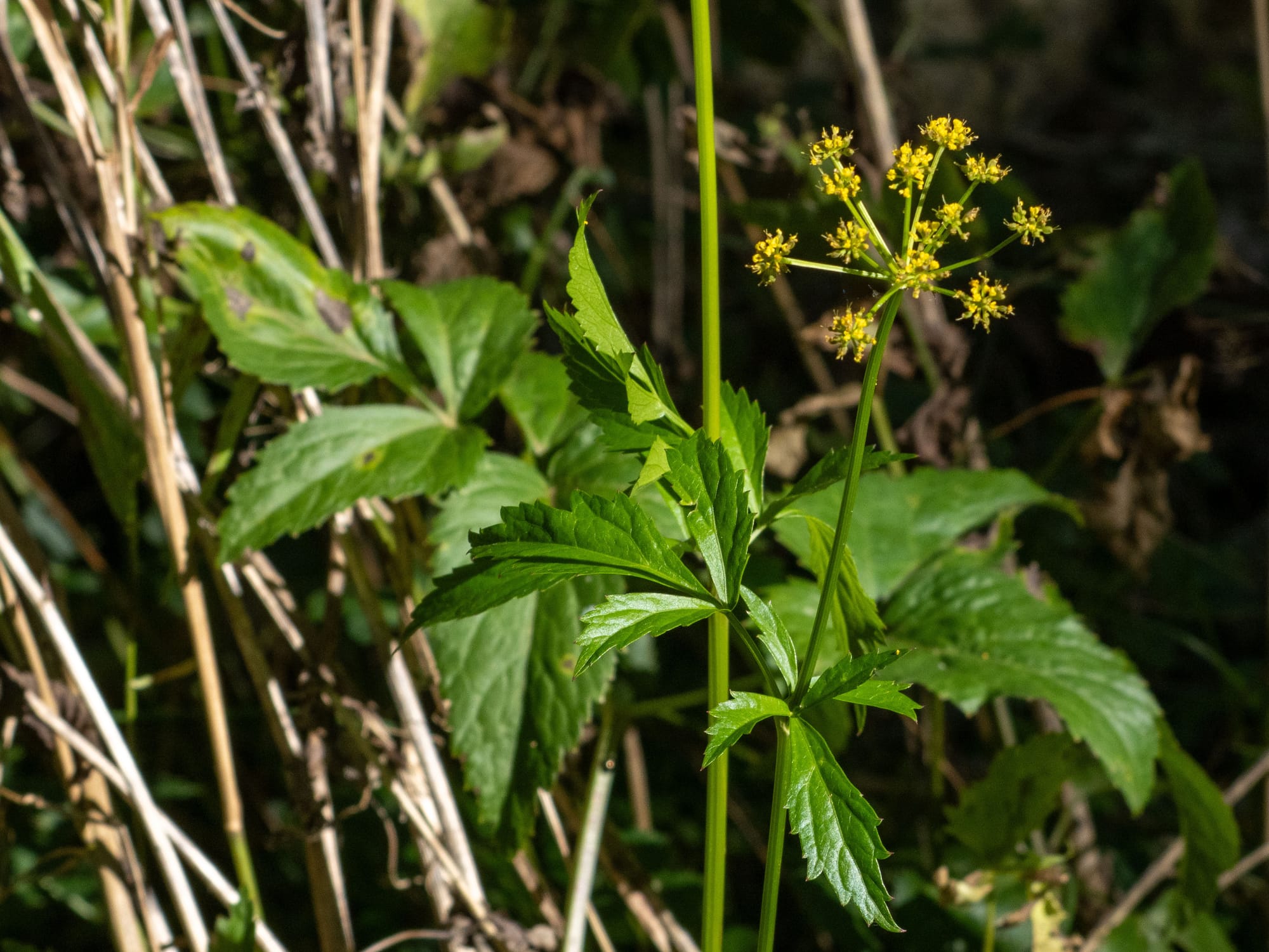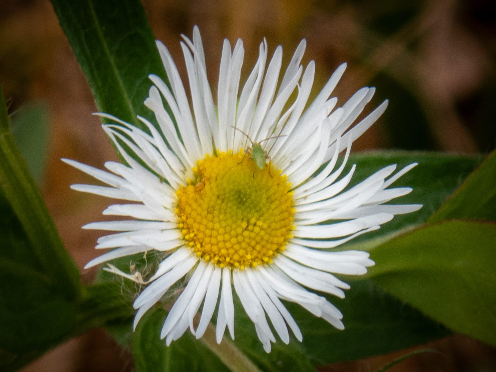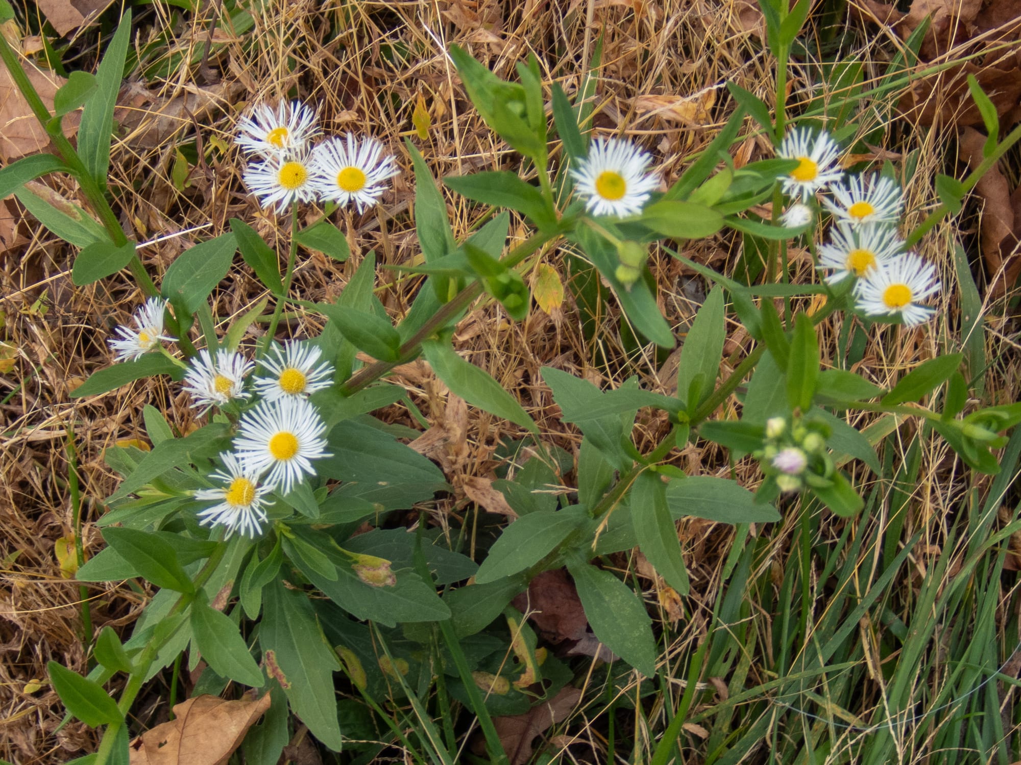 Golden Alexanders, Obedient Plant, Shingle Oak Acorn, Annual Fleabane, and a Fleabane flower with a Broken-backed Bug.