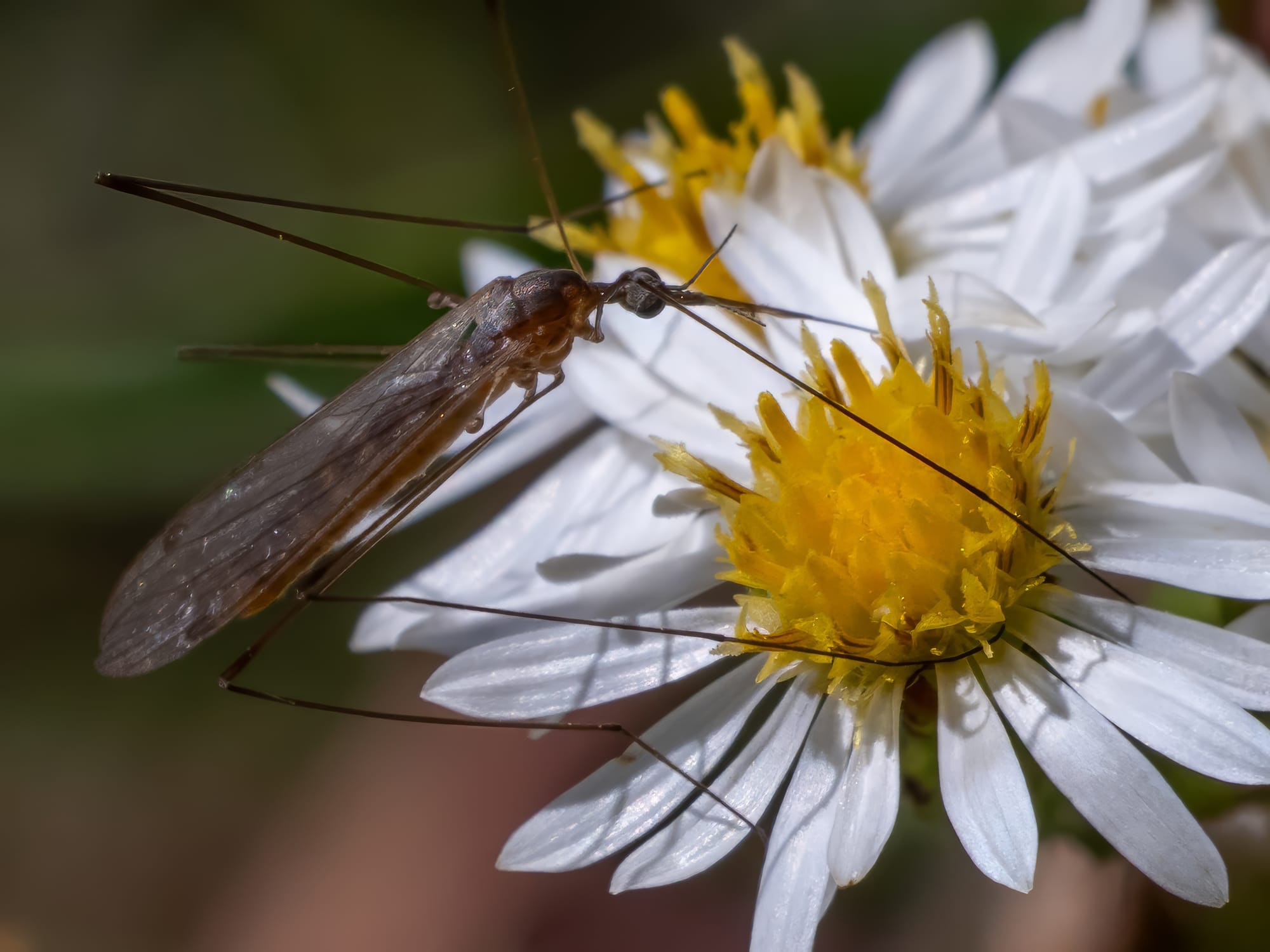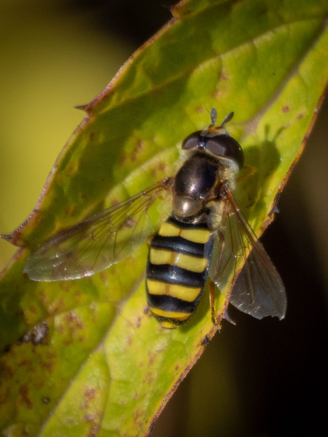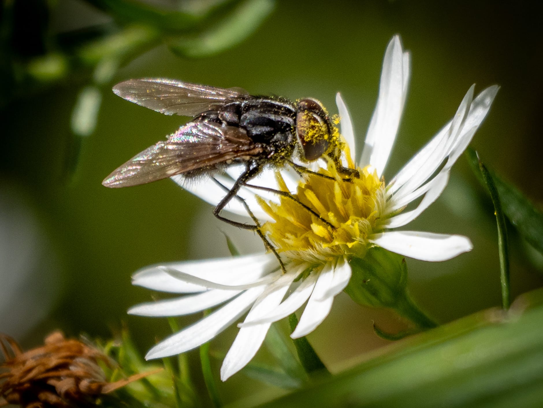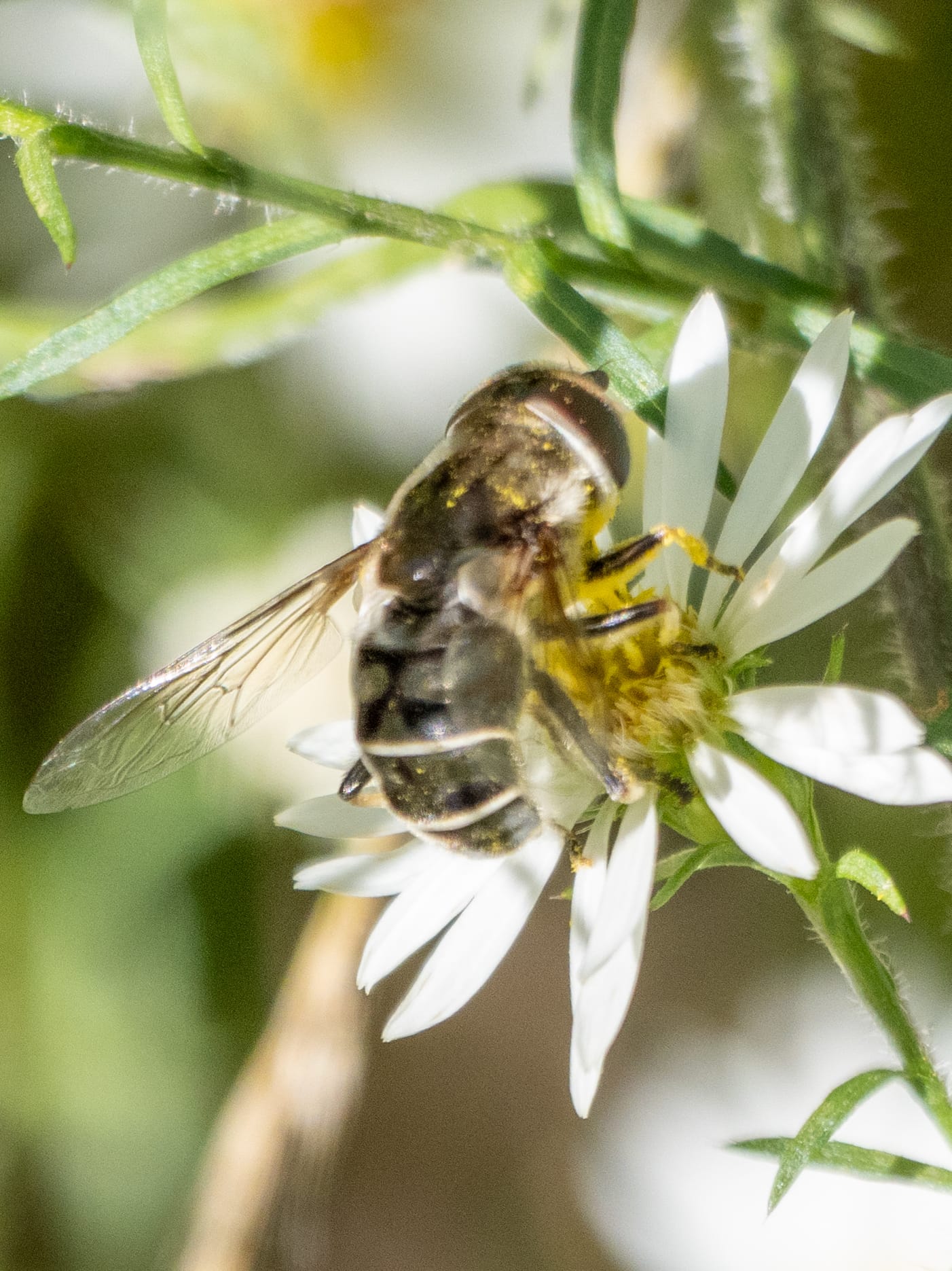 Flies are important, varied, and abundant pollinators. It can be very difficult to identify them to species without caoturinng and killing them, so I will be satisfied with more general names. The first is a Black-shouldered Drone Fly, then a Tachinid Fly, an Aphideater, and finally a Limoniid Crane Fly.