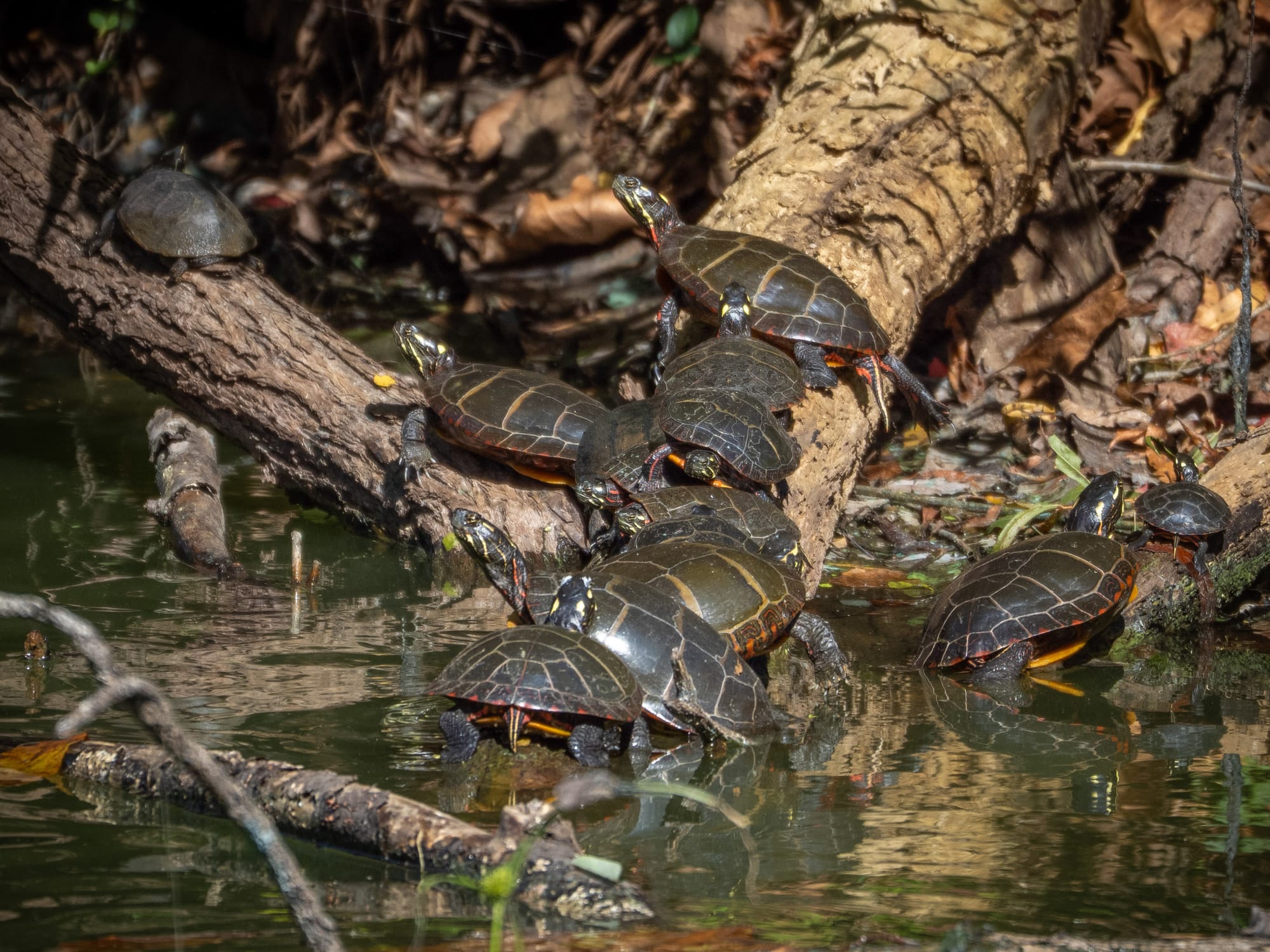 The climbing Eastern Musk Turtle, a crowd of basking Eastern Painted Turtles (extra credit of you can spot the lone Eastern Musk turtle), Pickerel Frog