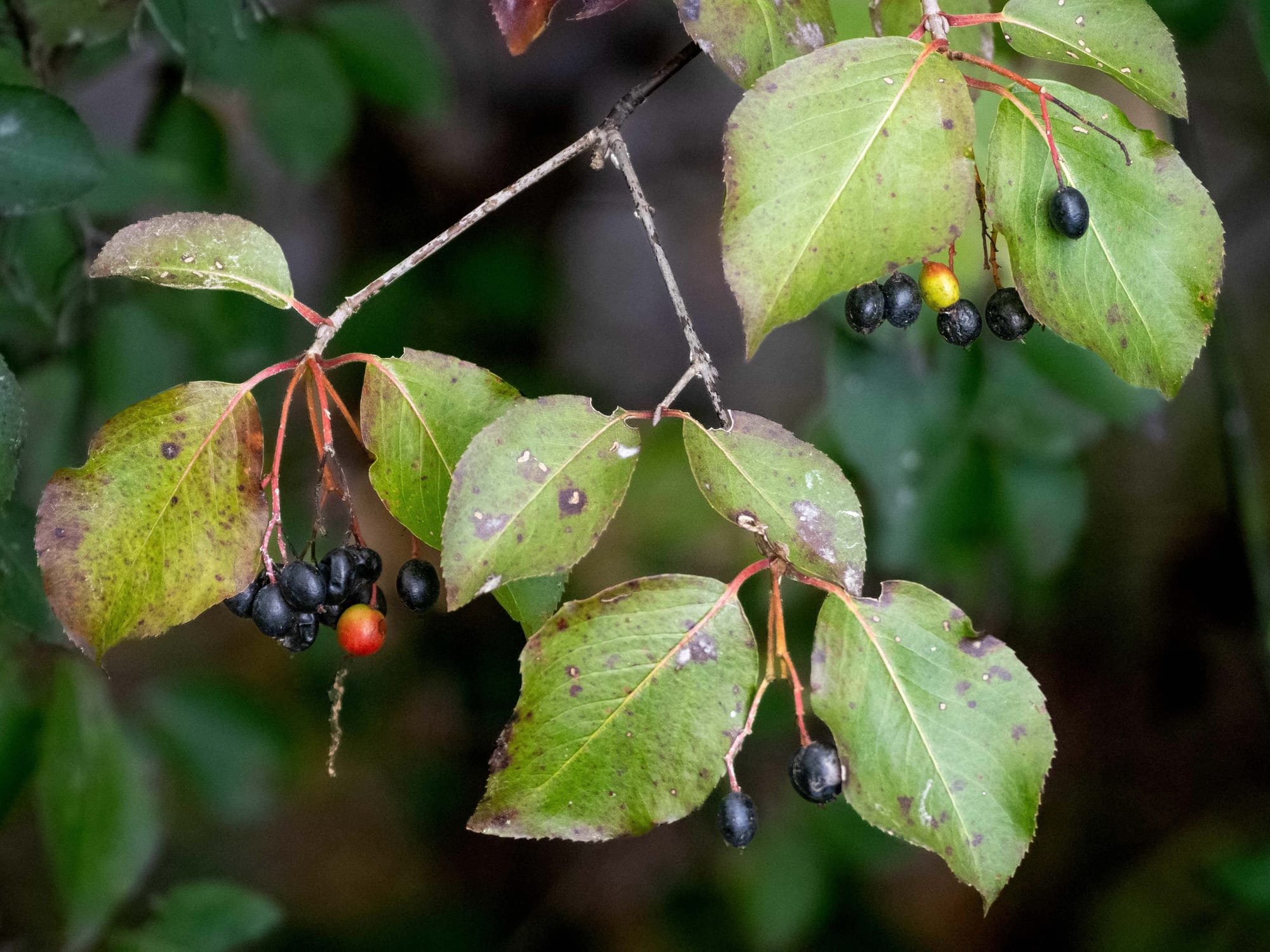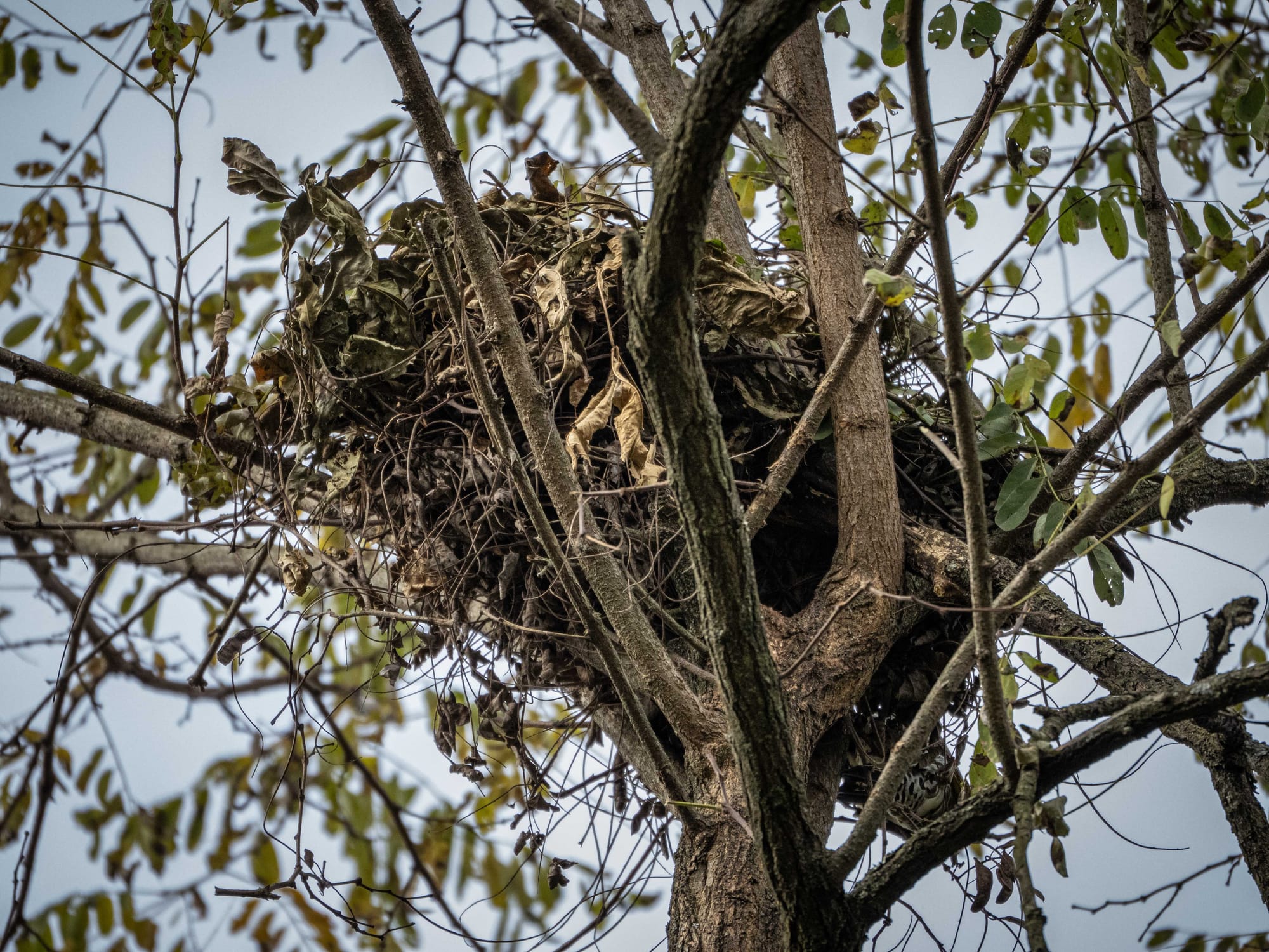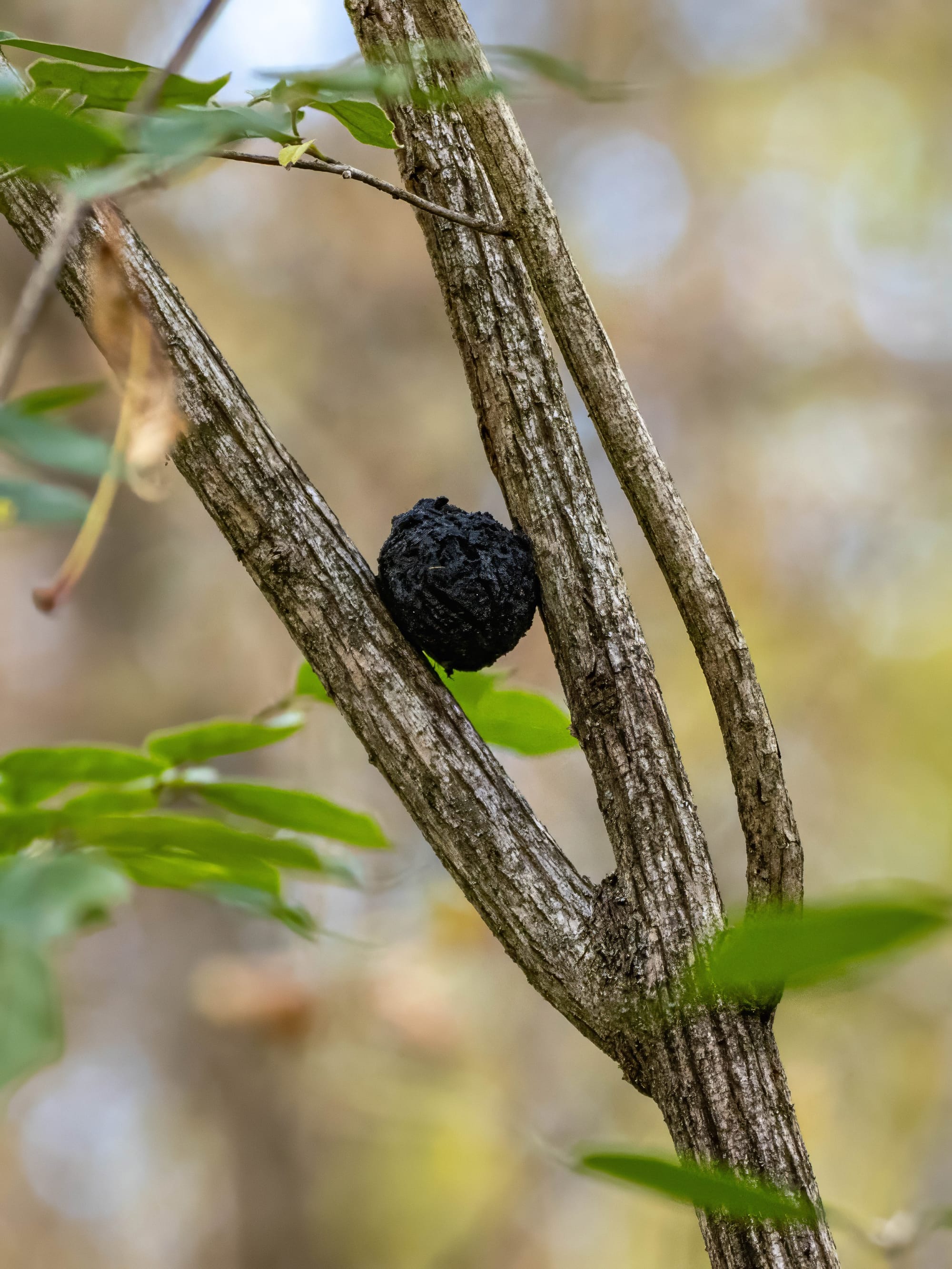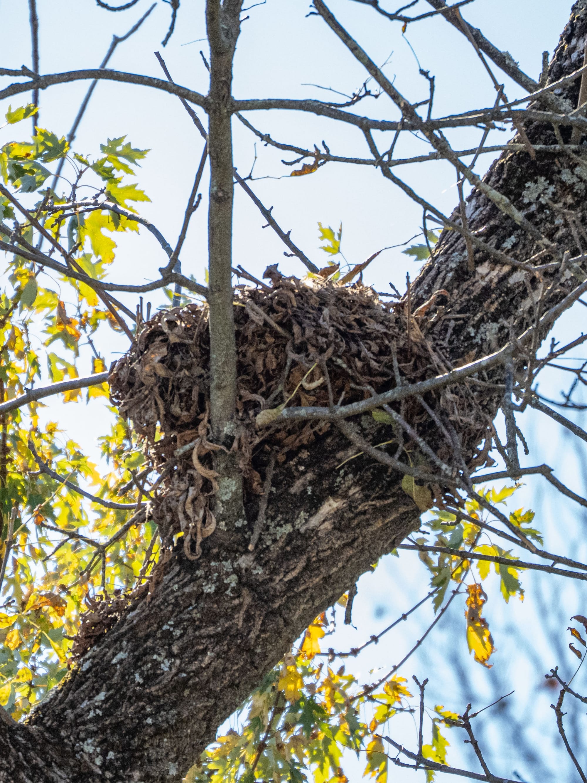 Speaking of squirrels and black walnuts, this is the first black walnut I've spotted this fall that was stashed in the branches of an Amur honeysuckle by a Gray Squirrel (several were spotted last year). I've also noticed some newer-looking Gray Squirrel drays (or nests)