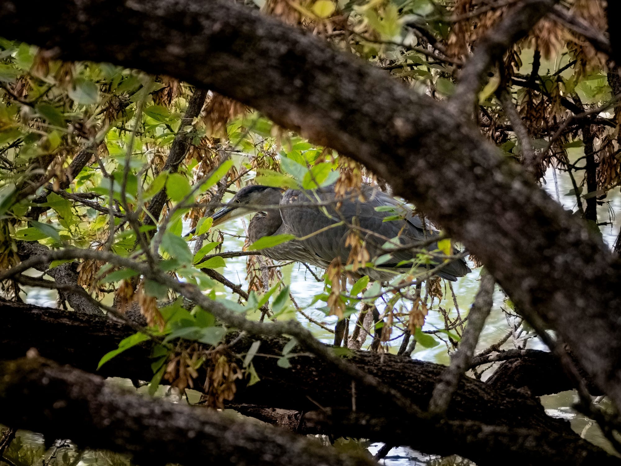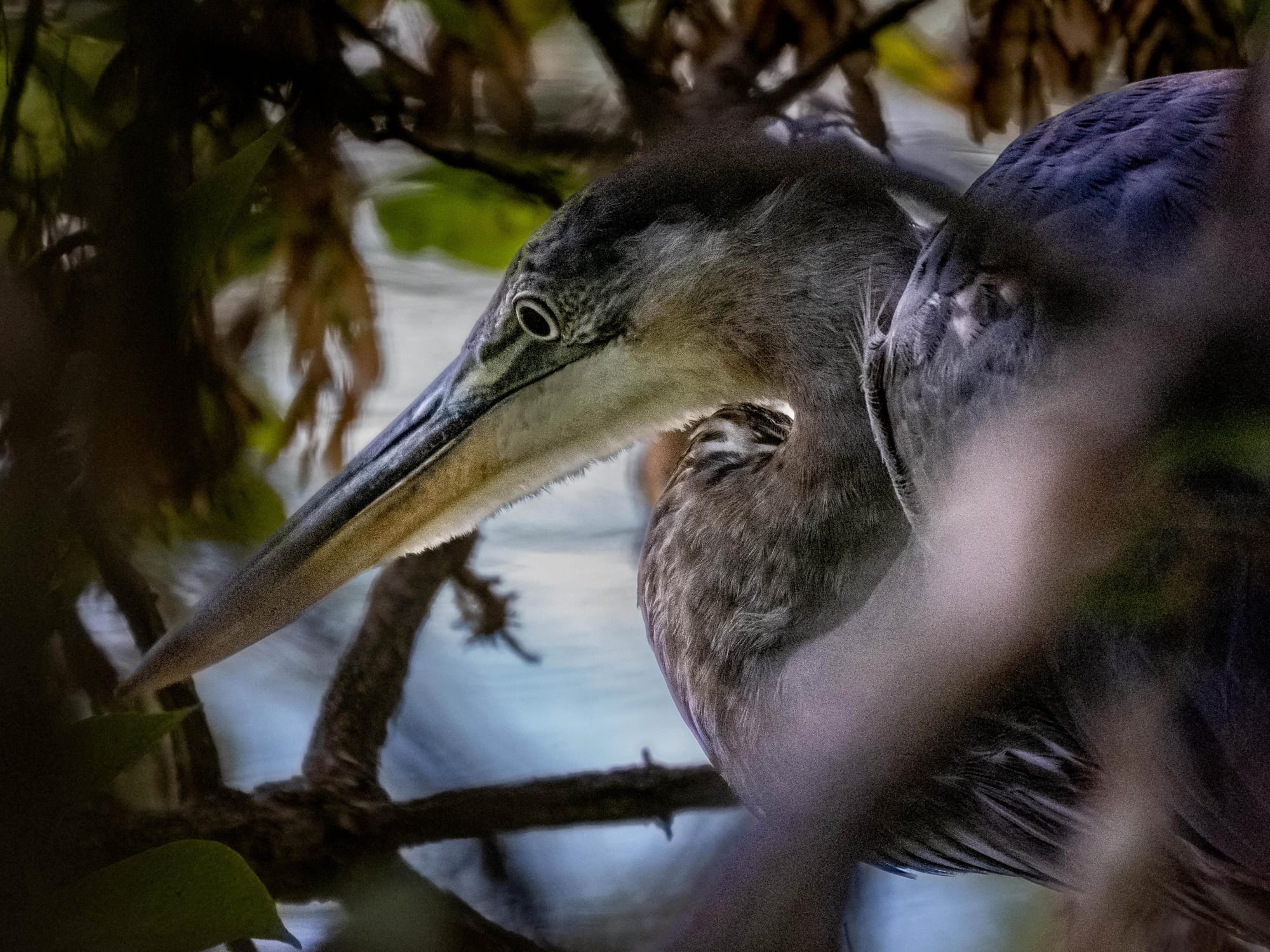 The Great blue Heron, a picture of concentration hunting in the box elder tree that overhangs the small pond.