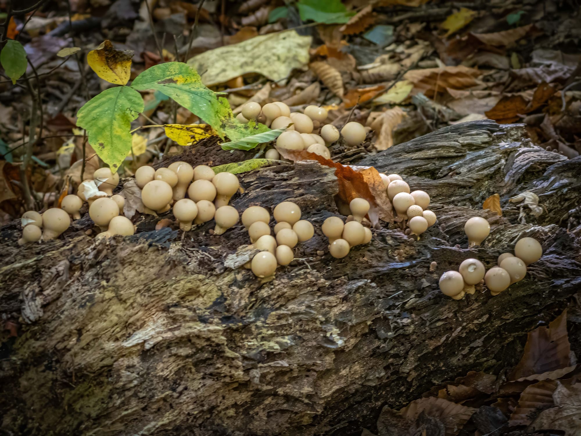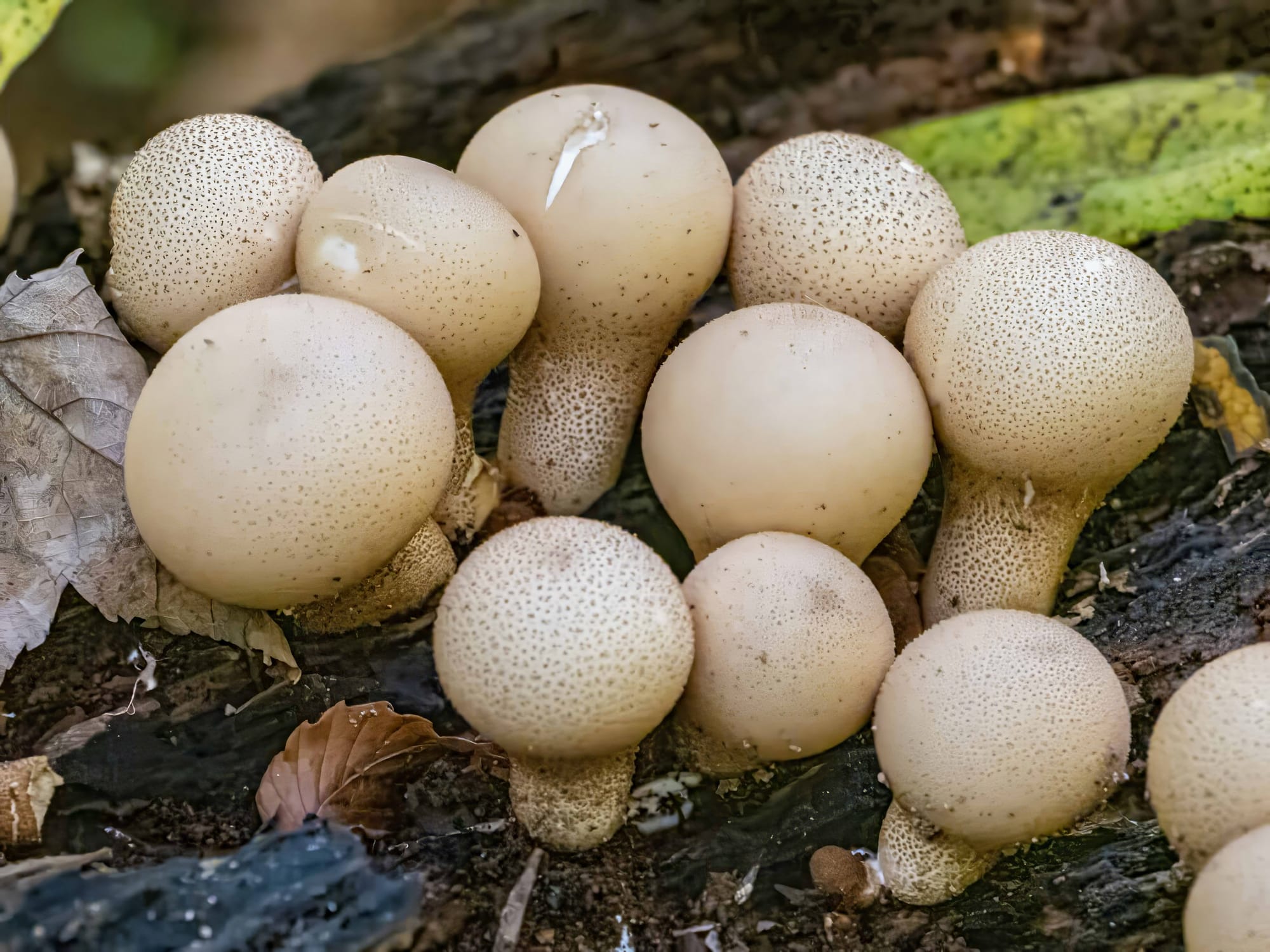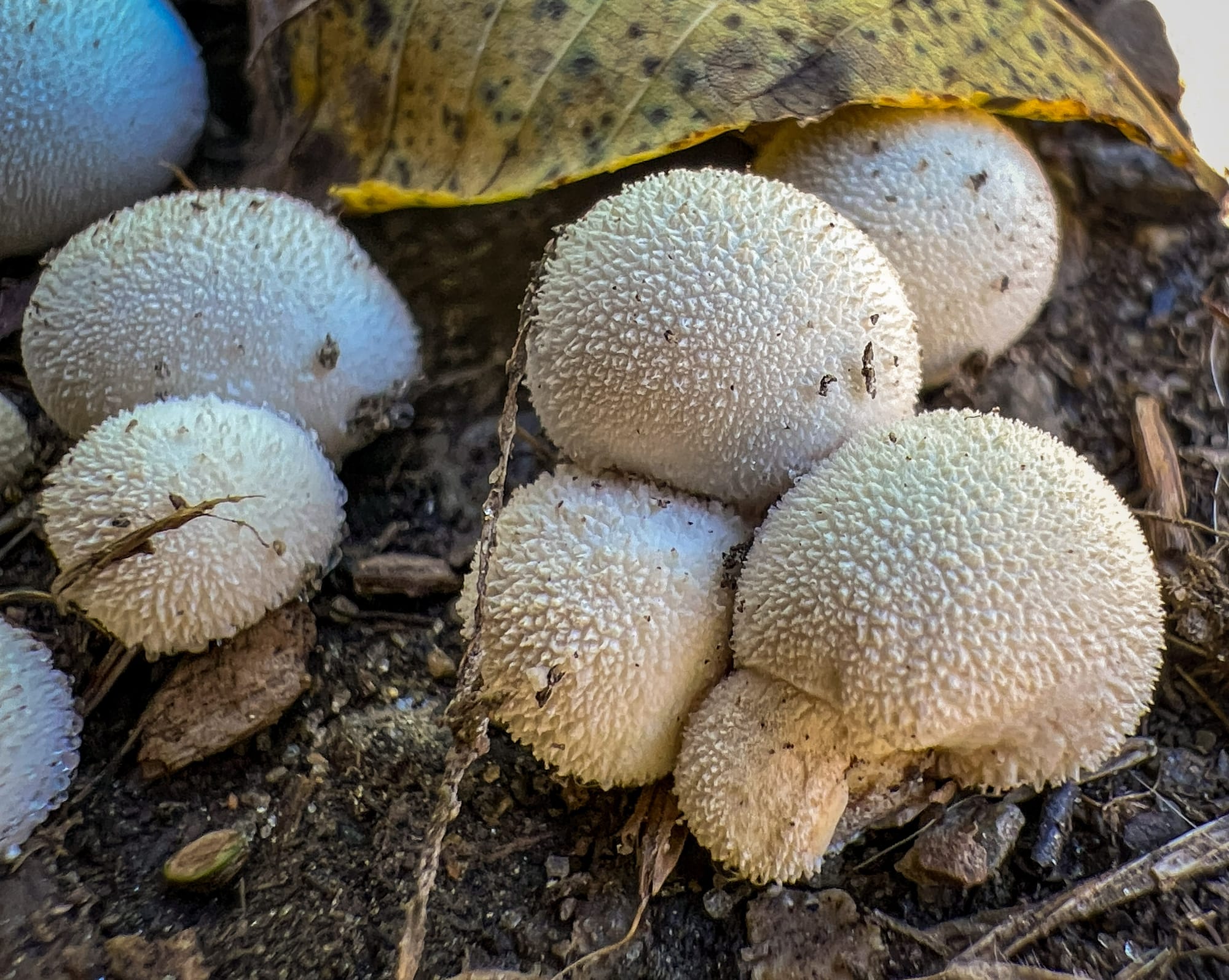 Pear Shaped Puffballs, and a closer look, Lions Mane, Common Puffball.