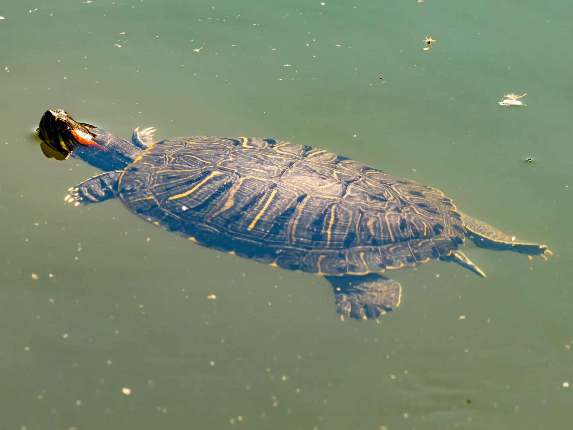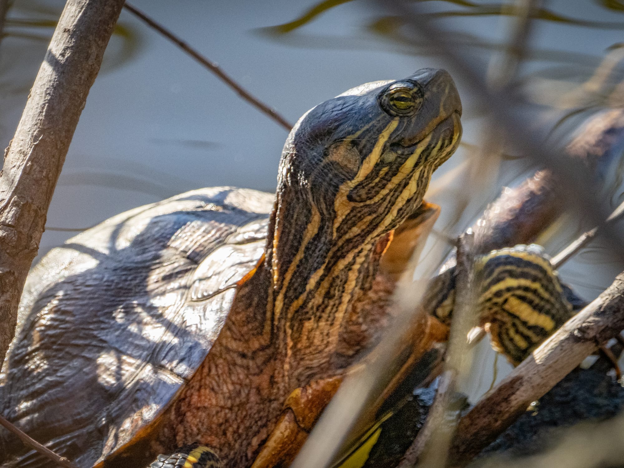 Pond and Red-eared Sliders, like most turtles, have a dense horizontal band of photoreceptor cells in their retinas adapted to viewing the horizon for predators. They are quick to flee when they sense movement, so approach basking turtles slowly. Try to make no sudden movements, and carry a pair of binoculars. If you are careful you can sort out exactly which kind of turtle you are looking at before they drop into the water. Older, larger, turtles tend to be less jumpy then the smaller ones.