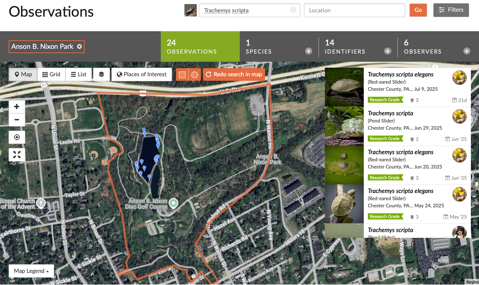 Pond sliders, Trachemys scripta, and subspecies the Red-eared slider, Trachemys scripta elegans are frequently seen basking on logs at the park. It's not unusual to see them crowding into every available inch of a good basking spot.