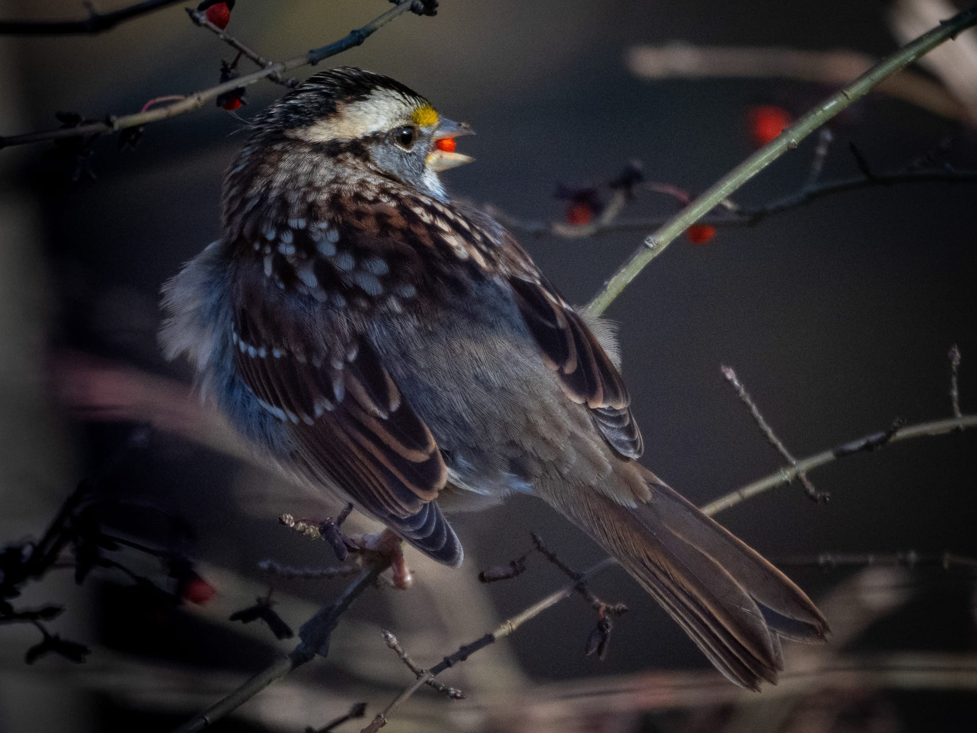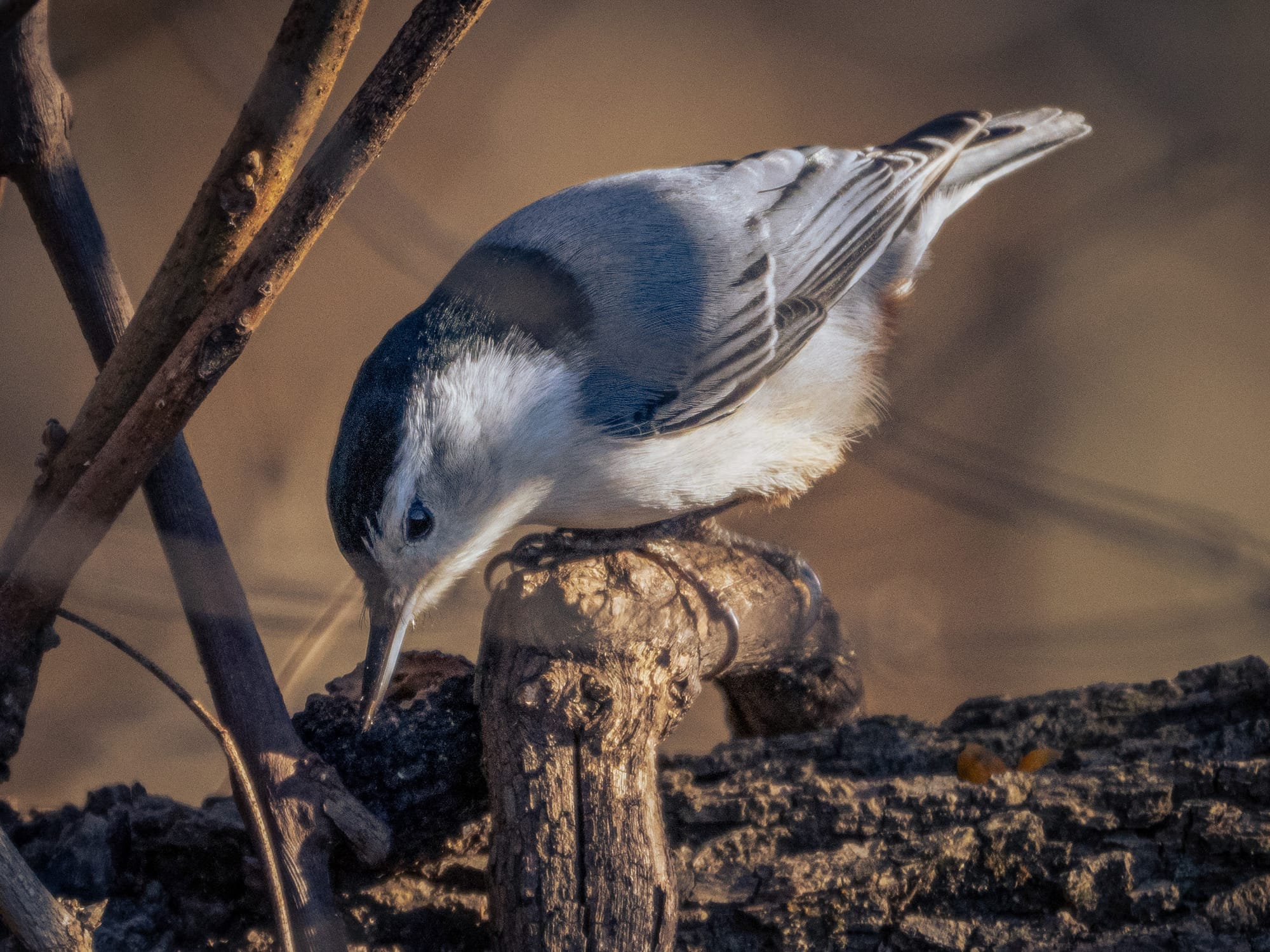 Carolina Wren, White-Breasted Nuthatch cleaning up leftover nutmeat dust from a black walnut the squirrels were finished with. White-throated Sparrow. This Winter Wren was a bit shy but I was able to get a recognizable photo, Downy Woodpecker working away on a beech tree.