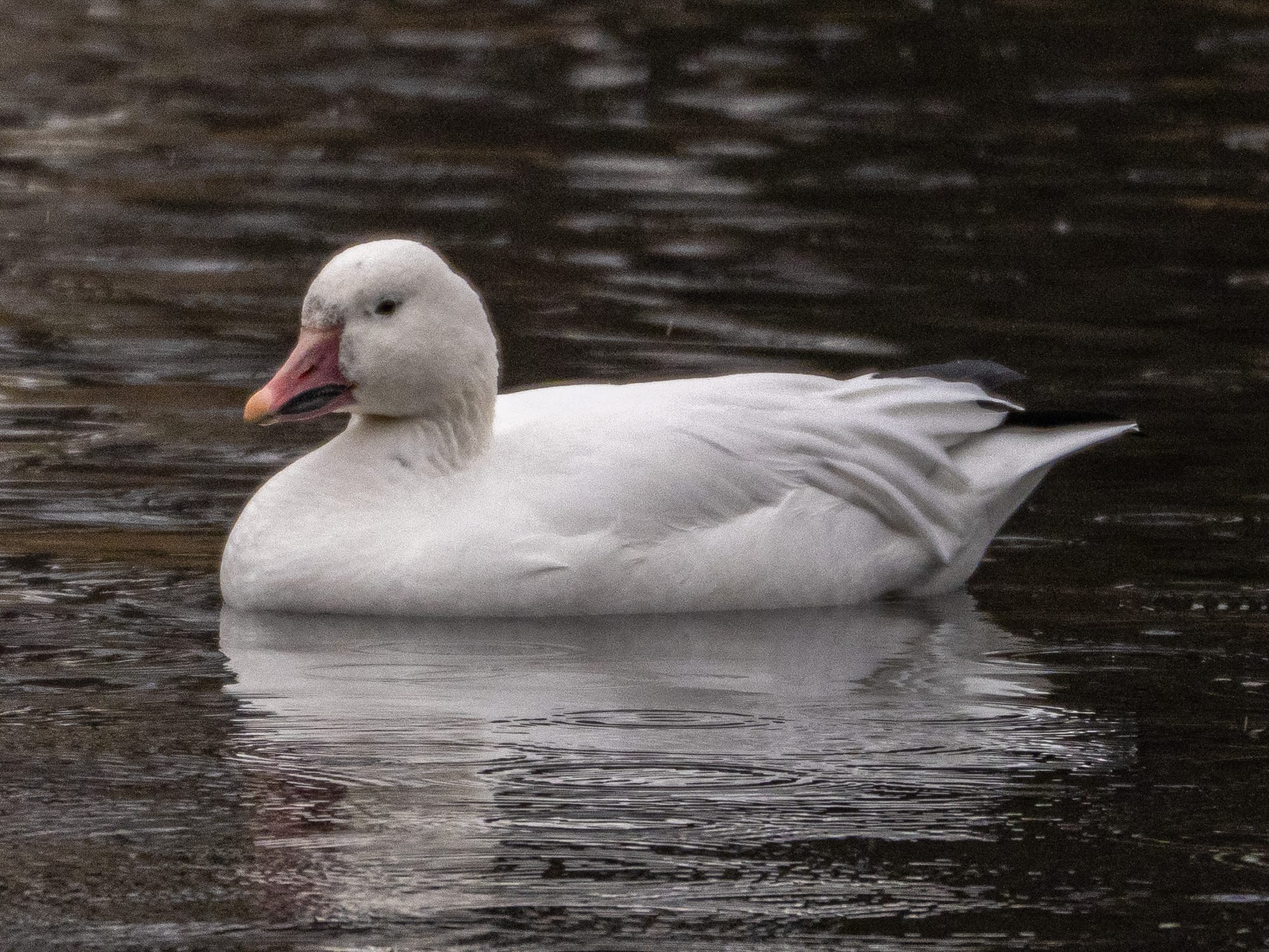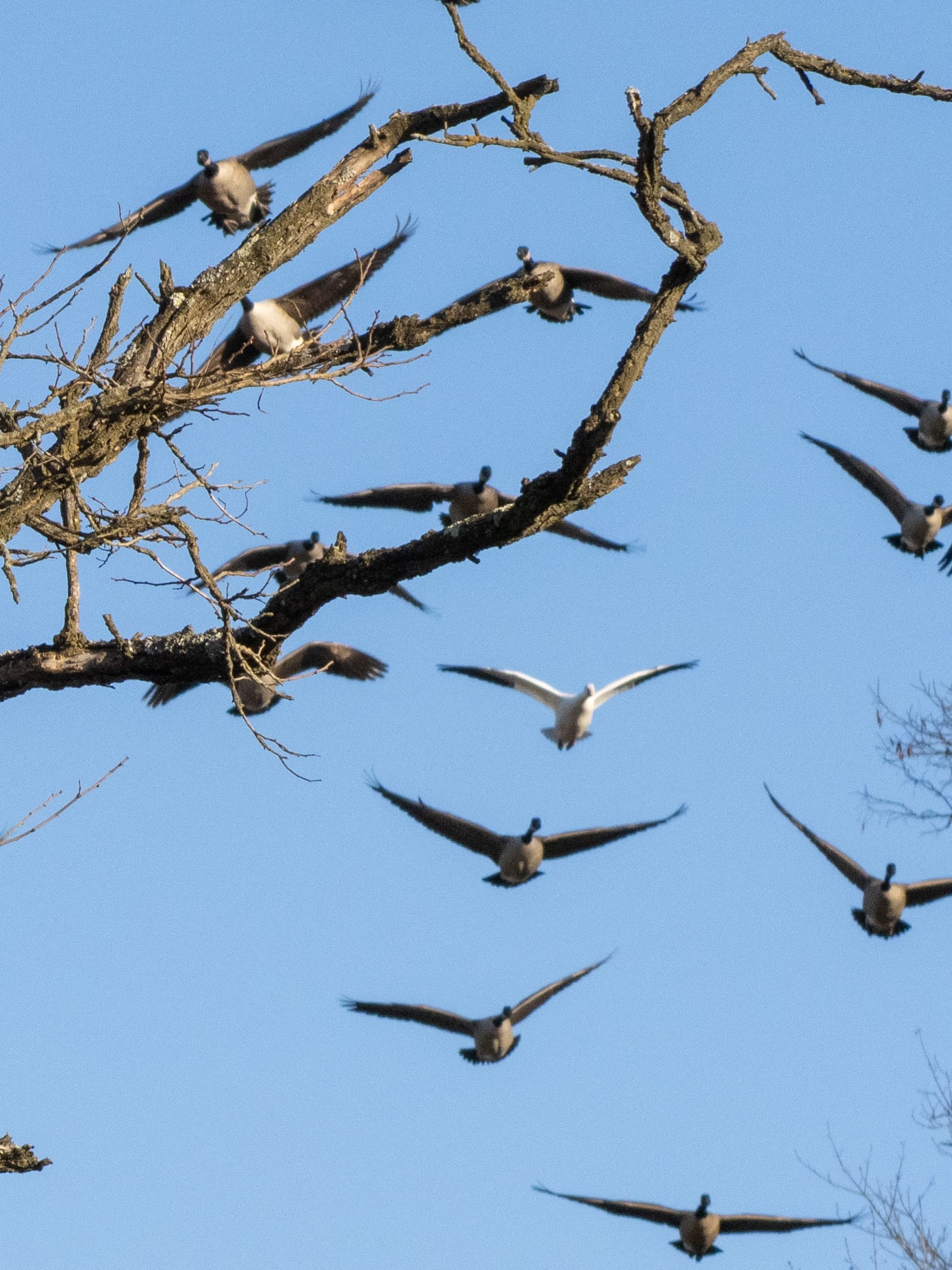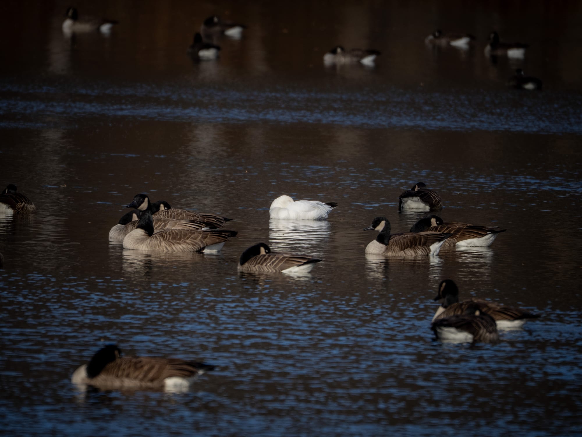 This single Snow Goose has been mixed into the Canada Goose flock for a few weeks now. It's not uncommon for geese to get disoriented or somehow separated from their flocks durinng migration. This one may be around all winter and join back up with a Snow Goose flock during spring migration.