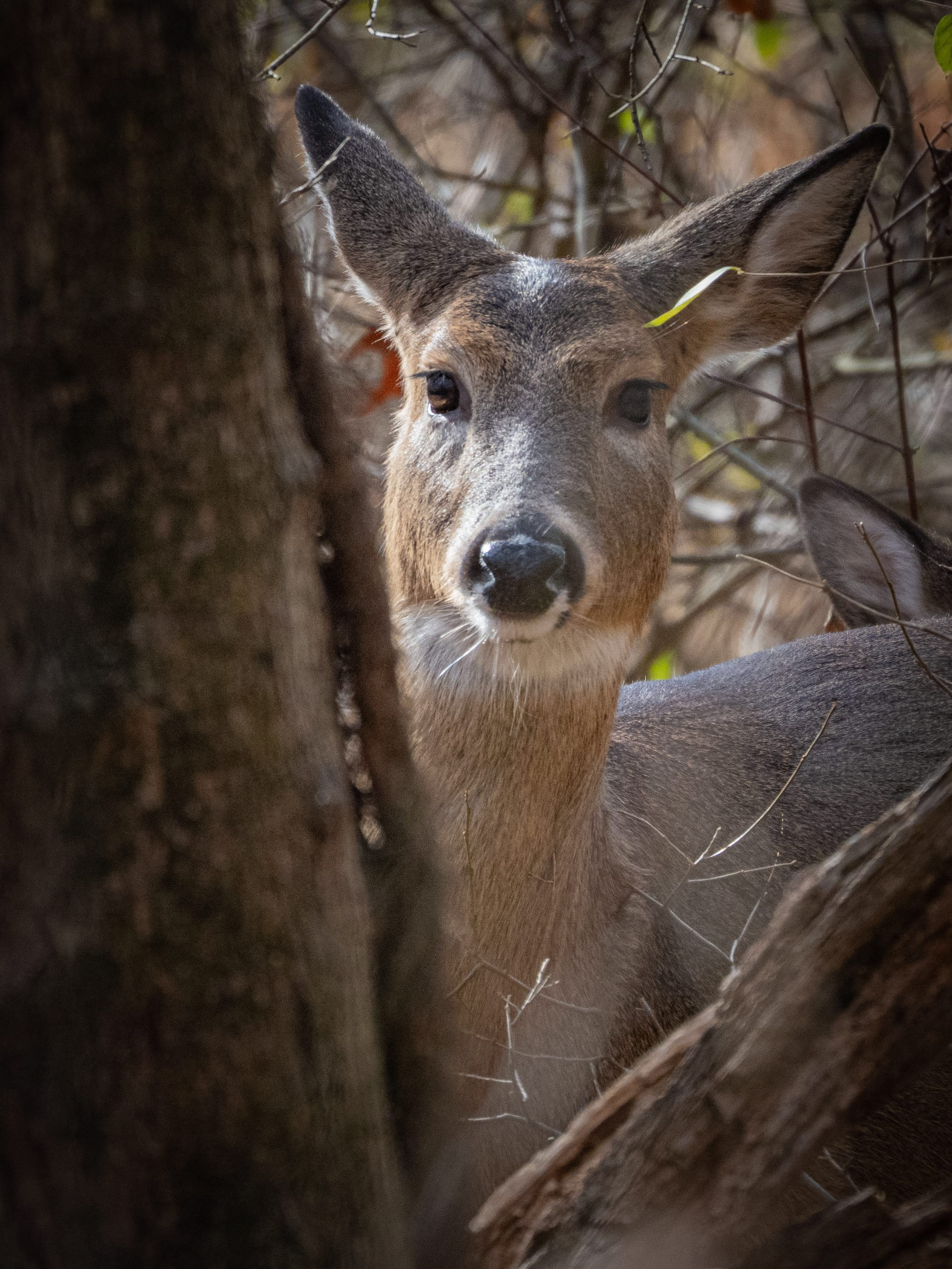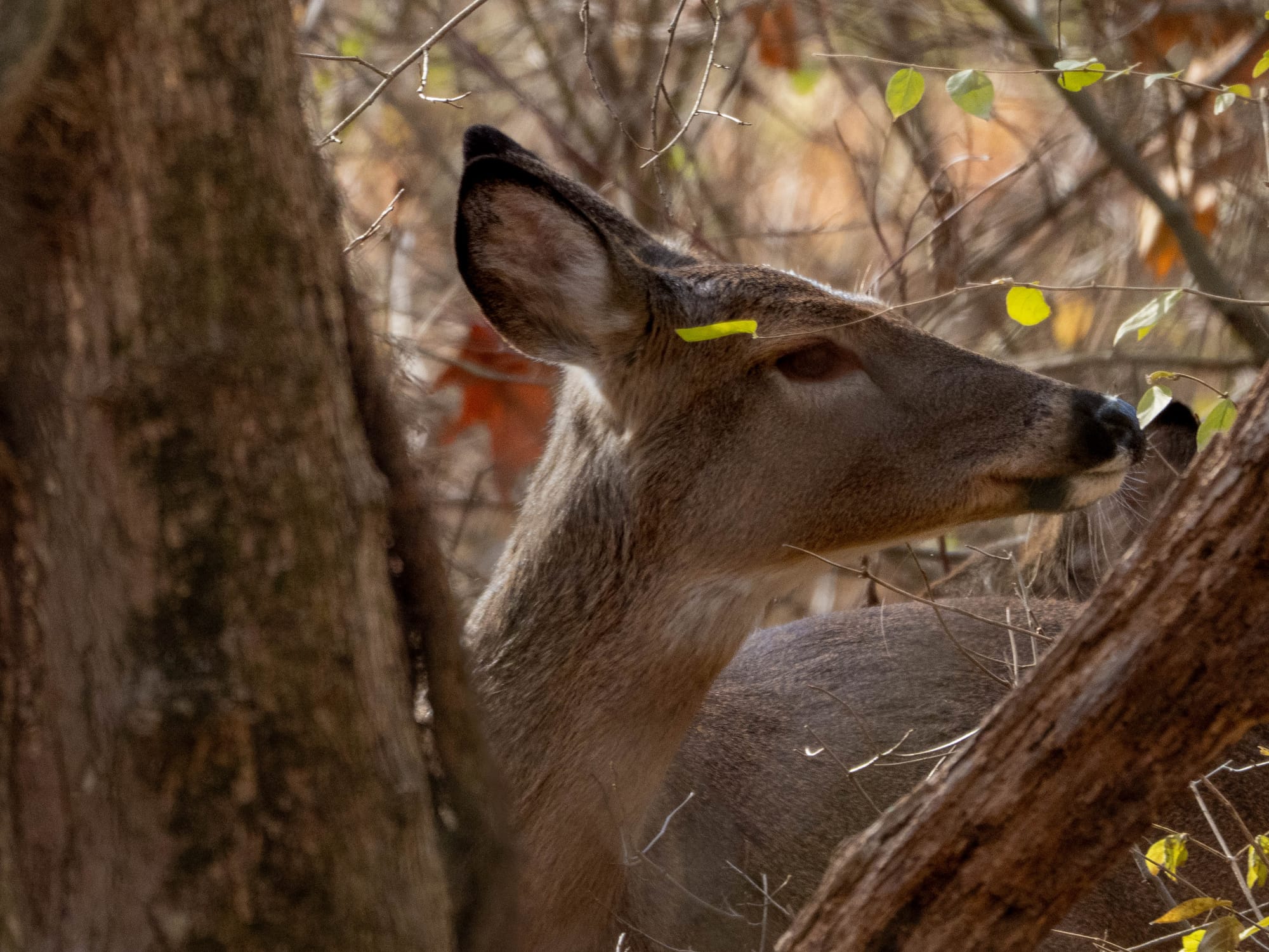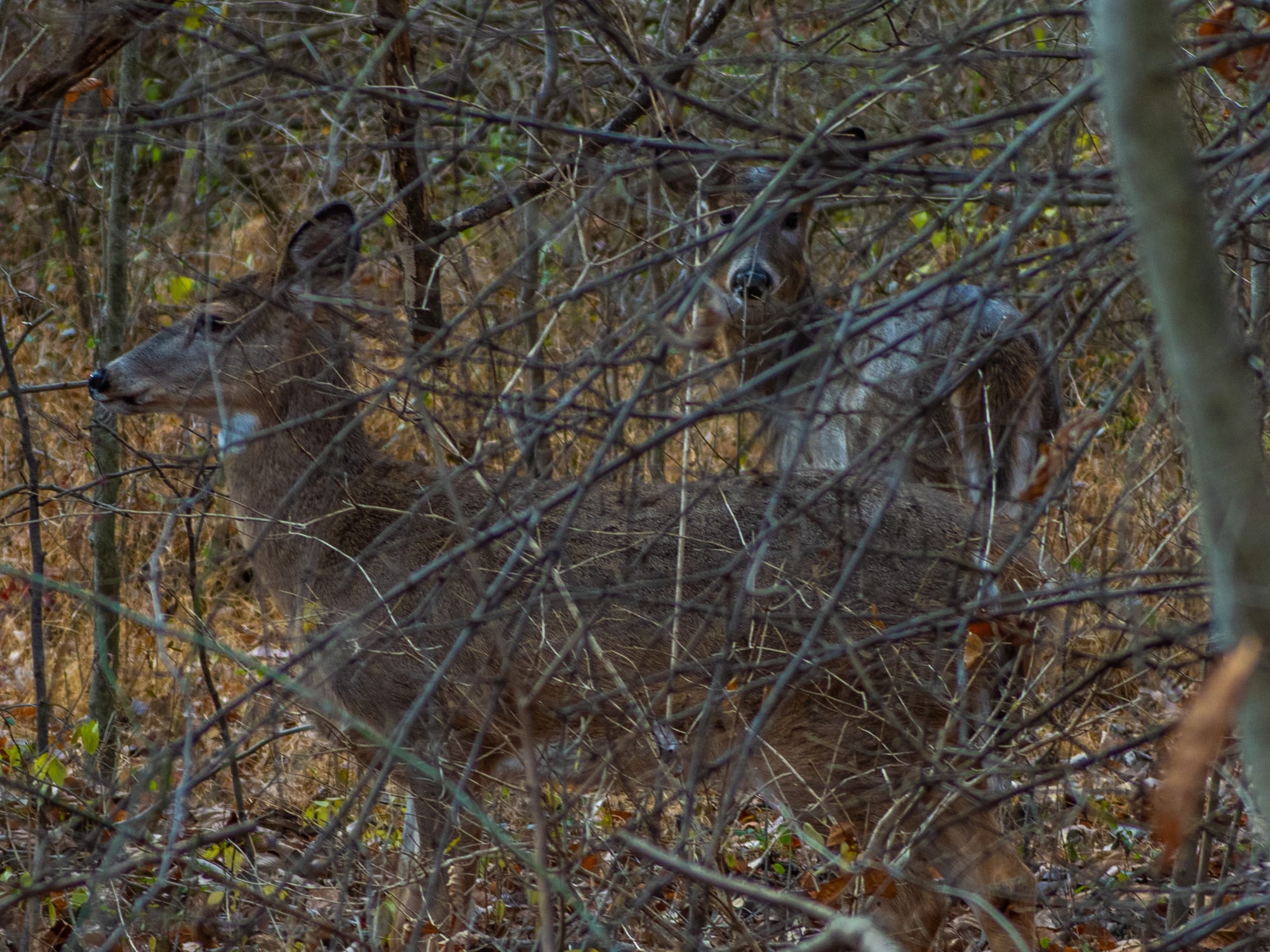 One recent mid-morning a group of White-tailed Deer came bounding through the forest and over the trail ahead of me. It was unusual to see them so late in the day. Although hey were traveling at quite a clip they were nearly silent, and nearly invisible had they not their tail-flags been flying. It is remarkable how thoroughly they blend into the forest.
