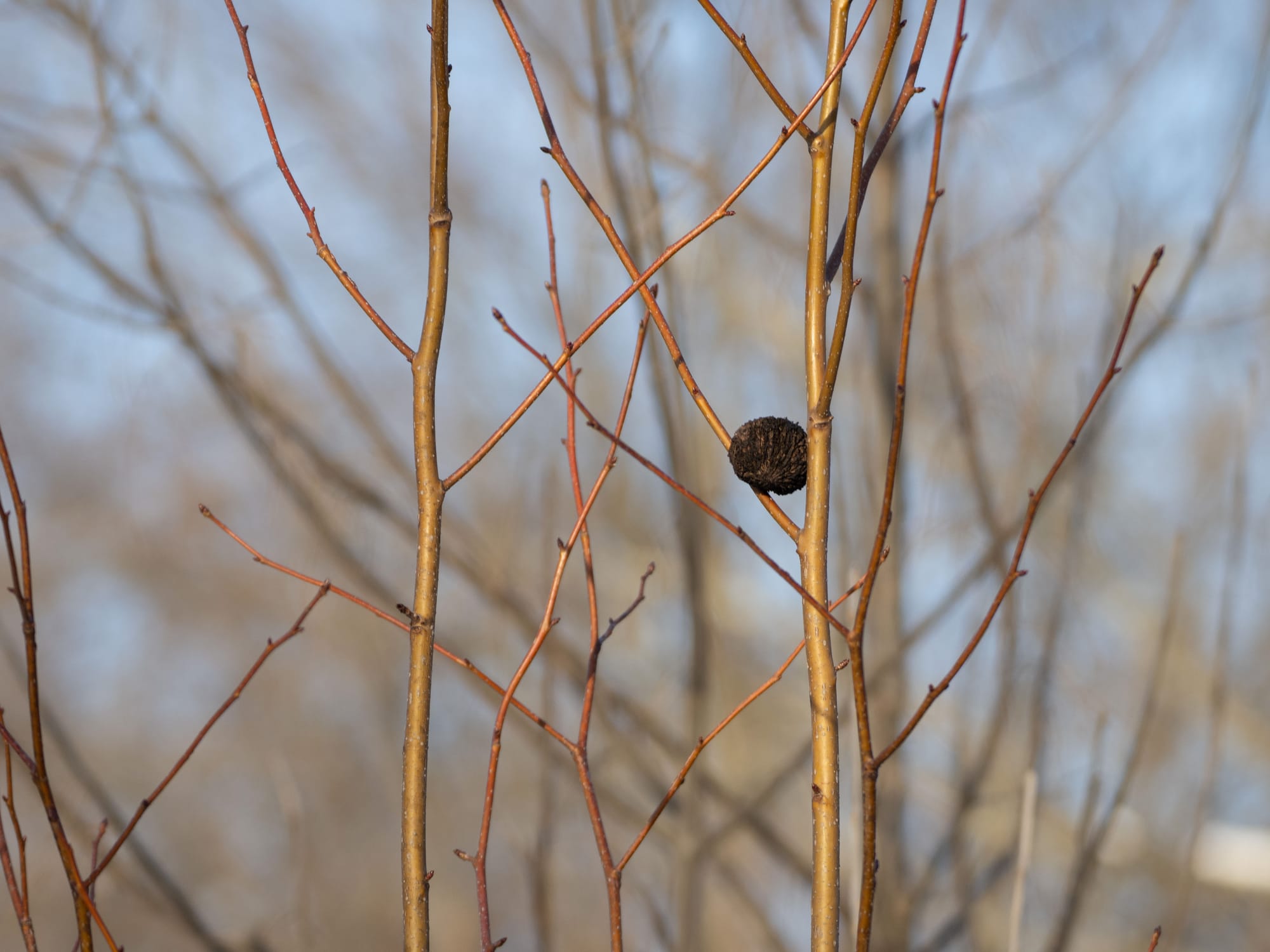 With the winter solstice in the rear-view mirror daylight hours slowly increase as the earth tilts towards the spring equinox in March. It's quieter, in some ways, at the park, but the winter choruses are in full voice; Canada Geese honk impatiently as they rise from the pond or sweep down out of the sky, bird alliances chatter away, Red Bellied and Pileated woodpecker calls echo through the woods, Red Squirrels bark and trill at the intruding Grey Squirrels raiding their larders, and both gnaw loudly on this year's bumper crop of black walnuts.