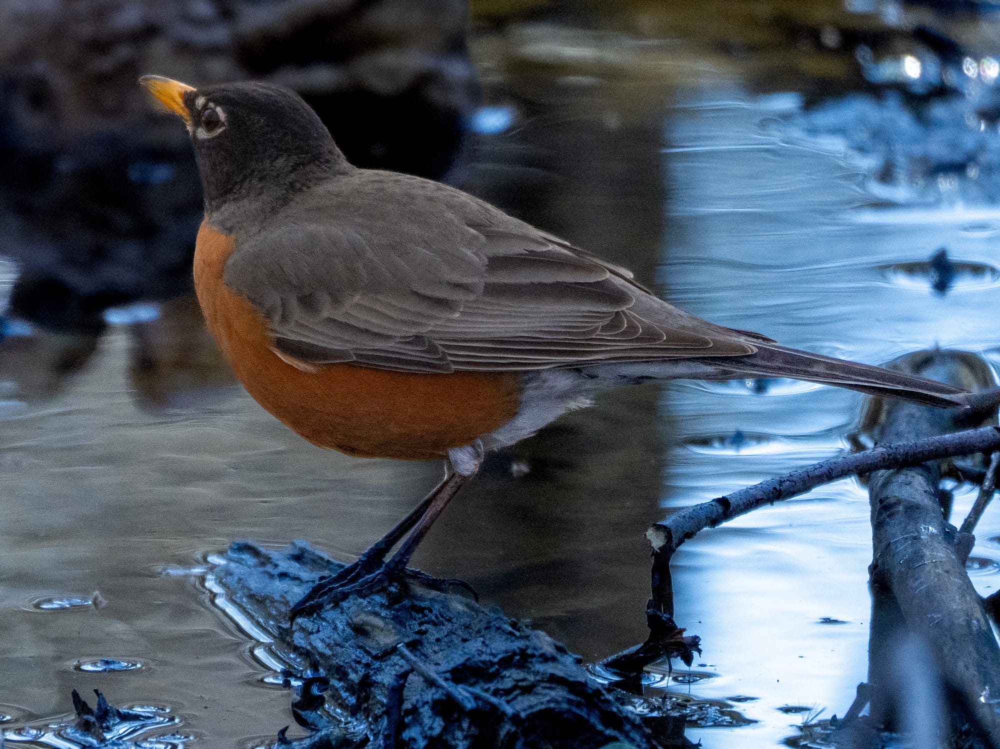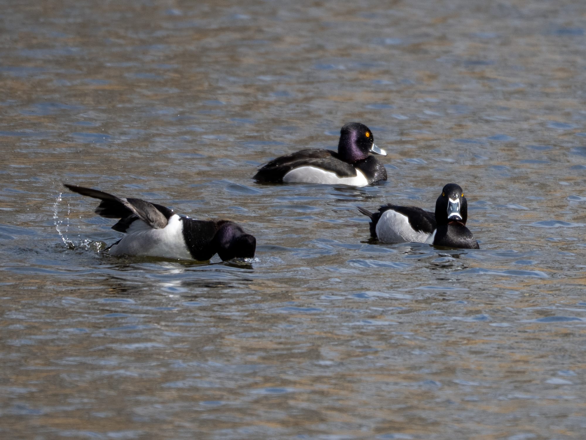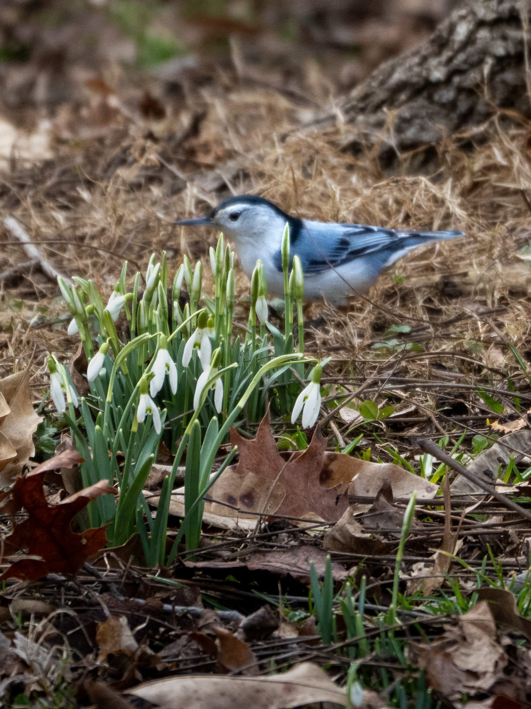 Bluebird, a visiting group of Ring-Necked Ducks, A nuthatch taking in the snowdrops, another Bluebird on the lookout for this year's nesting spot, White-throated Sparrow and Dark Eyed Junco preparing to move to their summer breeding grounds up north, Robin