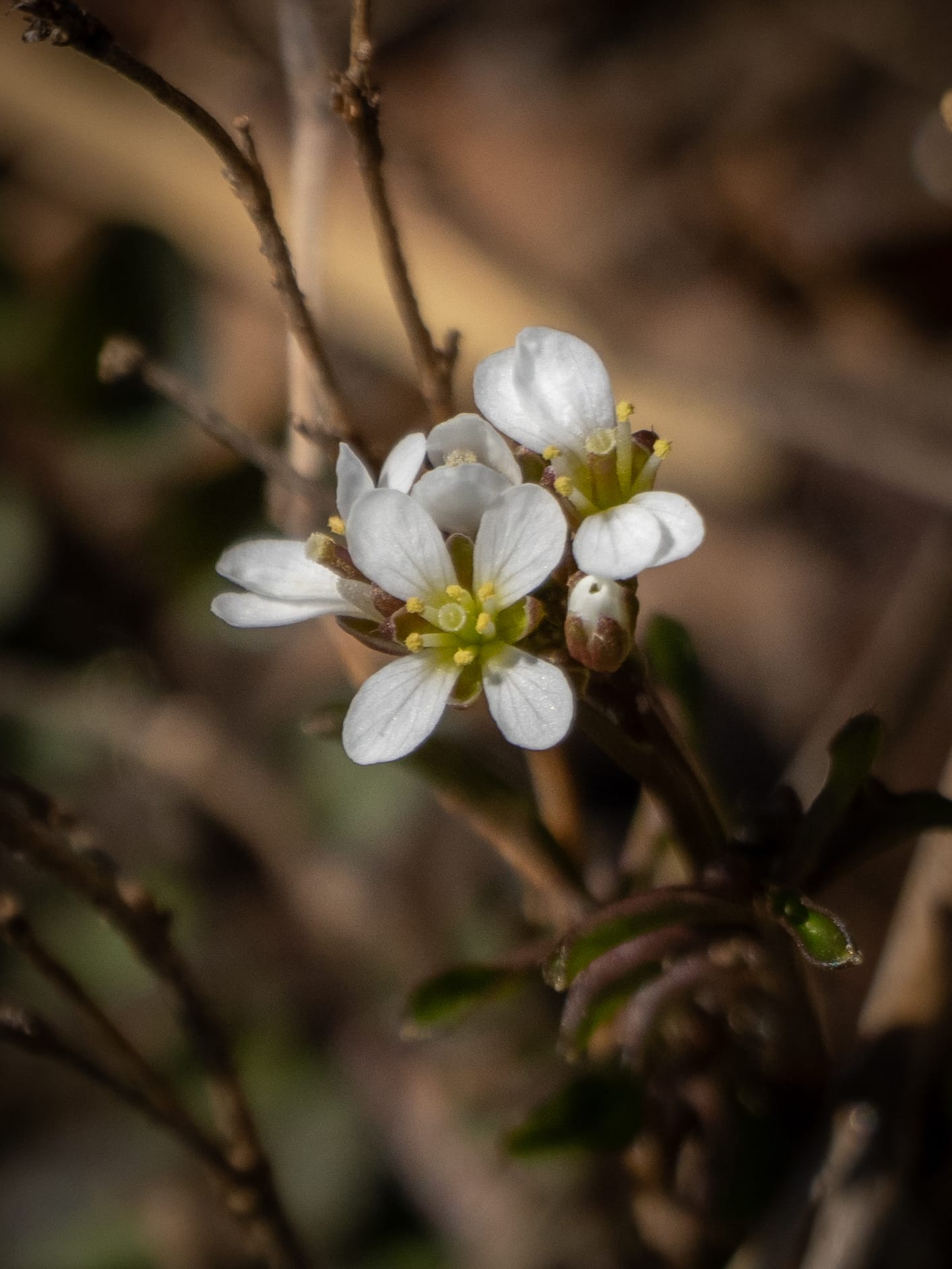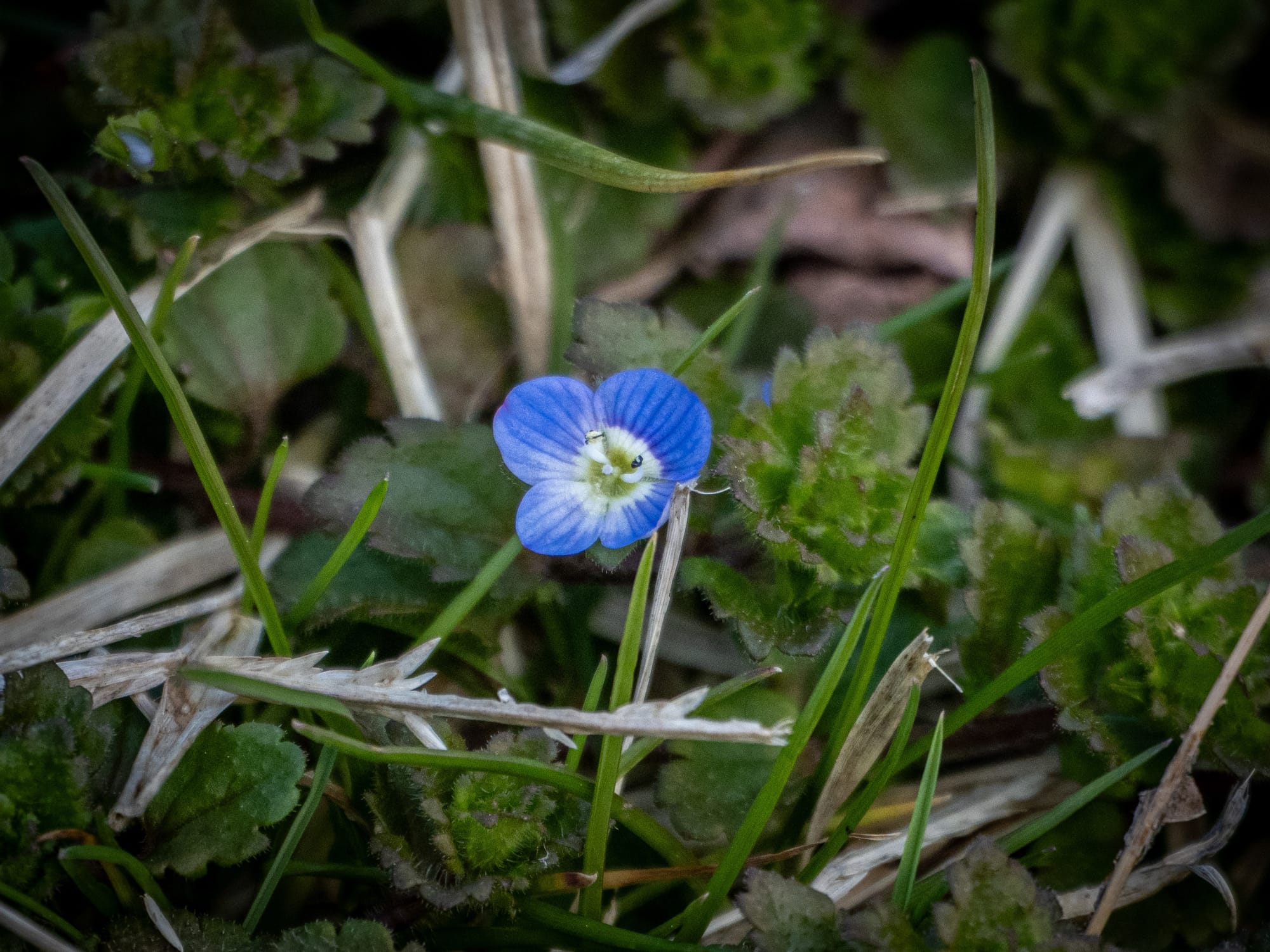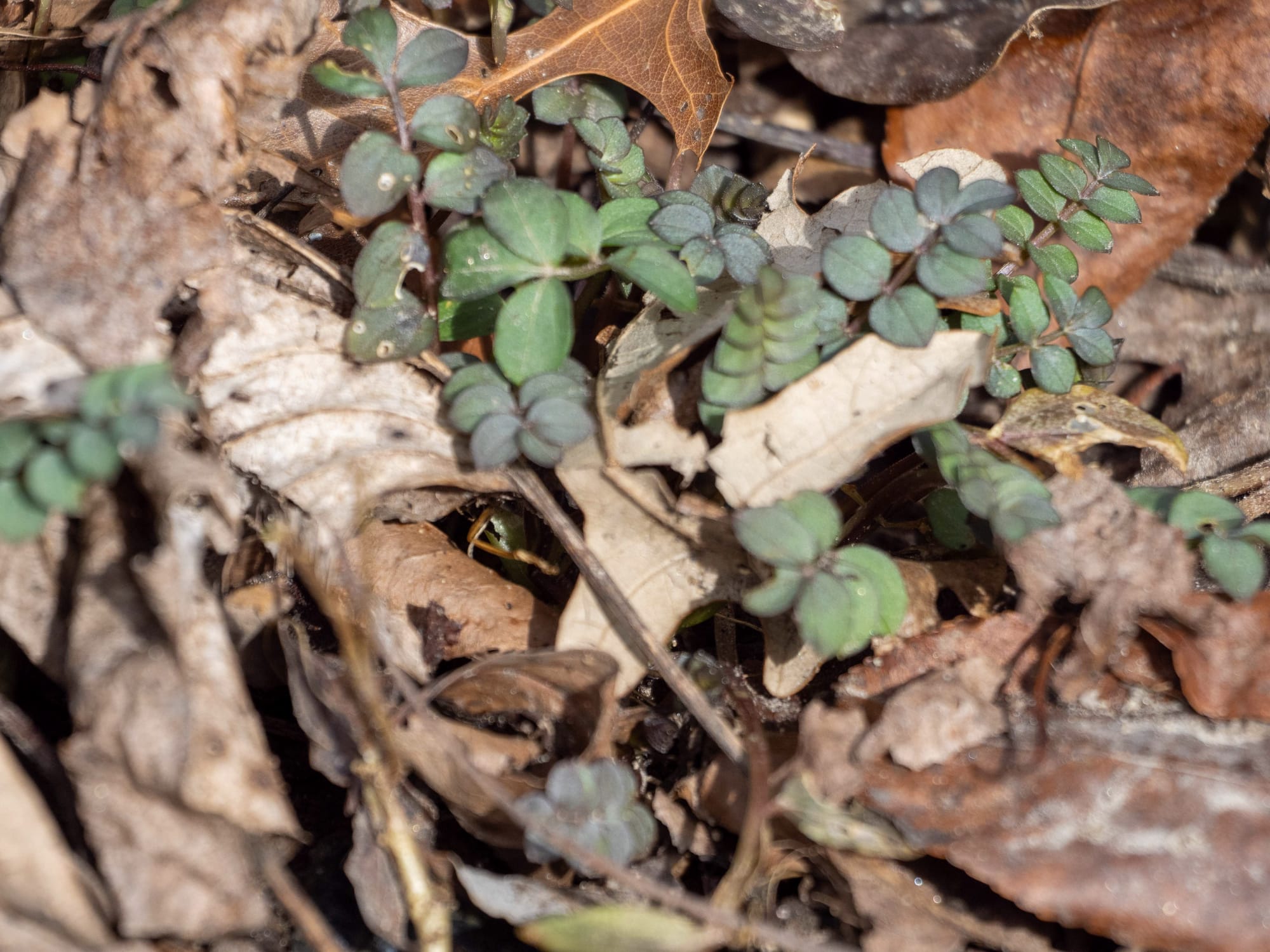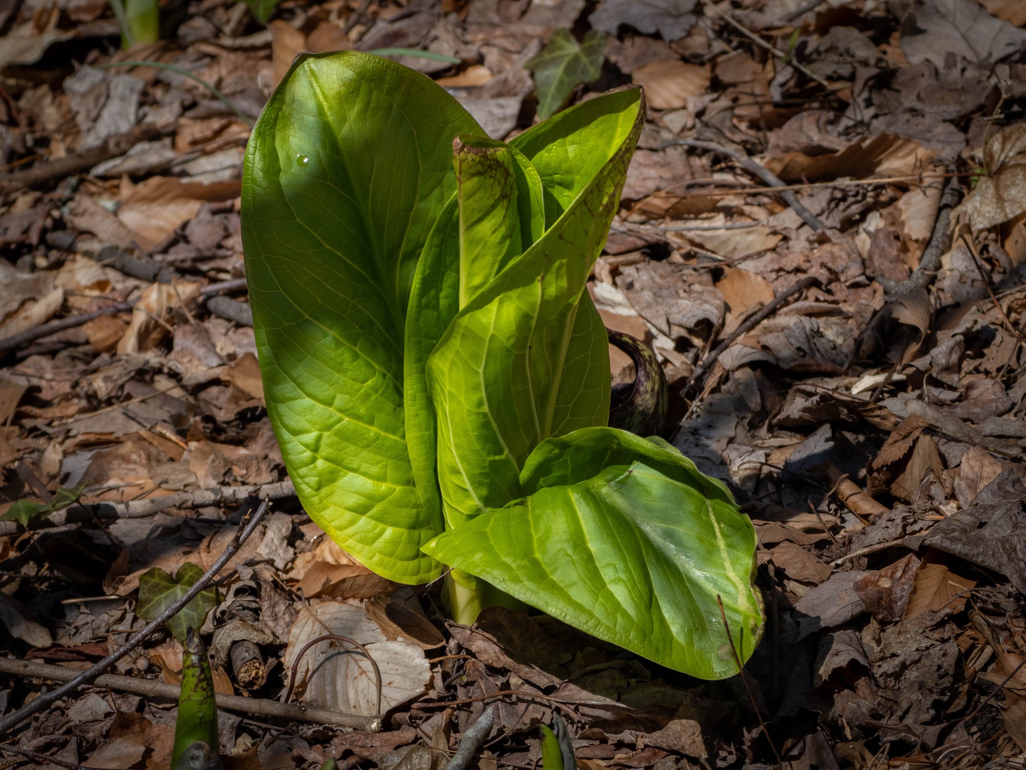 Jacob's Ladder peeking out from the leaf litter, Unfurling Skunk Cabbage, Hairy Bittercress, Bird's-eye Speedwell